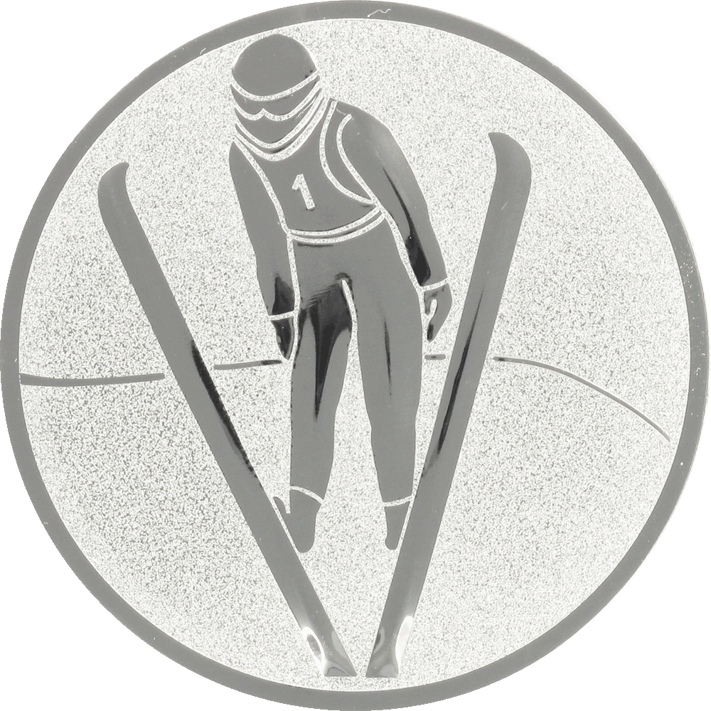 This silver embossed aluminum emblem is designed for ski jumping enthusiasts. Measuring 25mm, it features a dynamic skier in a polished motif against a matte background. Each emblem embodies the athletic achievement in ski jumping.