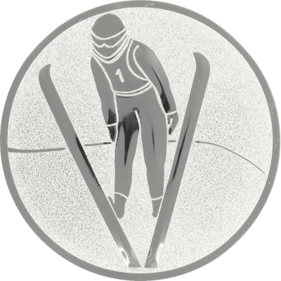 Experience the thrill of ski jumping with this evocative silver embossed aluminum emblem. This 25mm emblem is an elegant way to honor ski jumpers, capturing the essence of their athletic achievements. The center showcases a detailed skier in an aerodynamic pose, complete with helmet and ski suit, polished to stand out against the mattified, lightly glittered background. This creates a striking visual contrast, highlighting the skier prominently.