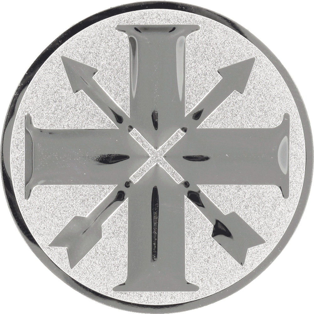 This emblem features a central motif of a stylized cross with broad, rounded arms and arrowheads at the ends, symbolizing precision and skill. The texturized background highlights the polished center, adding depth and dimension to the overall appearance. The smooth and shiny outer edge provides a refined boundary, giving the emblem a polished look that stands out at any award ceremony.