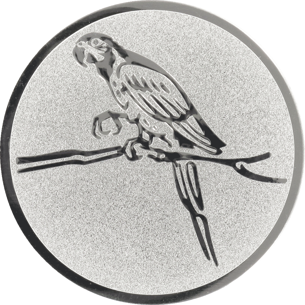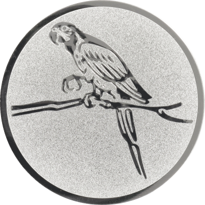 Dette sølvprægede aluminiumsemblem på 50 mm fremhæver en yndefuld papegøje, der sidder på en gren. Med en omhyggeligt udformet reliefprægning af papegøjen, sikrer emblemet et flot visuelt udtryk, der kombinerer skinnende detaljer med en mat, sandblæst tekstur i baggrunden.