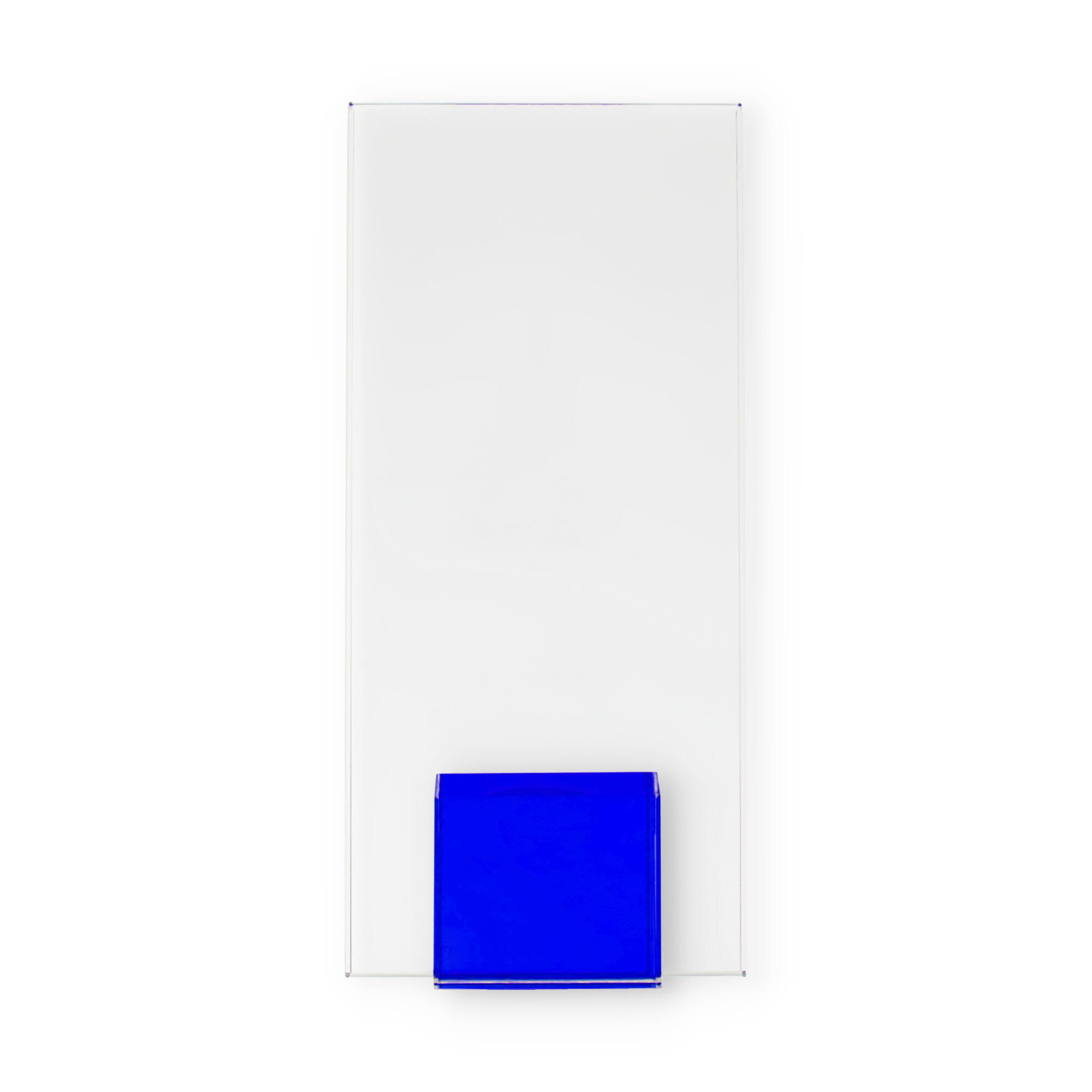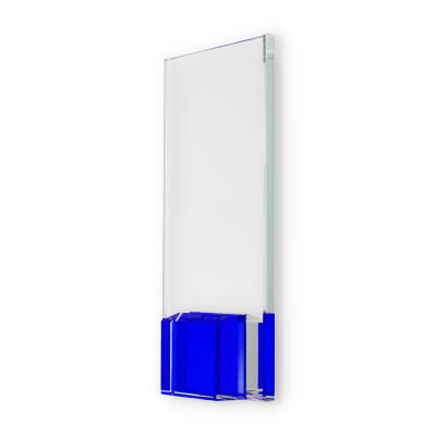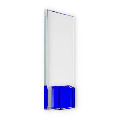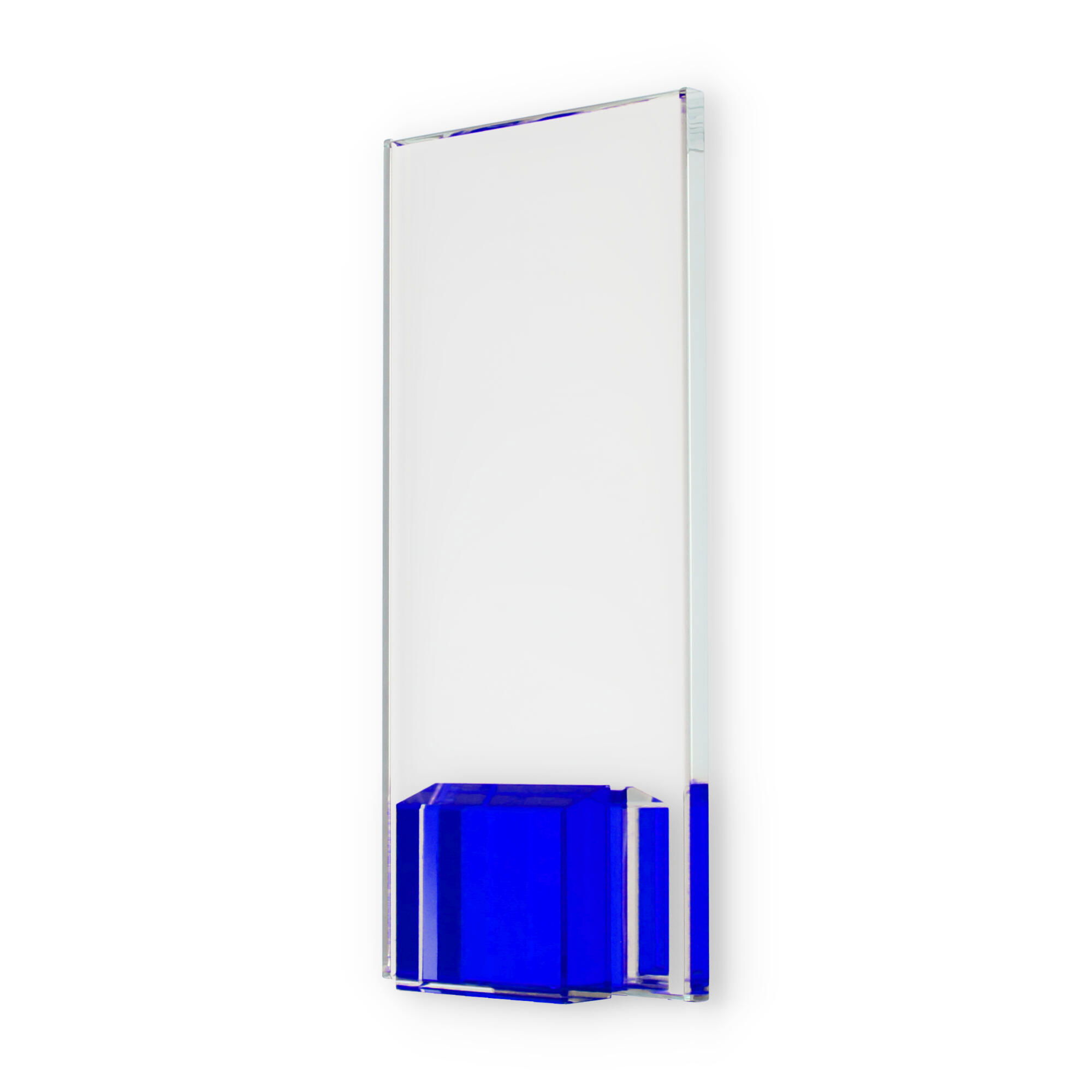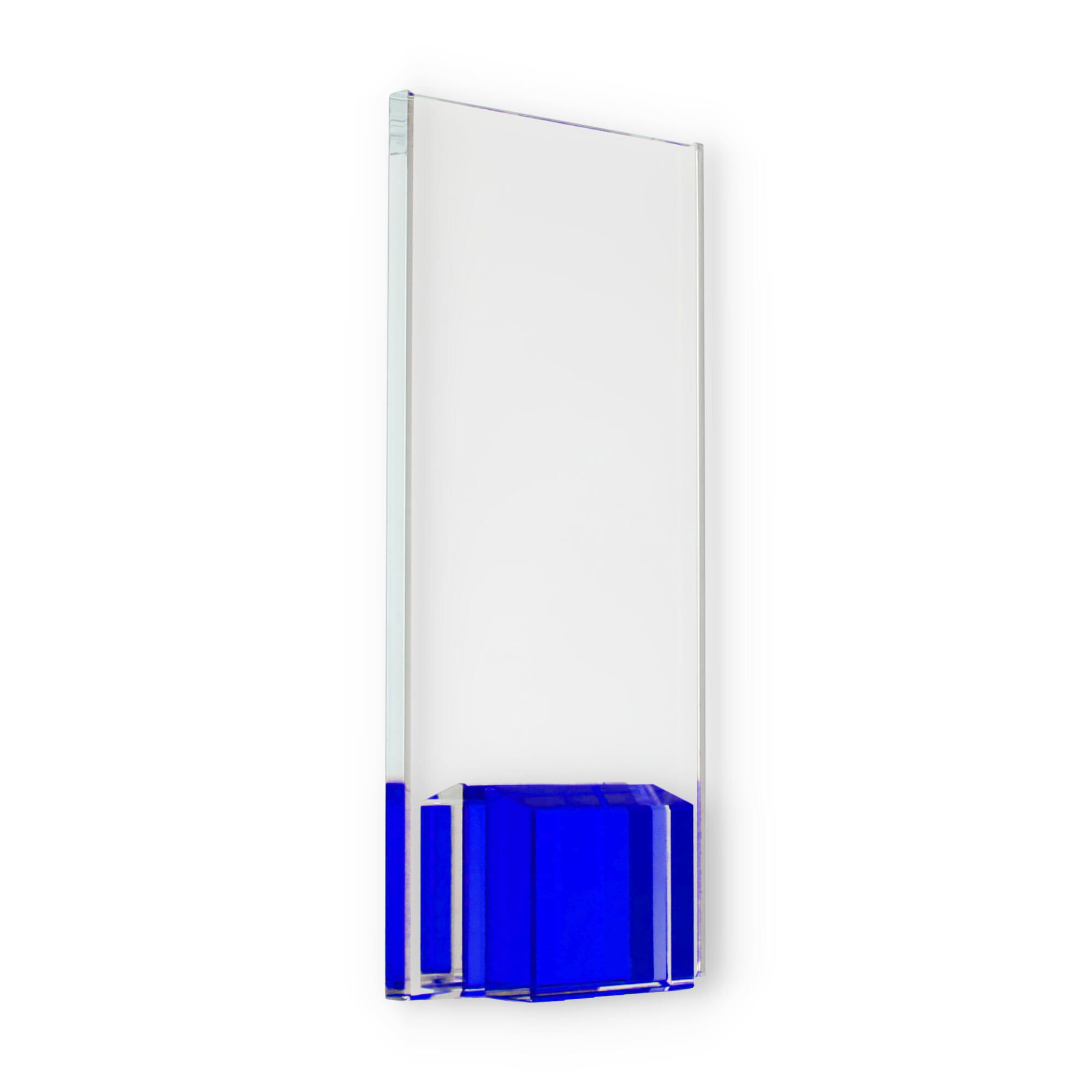 Den kraftigt blå sokkel står i kontrast til den klare overdel, hvilket resulterer i et design, der fanger øjet og udtrykker en stærk følelse af anerkendelse. Du har mulighed for at give trofæet en personlig detalje ved at vælge individuel gravering, hvilket tilføjer en unik dimension til din prisoverrækkelse.