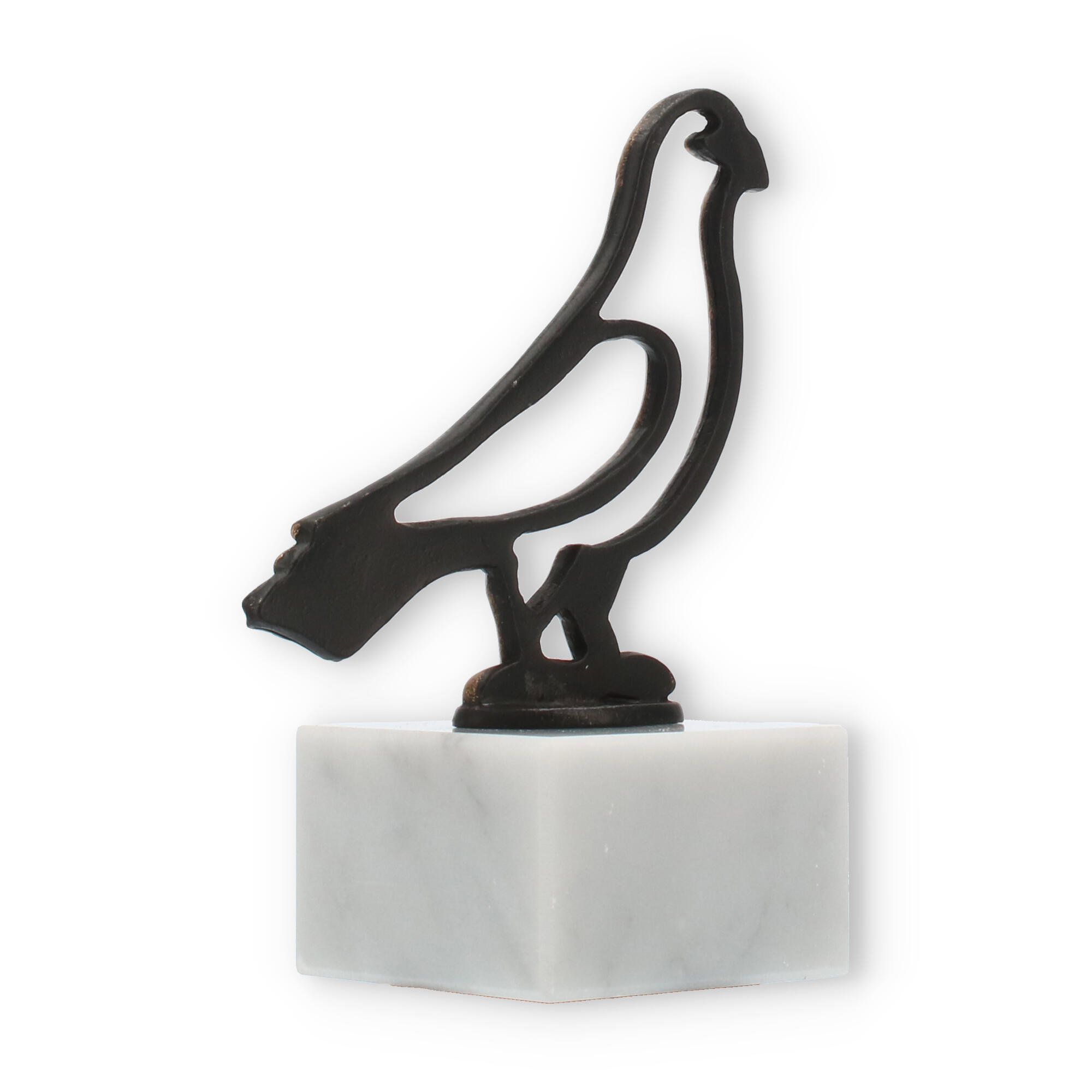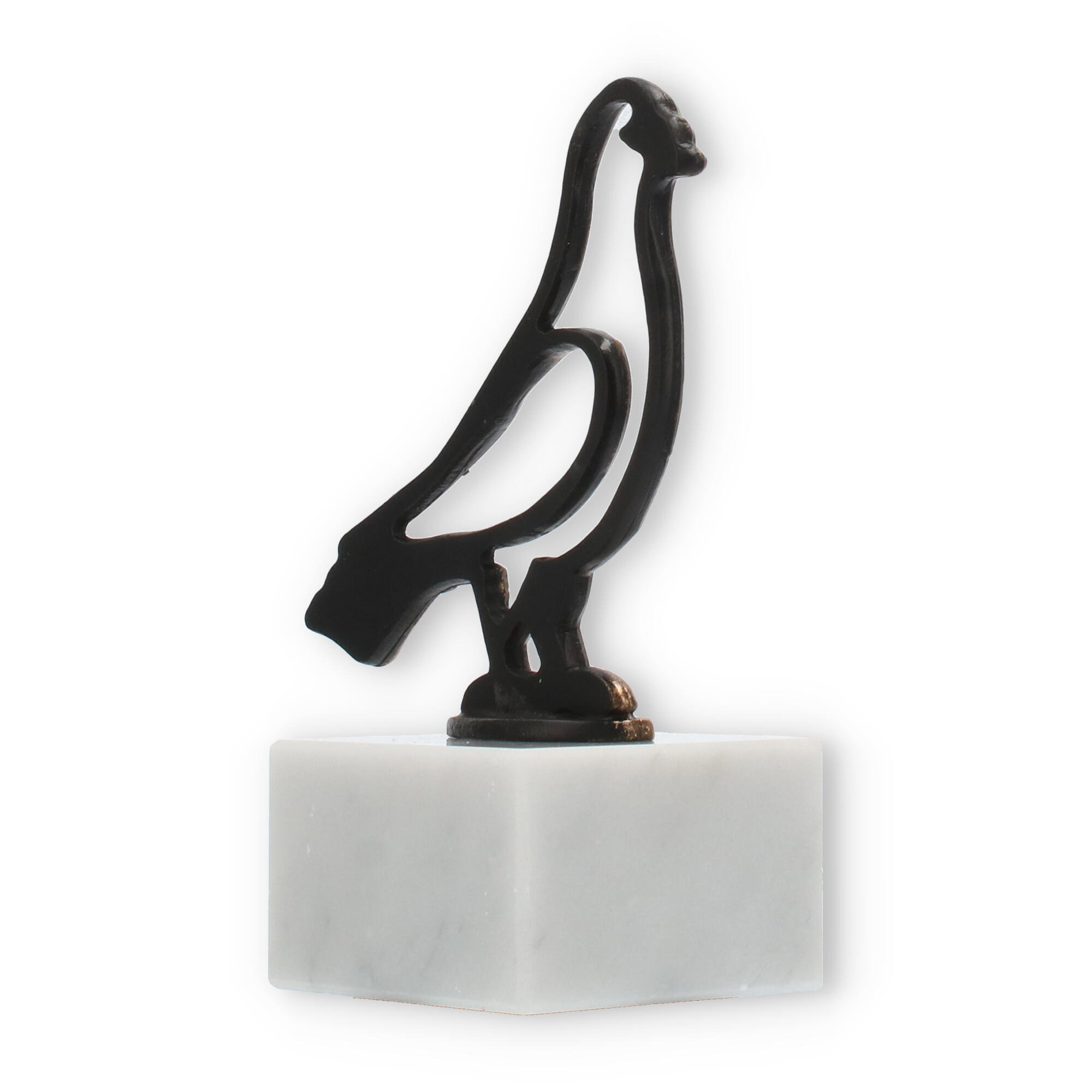 Den robuste hvid marmorbase bringer en følelse af balance og stabilitet, der støtter den delikate silhuet af fuglen. Sammen danner disse elementer en hårfin balance mellem styrke og ynde, hvor naturens kontraster smelter sammen i perfekt harmoni. For enhver, der modtager dette trofæ, vil det repræsentere ikke bare en præstation, men også dyb respekt og anerkendelse.