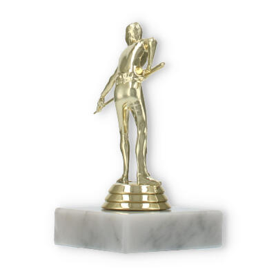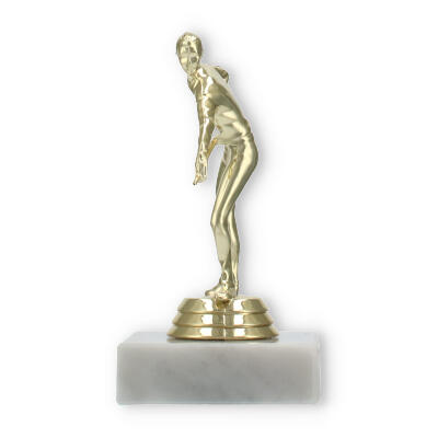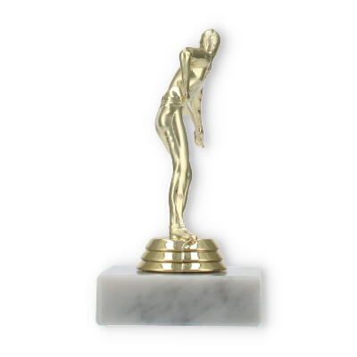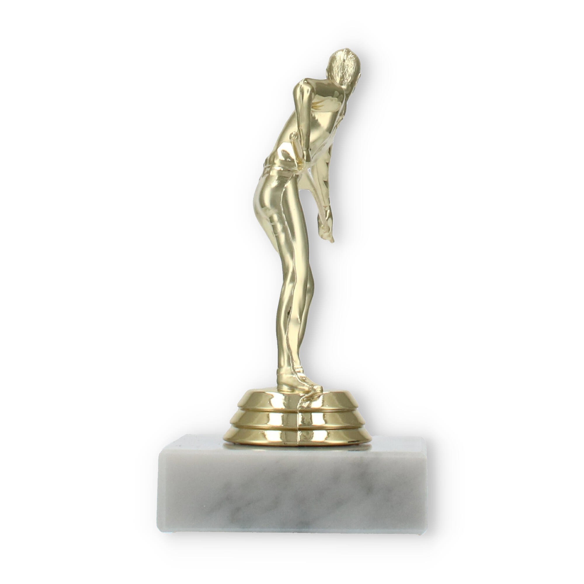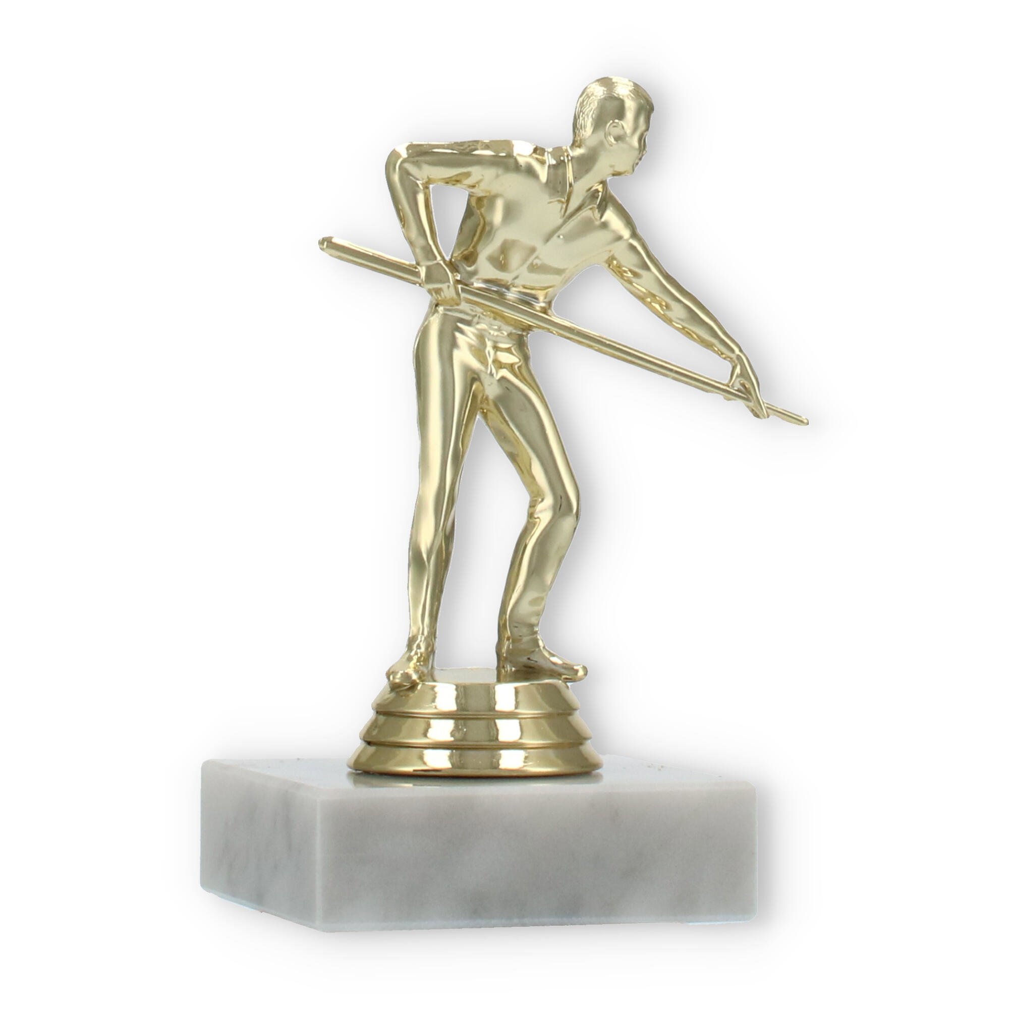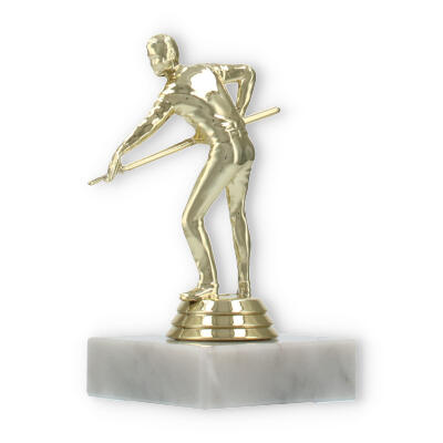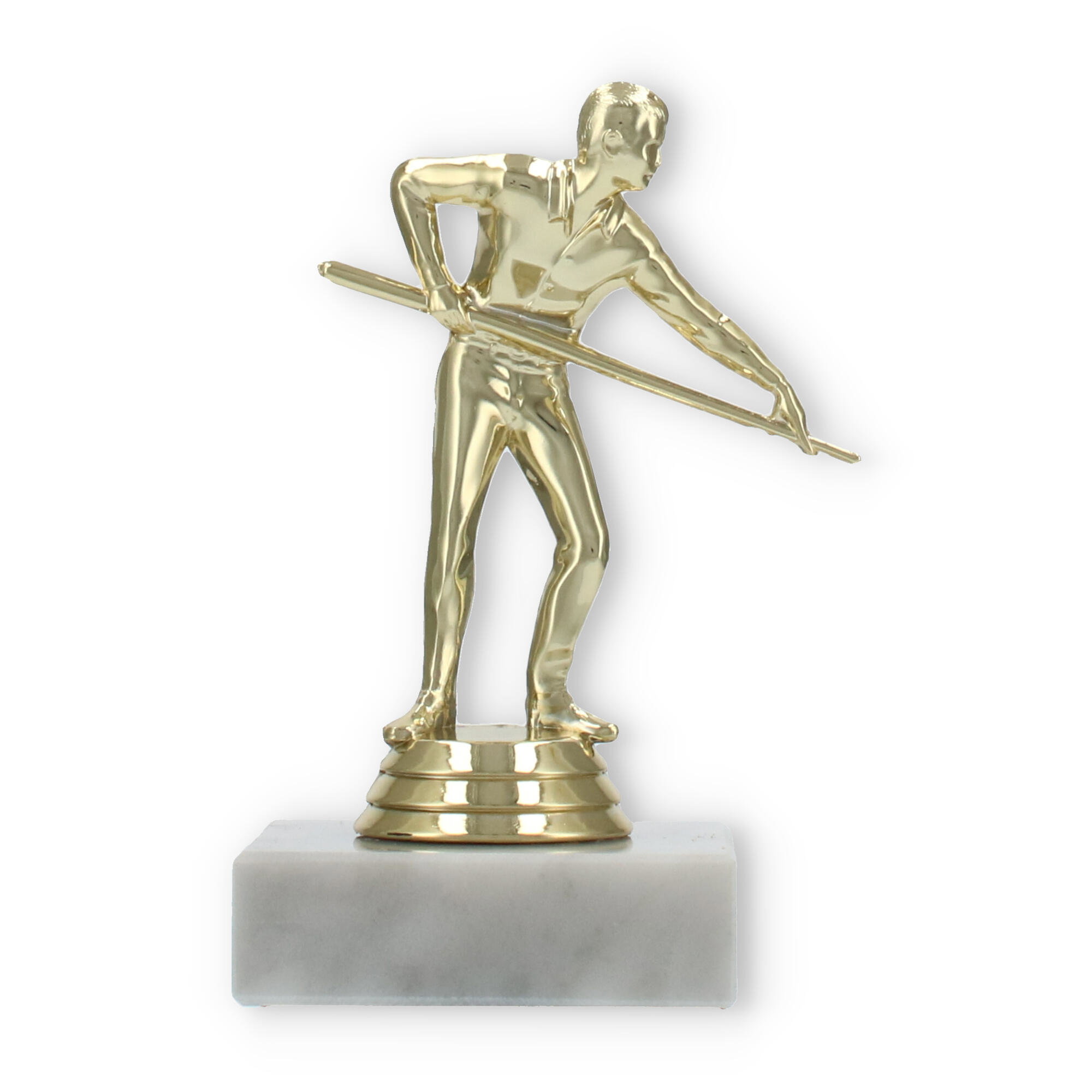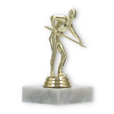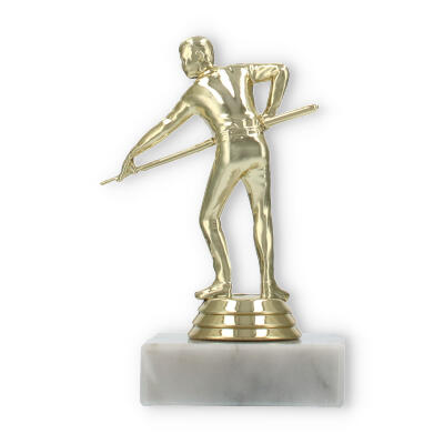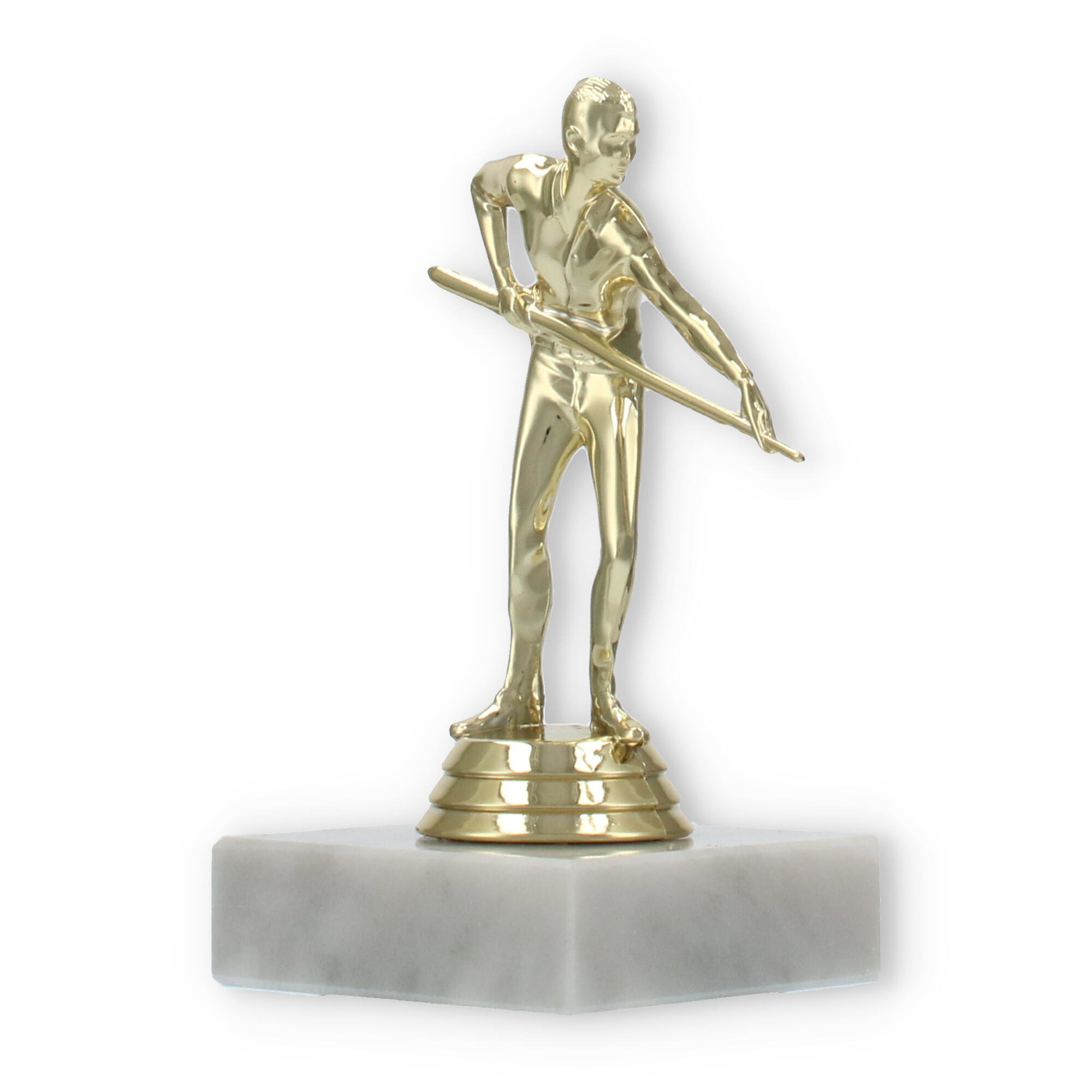 Præsenter dine vindere med en unik pokal, der fanger opmærksomheden med sin stilfulde kombination af materialer. Denne billardspiller-pokal måler 12 cm og står som en stolte symbol for præstationer inden for billard. Det guldfarvede materiale giver figuren en elegant fremtoning, der diskret fanger lydens refleksion i det rige rum.