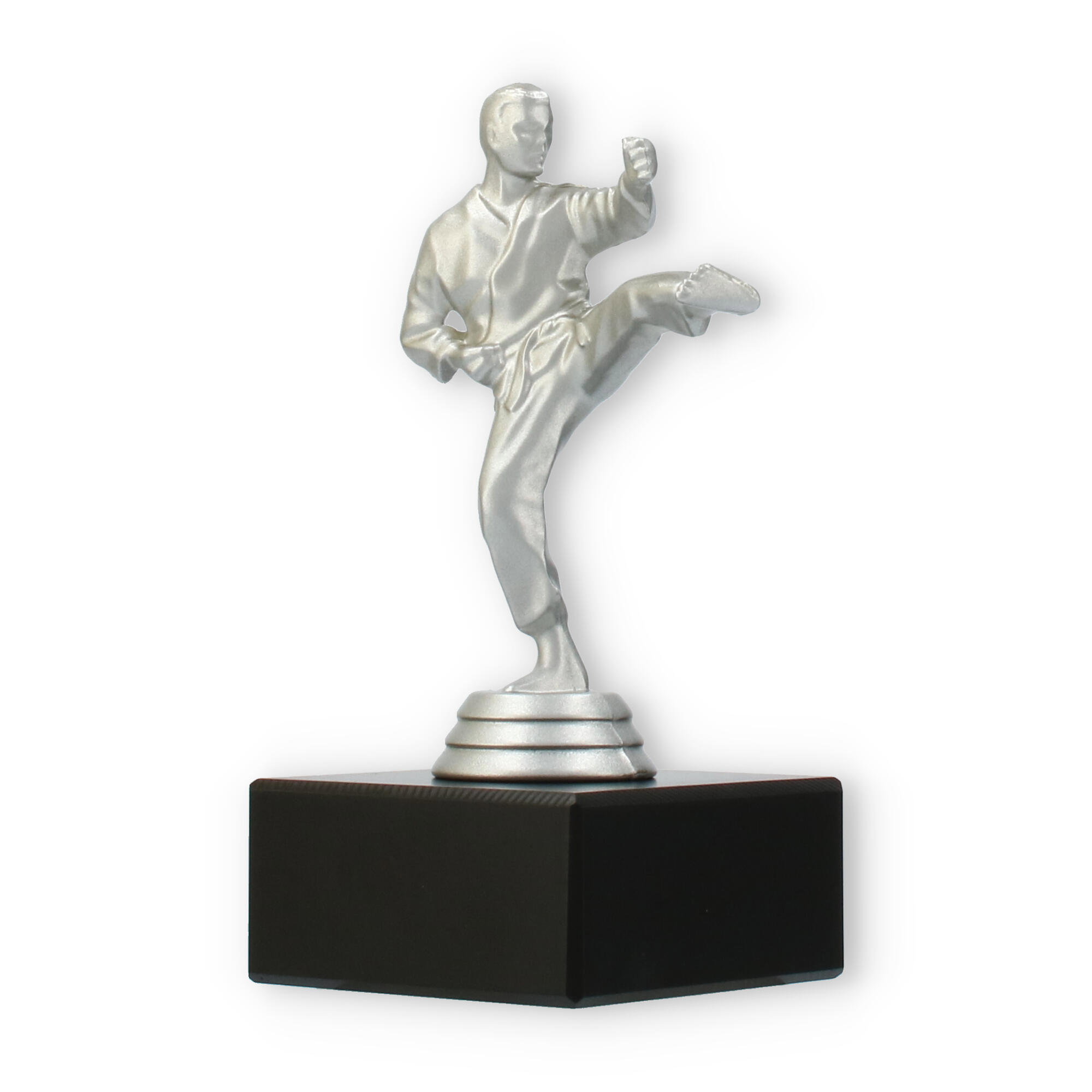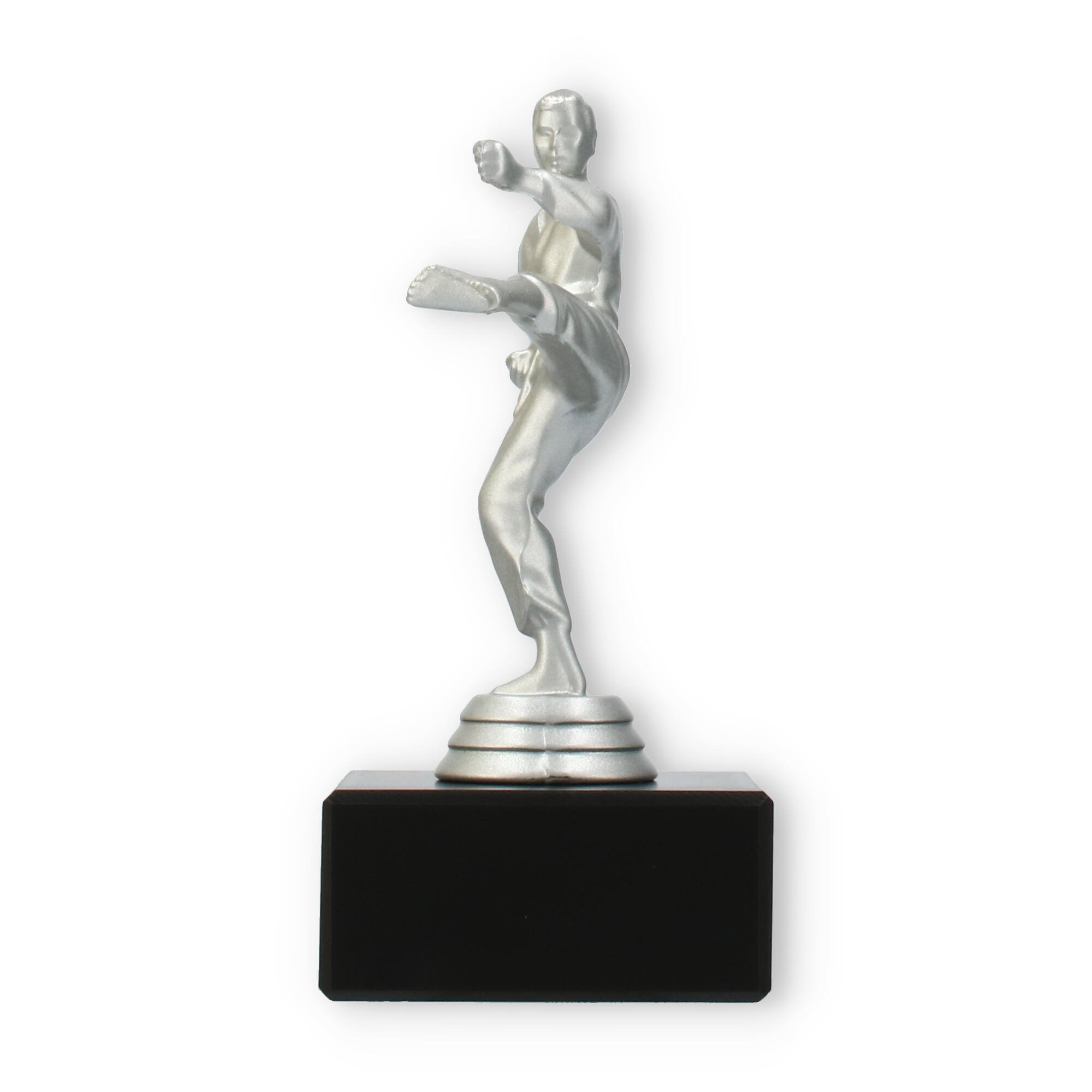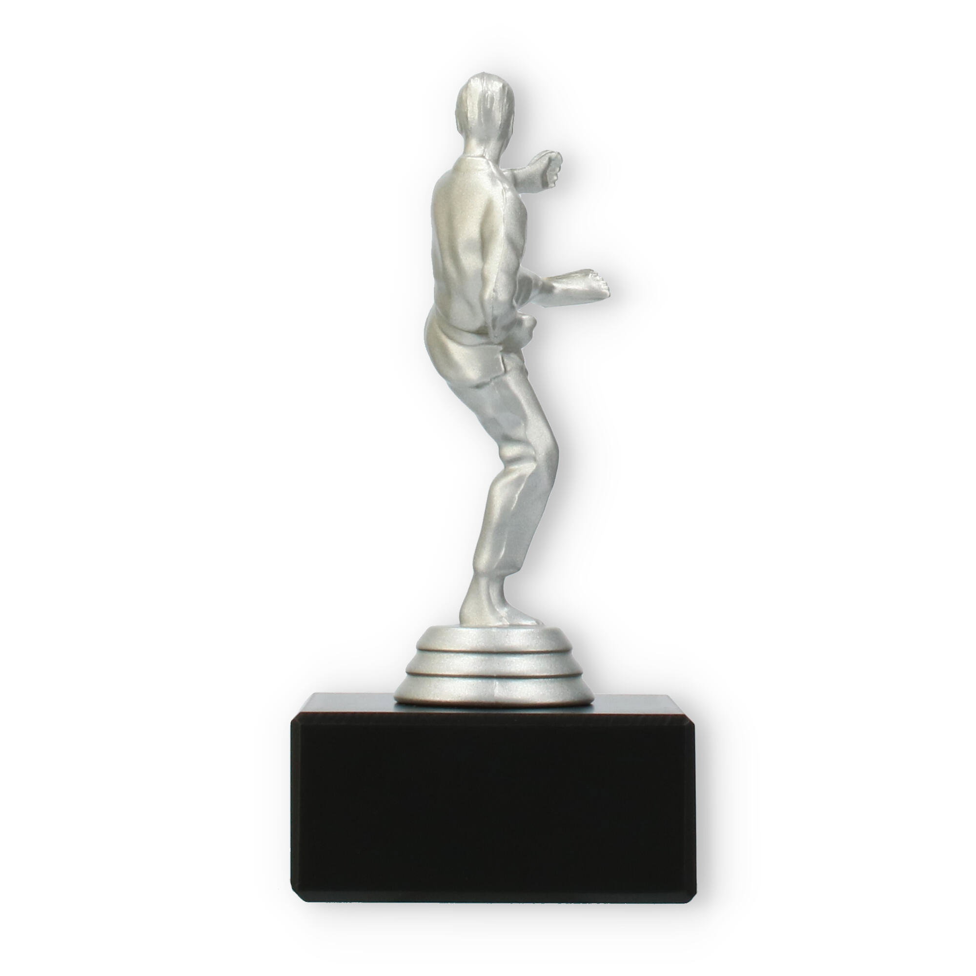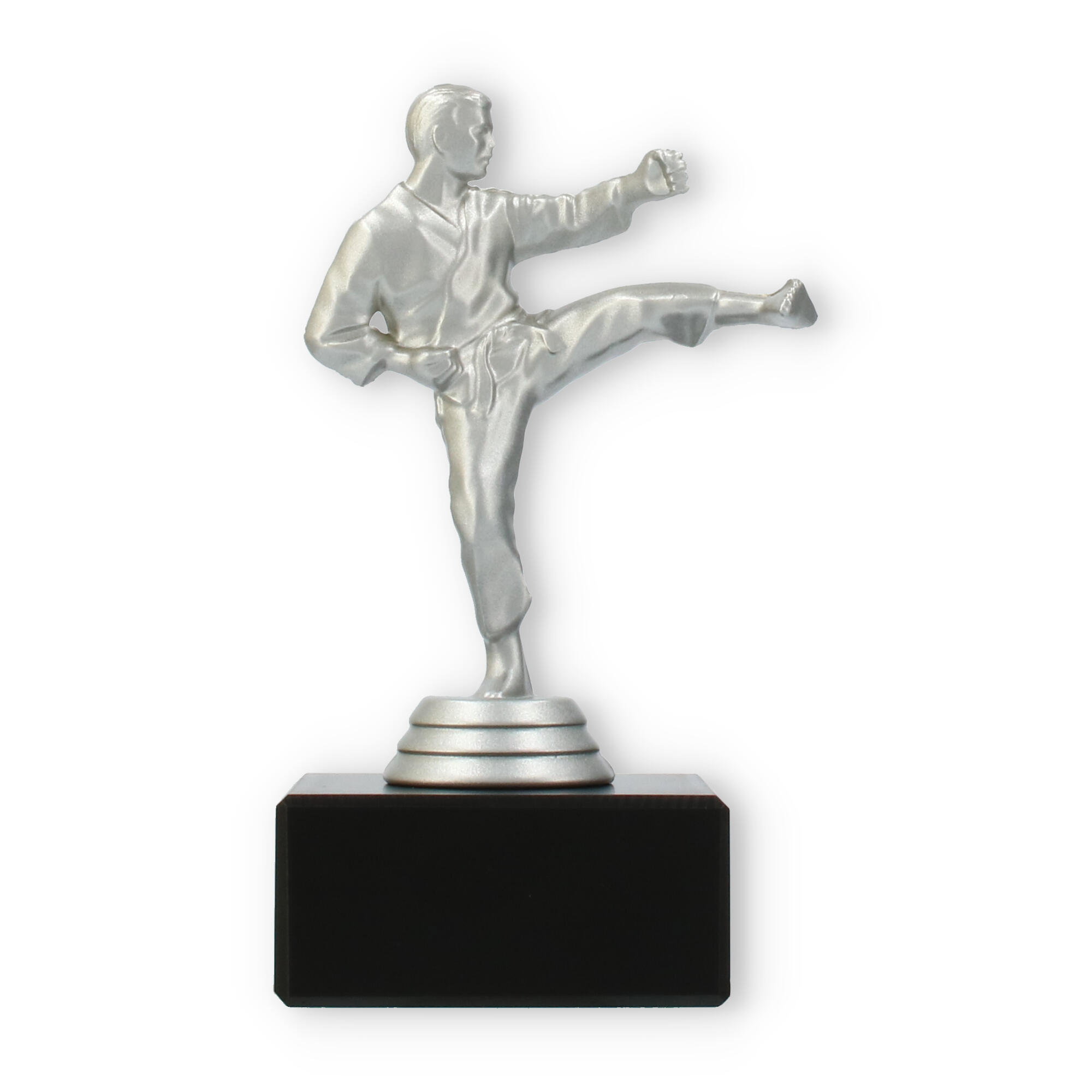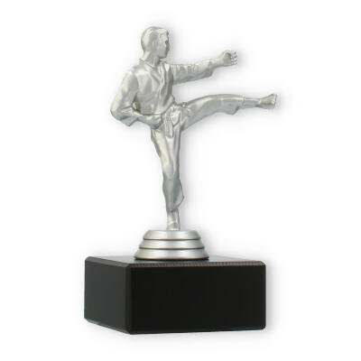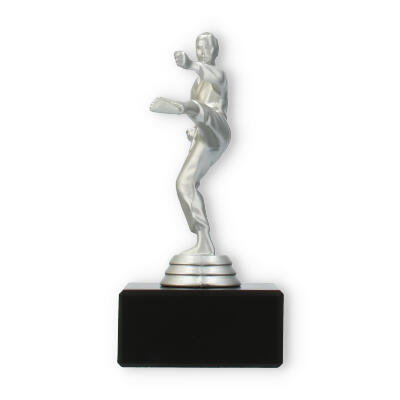 Denne imponerende pokal symboliserer styrke og dedikation inden for kampsporten. Den sølvfarvede metallic figur viser en karateudøver i aktion, mens han udfører et dramatisk højt spark. Figuren står fast på en robust, sort marmorbase, der giver pokalen en sofistikeret fremtoning ved enhver præmieoverrækkelse.