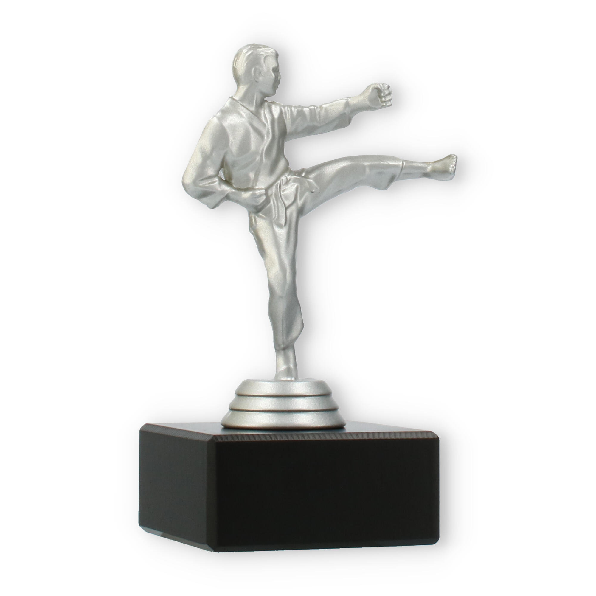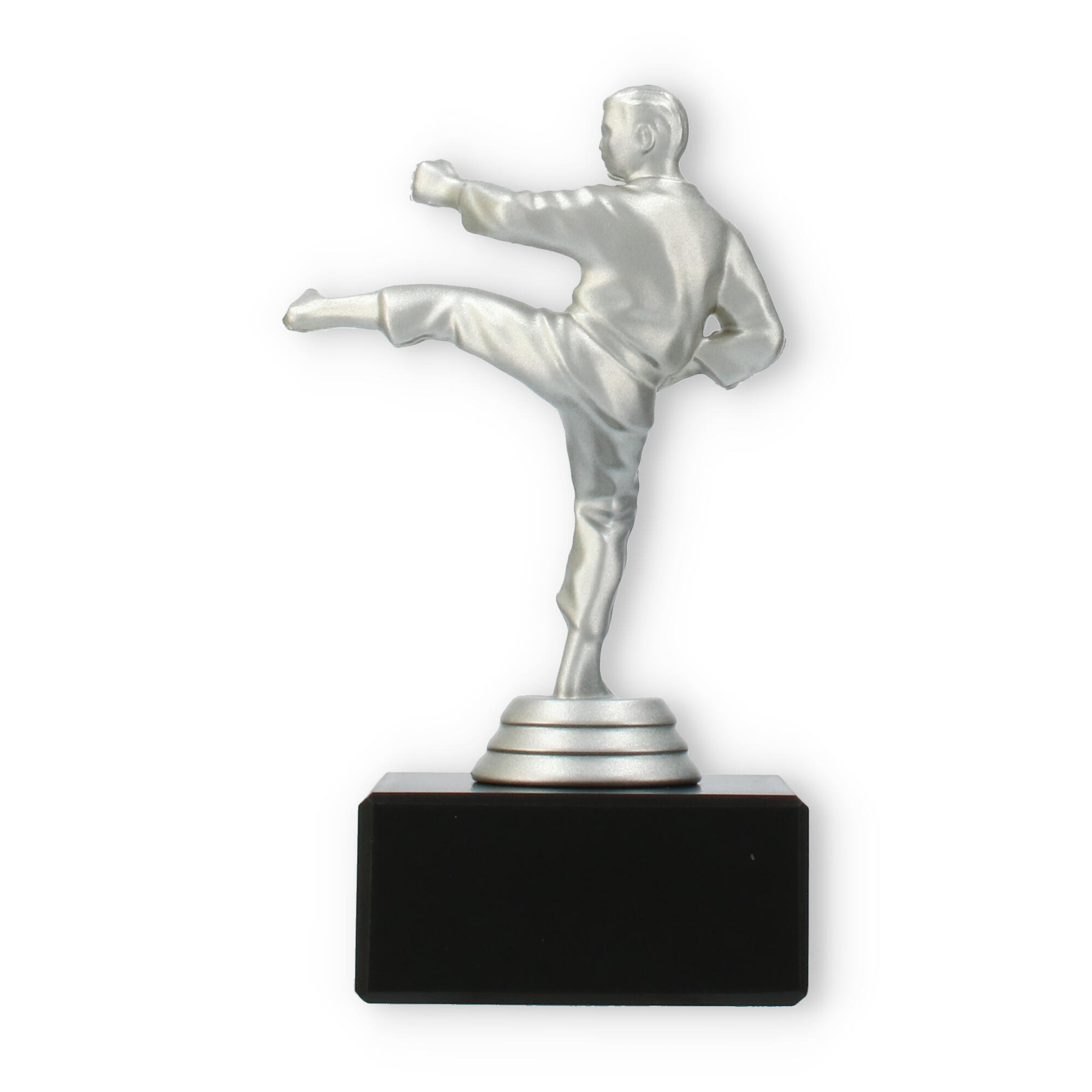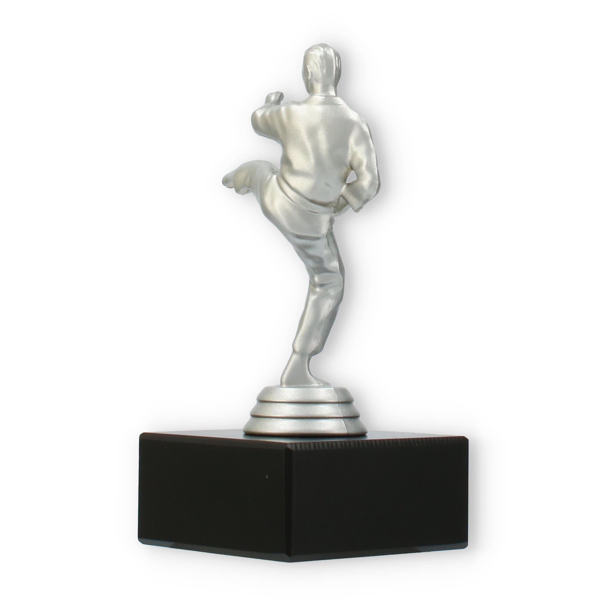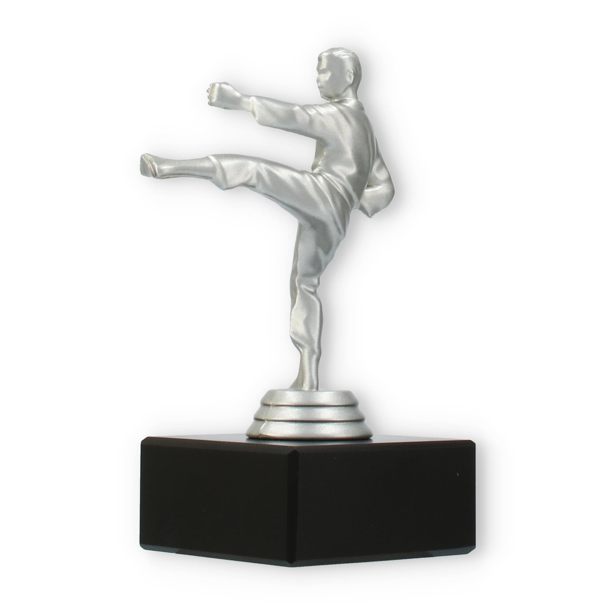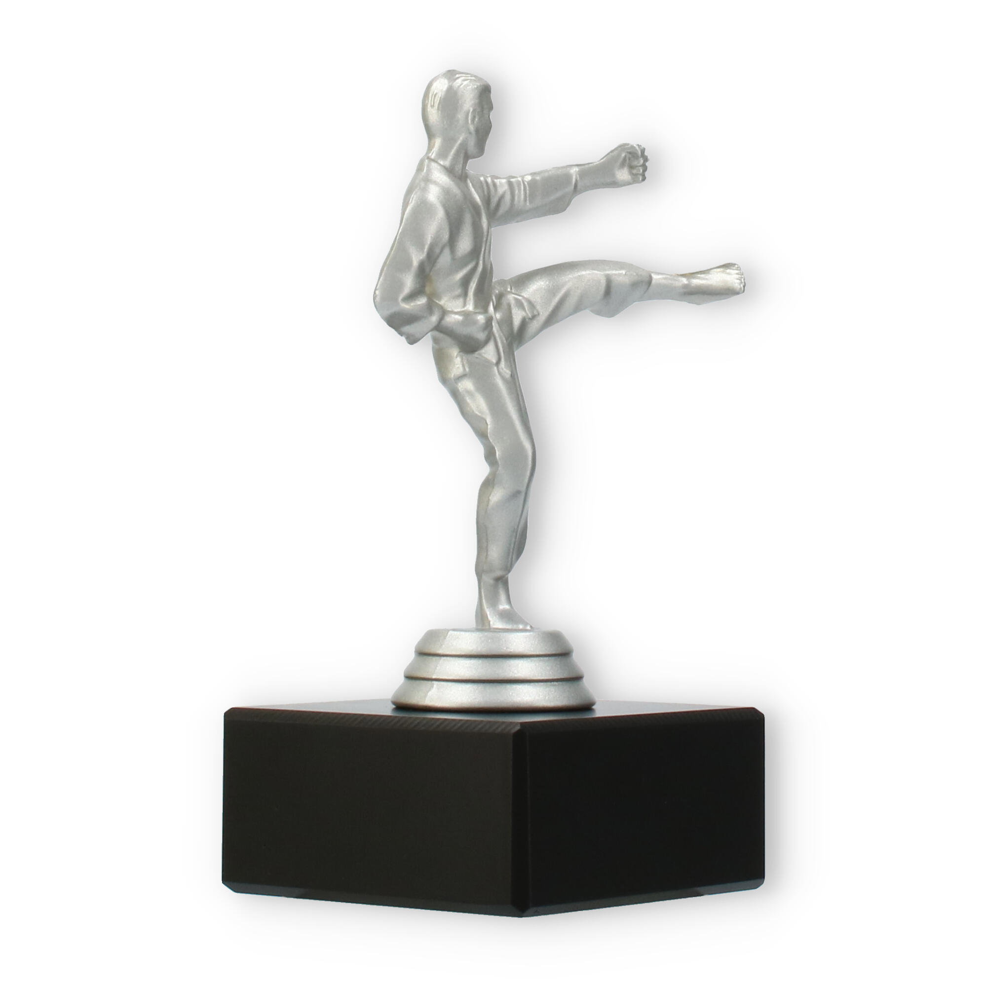 Denne imponerende pokal symboliserer styrke og dedikation inden for kampsporten. Den sølvfarvede metallic figur viser en karateudøver i aktion, mens han udfører et dramatisk højt spark. Figuren står fast på en robust, sort marmorbase, der giver pokalen en sofistikeret fremtoning ved enhver præmieoverrækkelse.