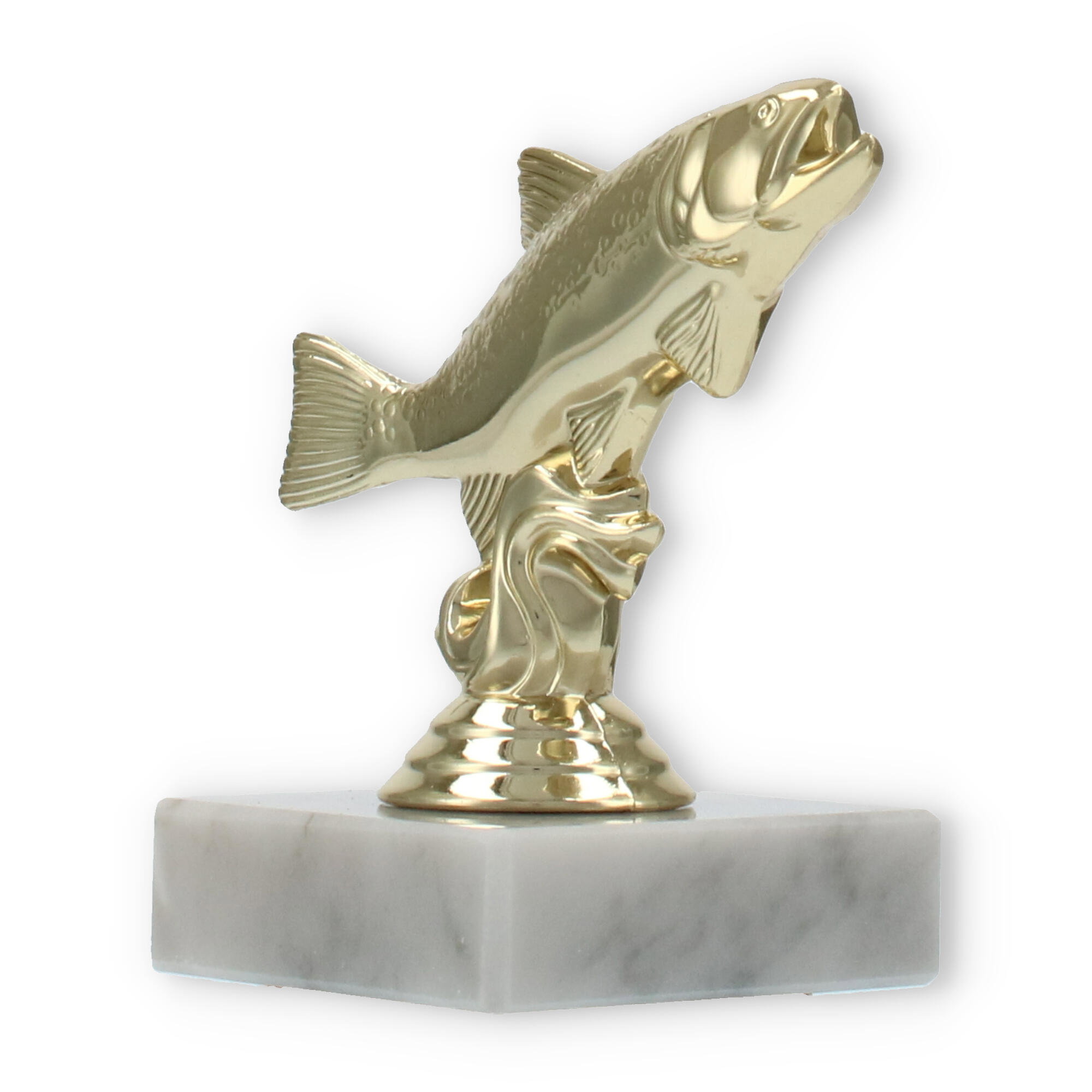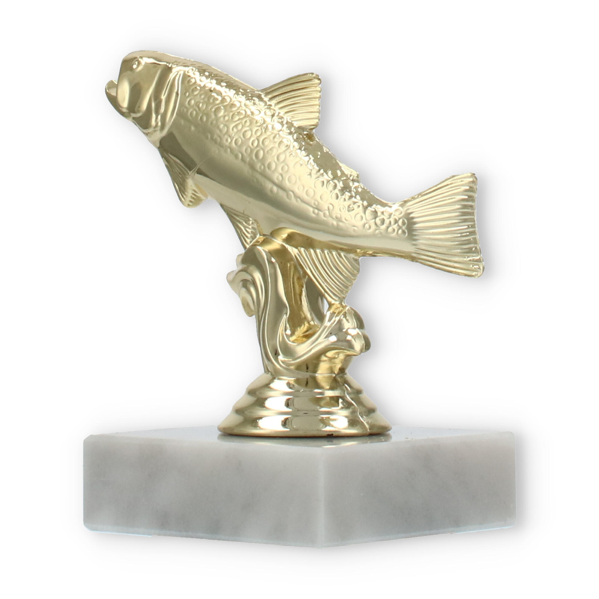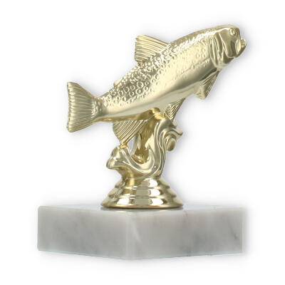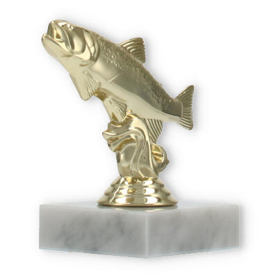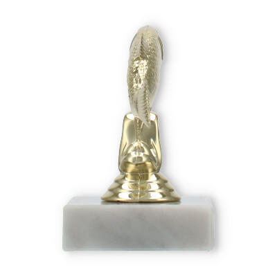 Fejr triumfen med dette trofæ: En guldfarvet fisk i detaljeret design står stolt på en elegant hvid marmorbase. Tilpas med personlig gravering, så hver sejr bliver mindeværdig. Perfekt til fiskekonkurrencer.