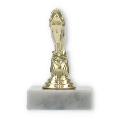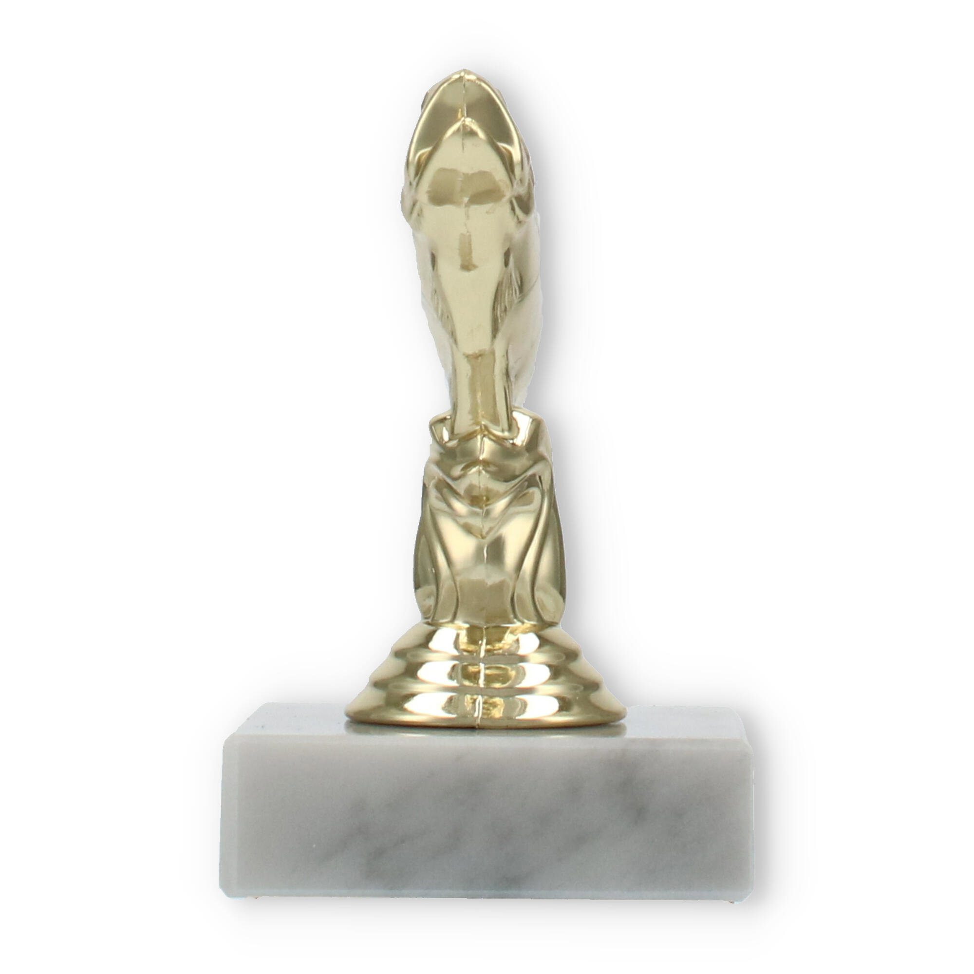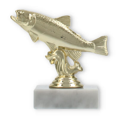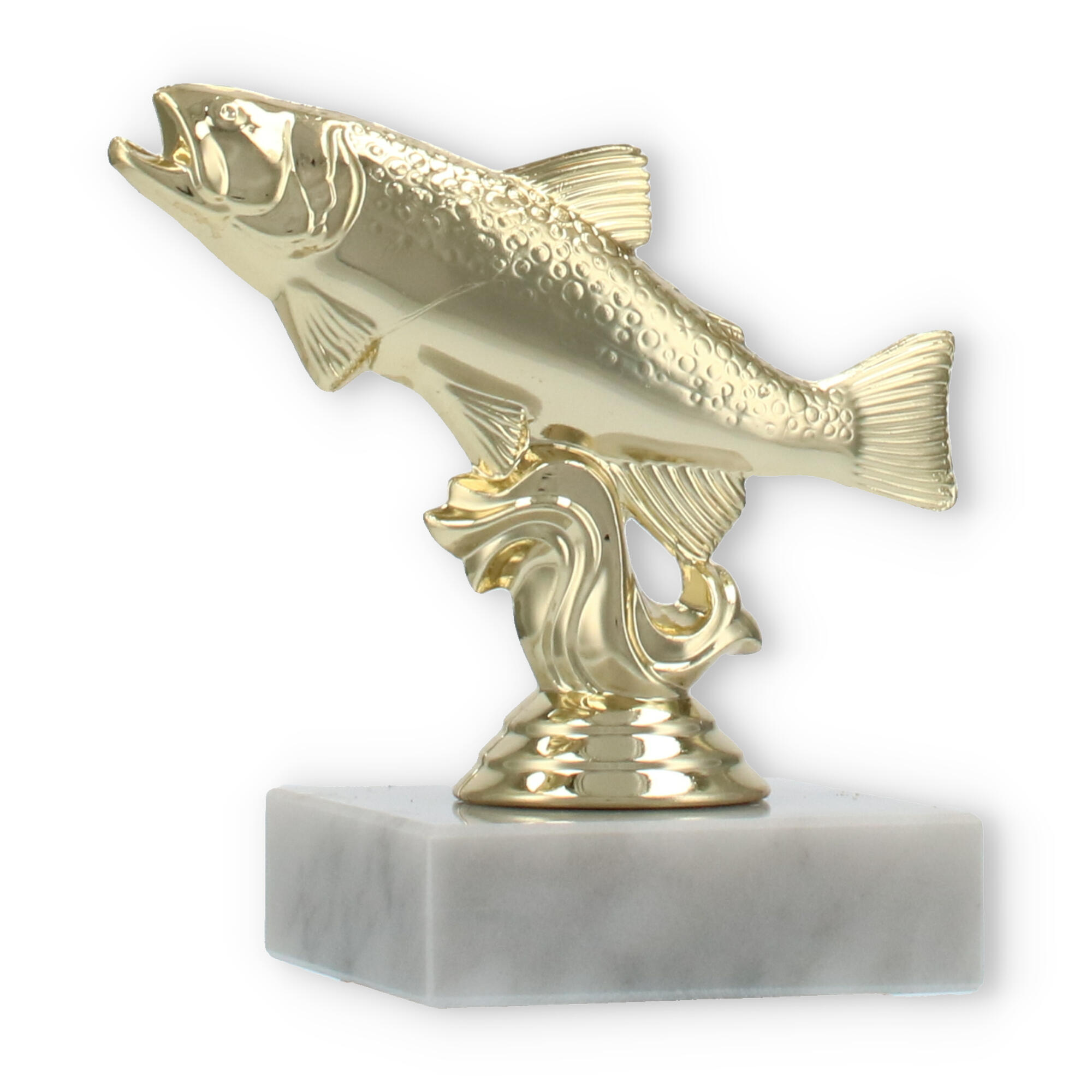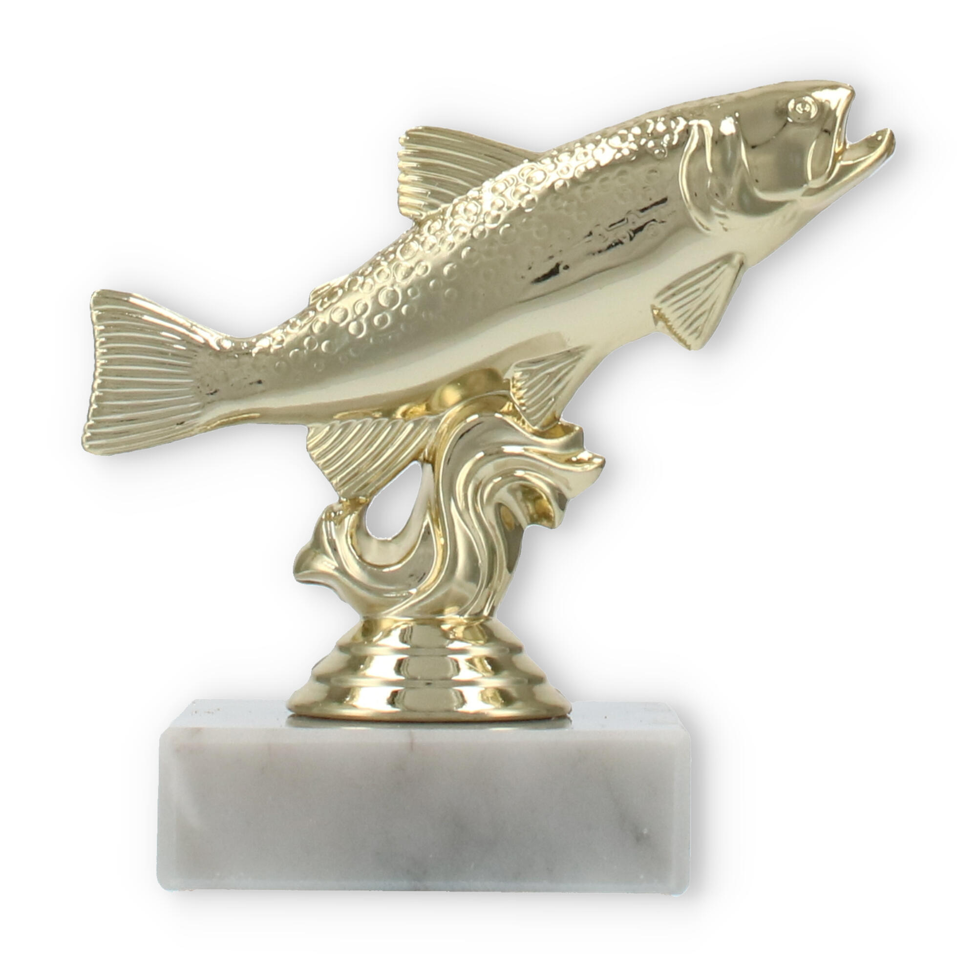 Fejr triumfen med dette trofæ: En guldfarvet fisk i detaljeret design står stolt på en elegant hvid marmorbase. Tilpas med personlig gravering, så hver sejr bliver mindeværdig. Perfekt til fiskekonkurrencer.