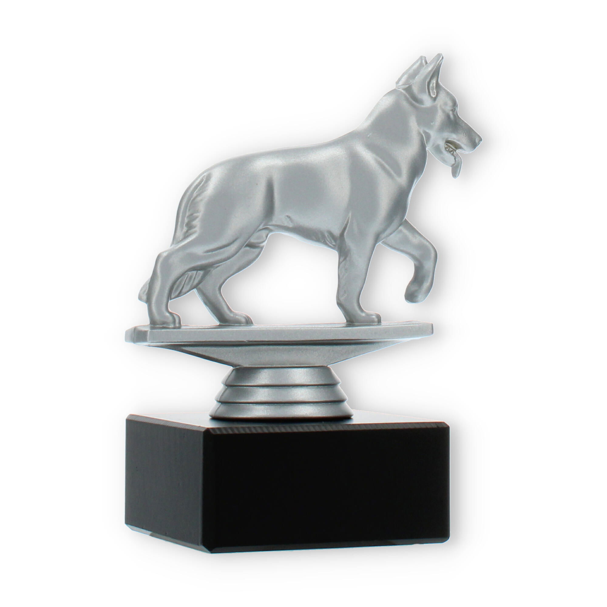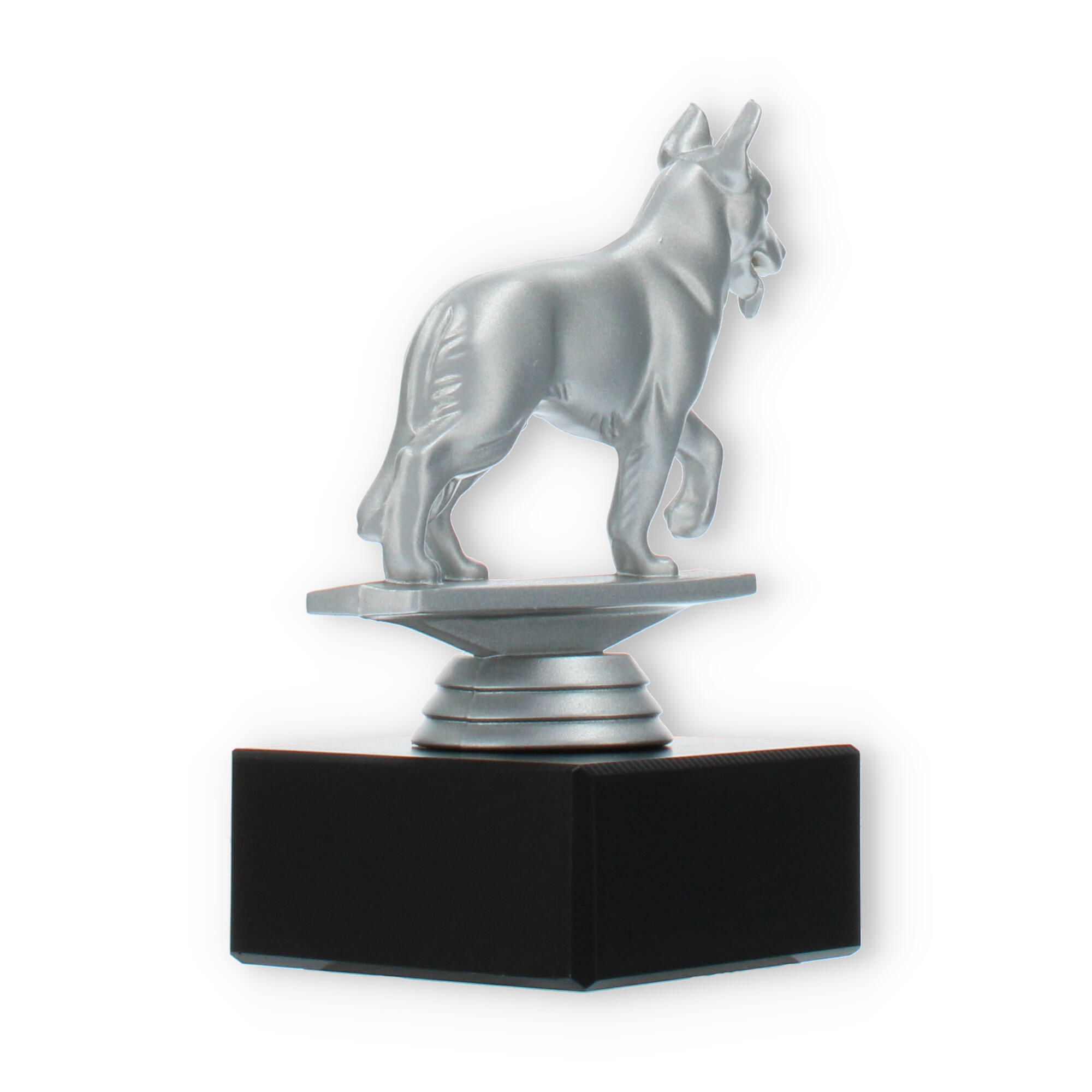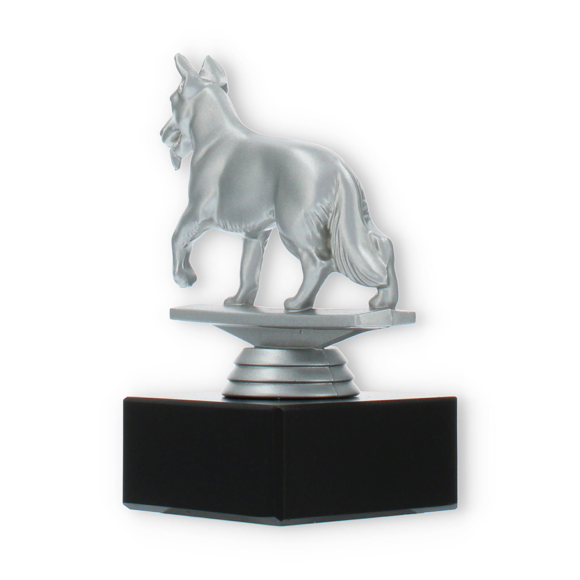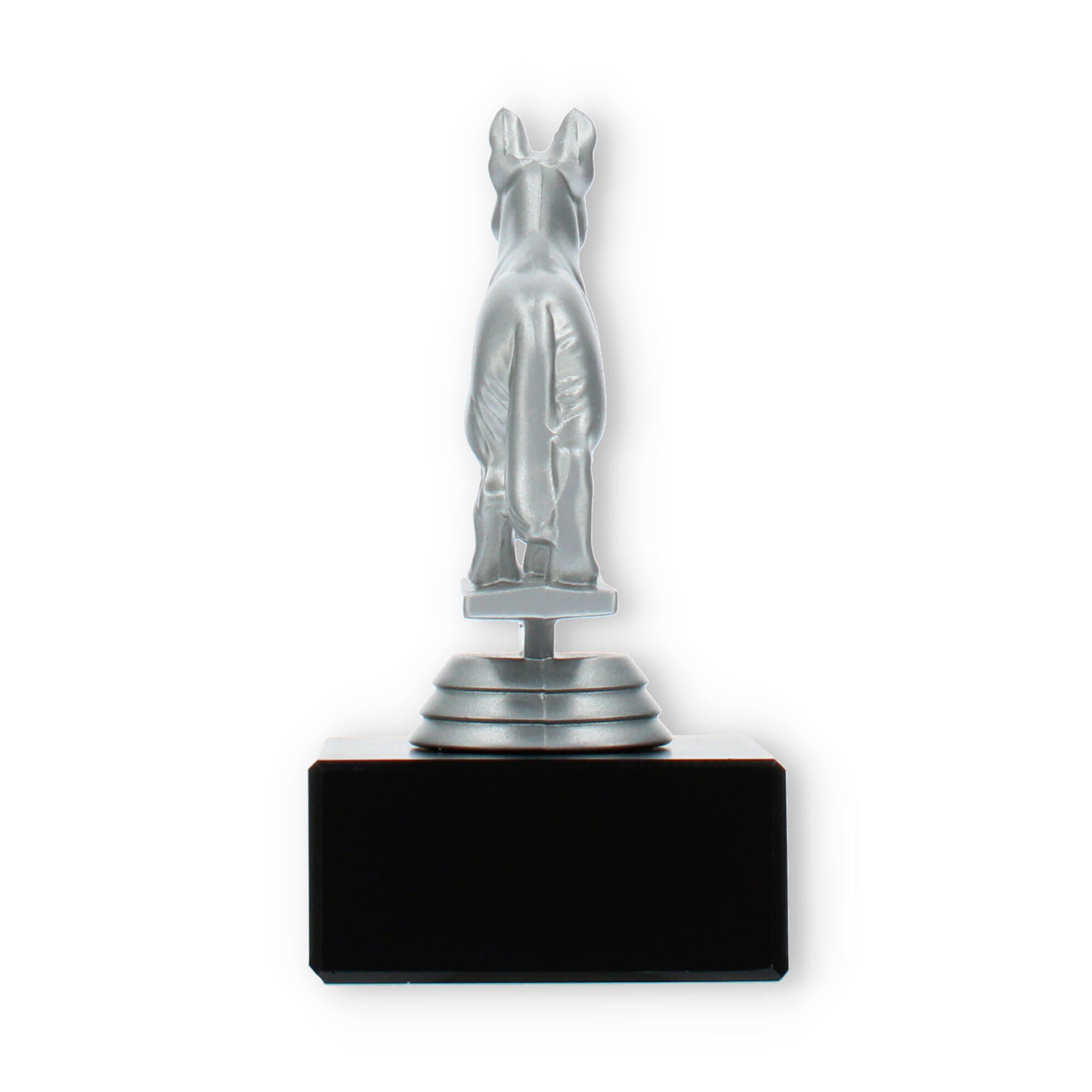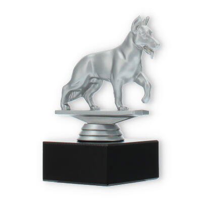 Gør din prisoverrækkelse mindeværdig med vores pokal med en schæferhund i sølvfarvet plastfigur på en sort marmorsokkel. Den muliggør individuel gravering, hvilket skaber en personlig forbindelse til modtageren. Perfekt til hundeshows eller elskere af schæferhunde.