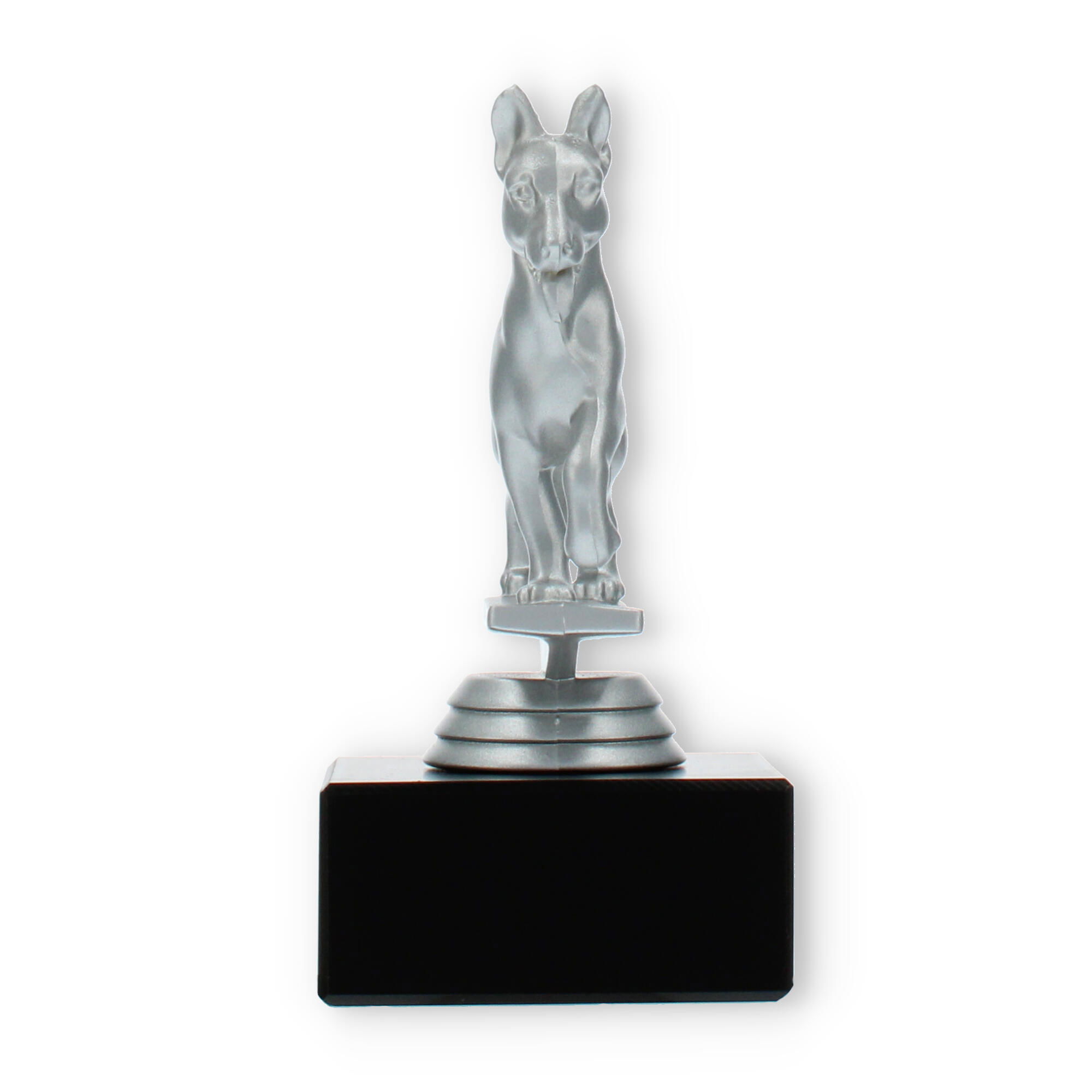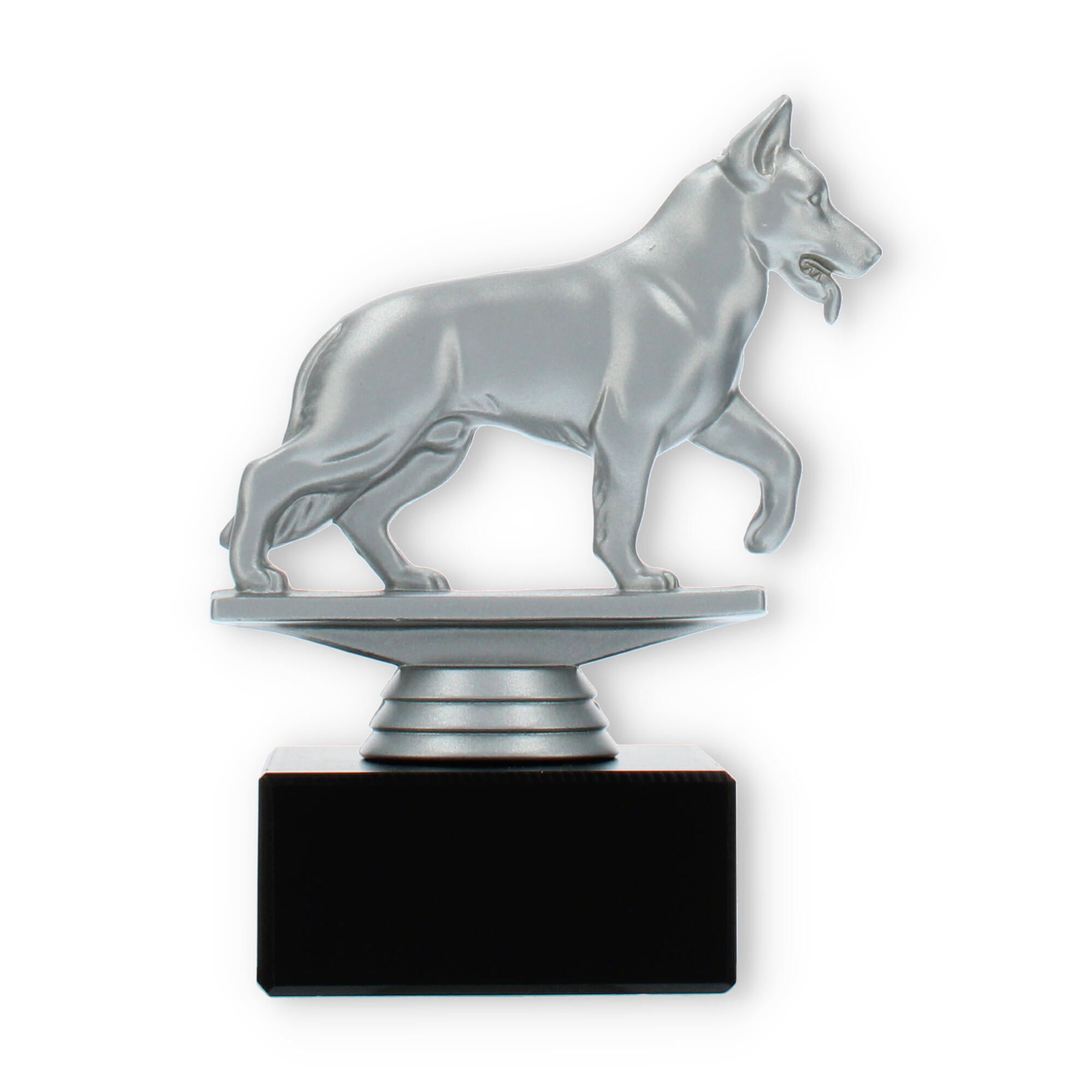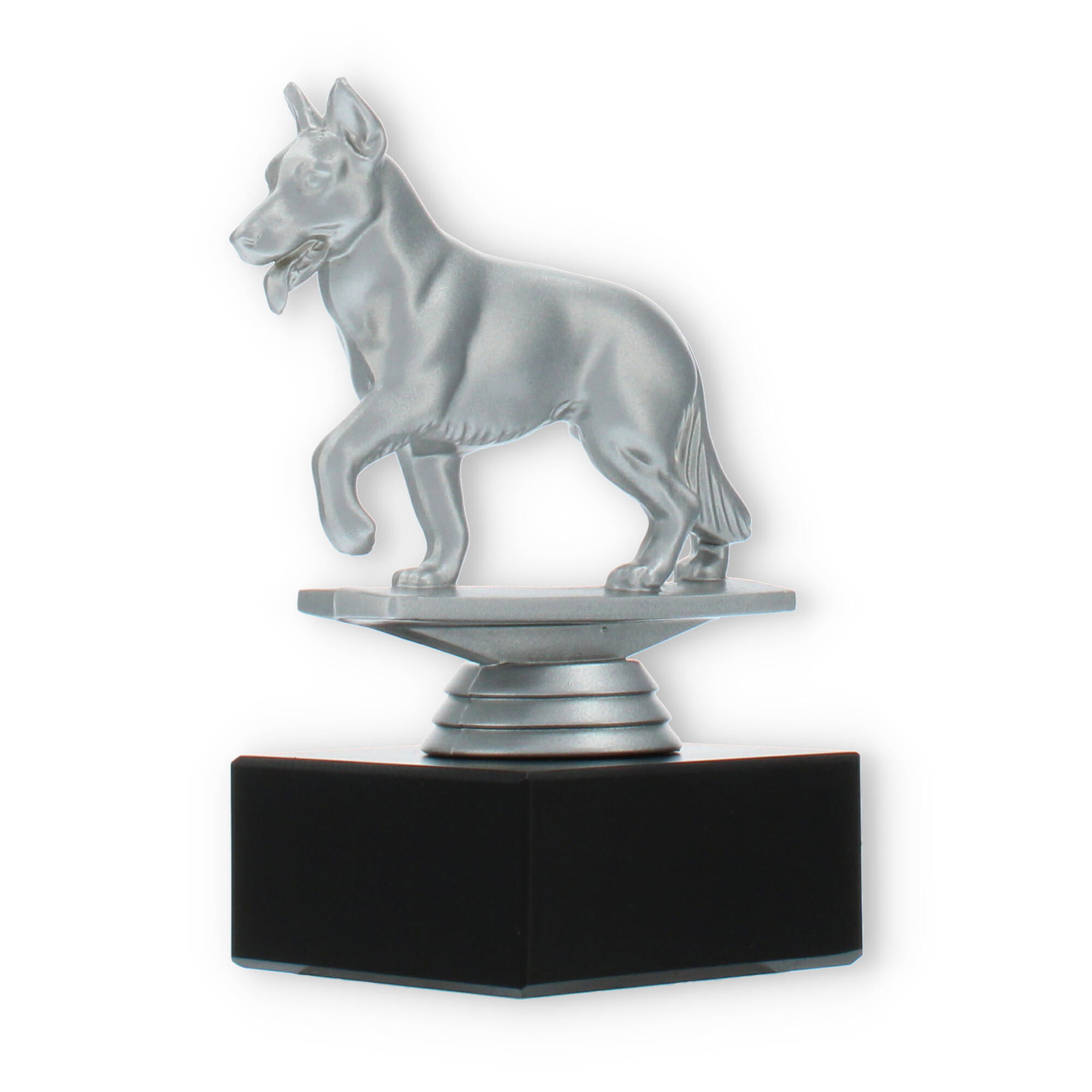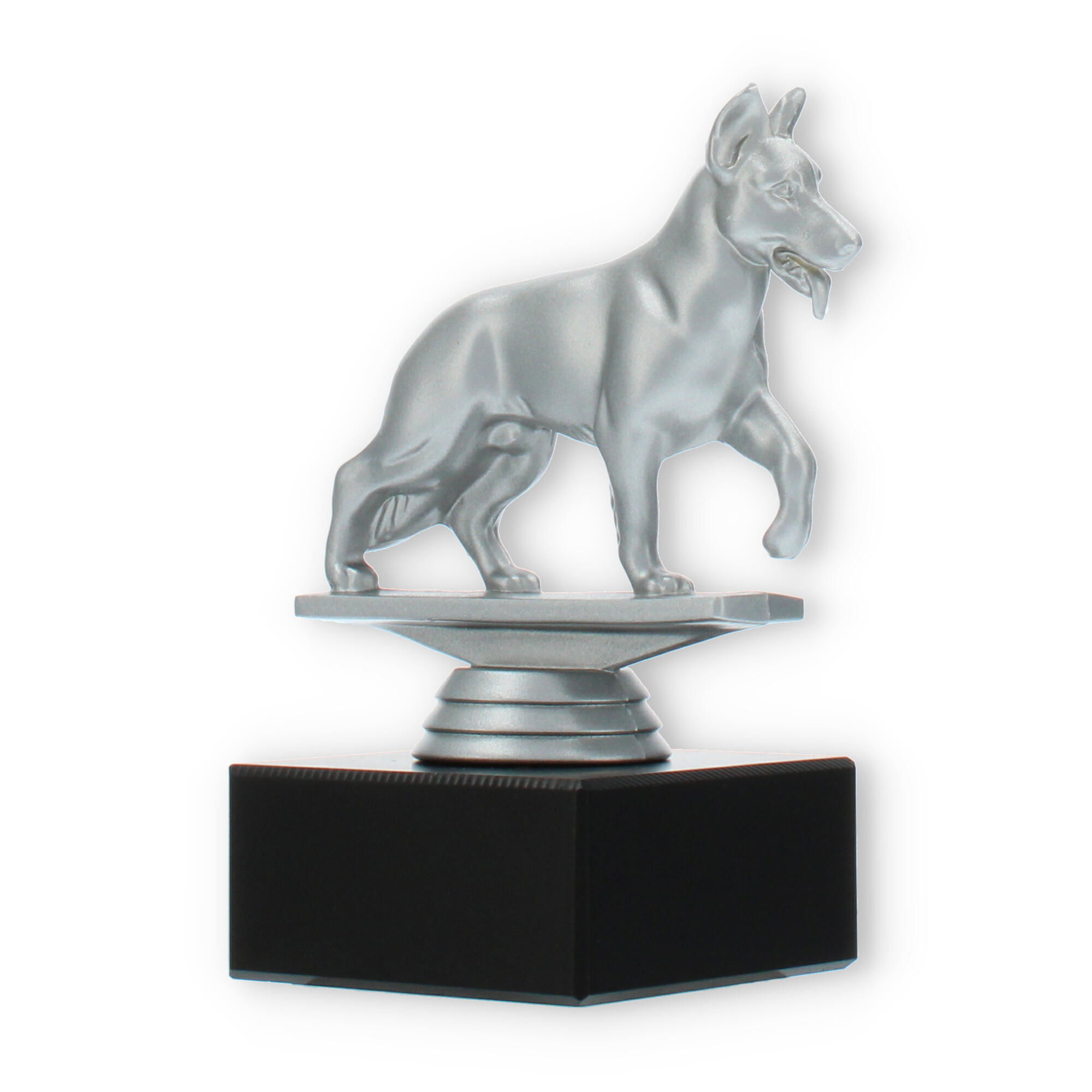 Gør din prisoverrækkelse mindeværdig med vores pokal med en schæferhund i sølvfarvet plastfigur på en sort marmorsokkel. Den muliggør individuel gravering, hvilket skaber en personlig forbindelse til modtageren. Perfekt til hundeshows eller elskere af schæferhunde.