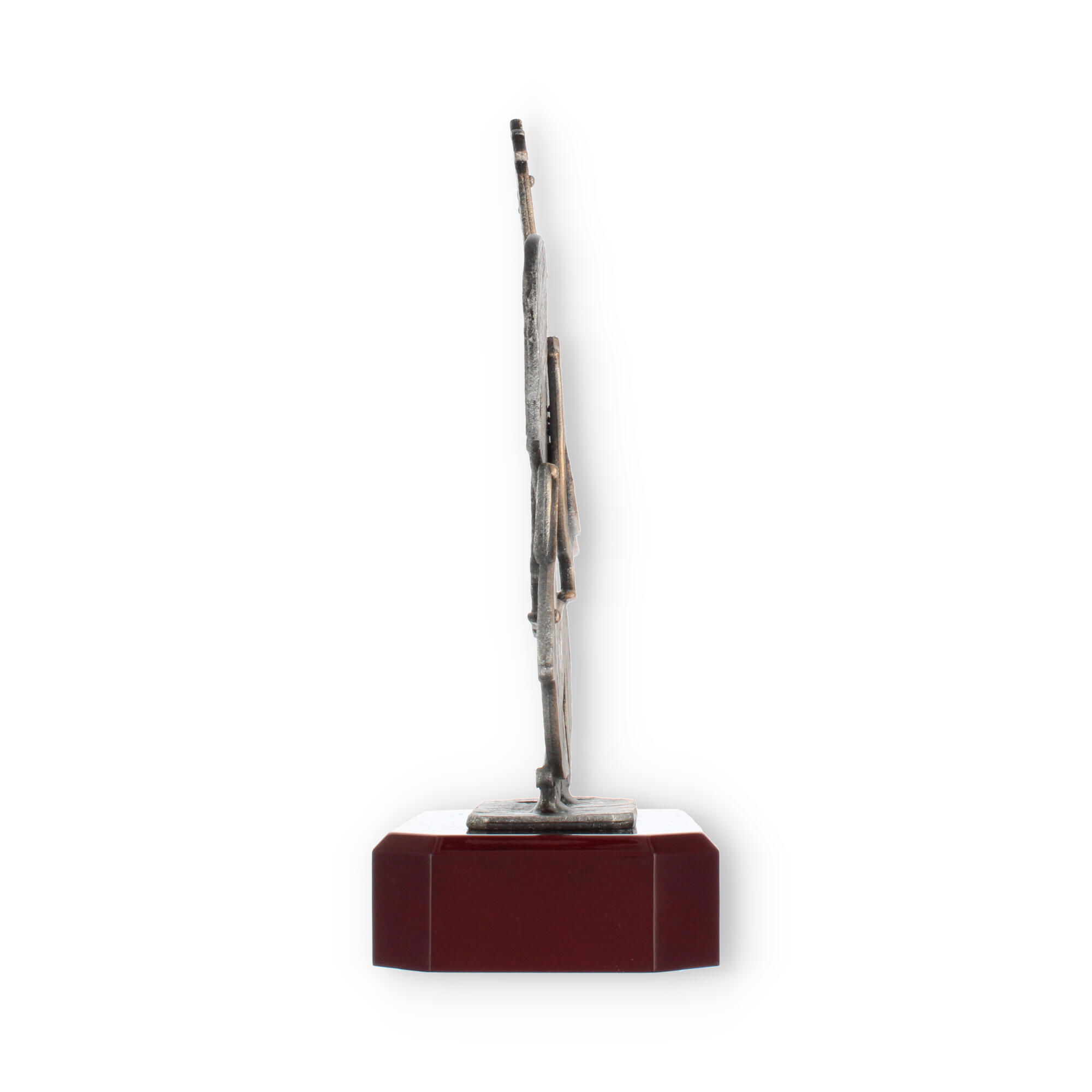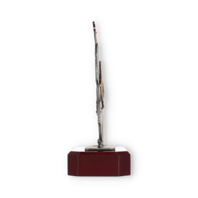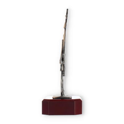 Basen af pokalen består af en træfod, behandlet for at give en mahognifarvet udseende, hvorpå en plakette kan graveres for at fange øjeblikket. Den mørke nuance af foden danner en stærk kontrast til figurens antique finish, hvilket gør hver detalje lettere at beundre. Disse nuancer samarbejder for at skabe en præmie, der er både elegant og mindeværdig.