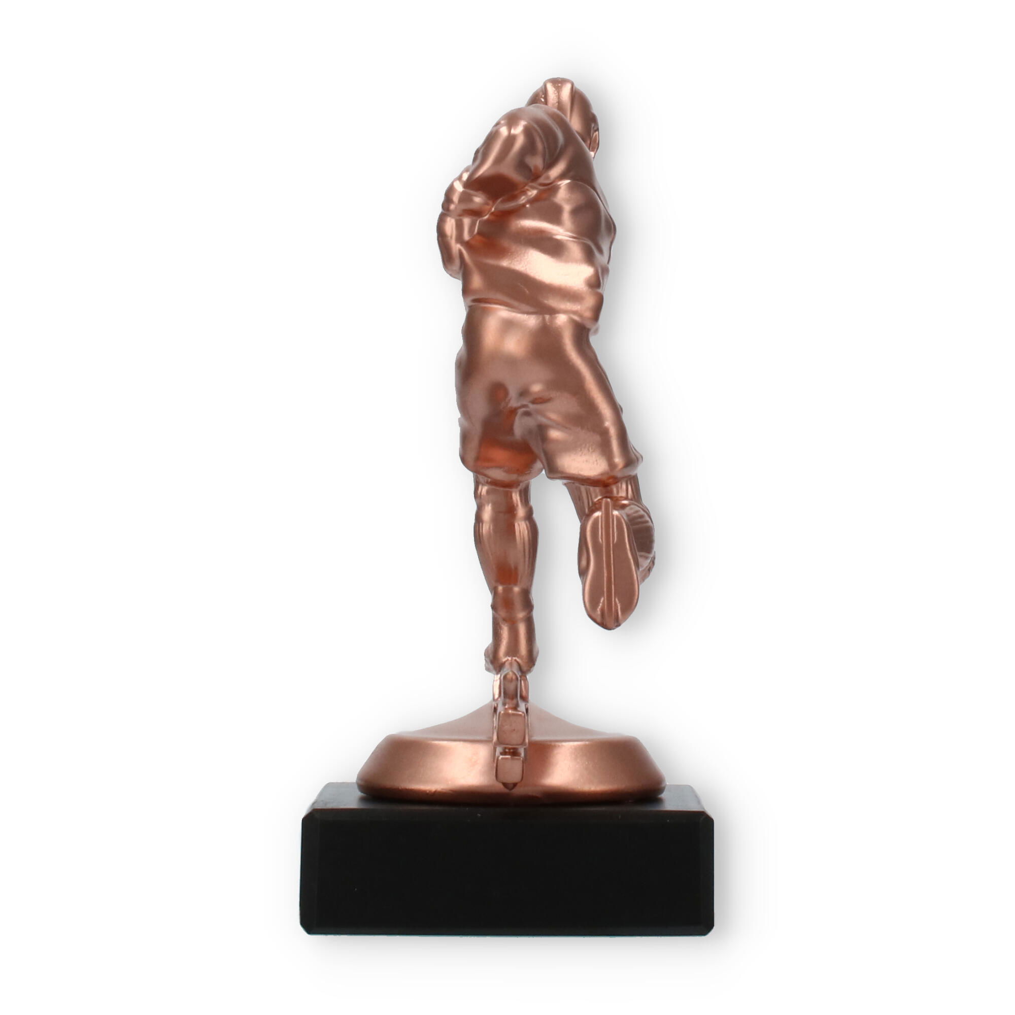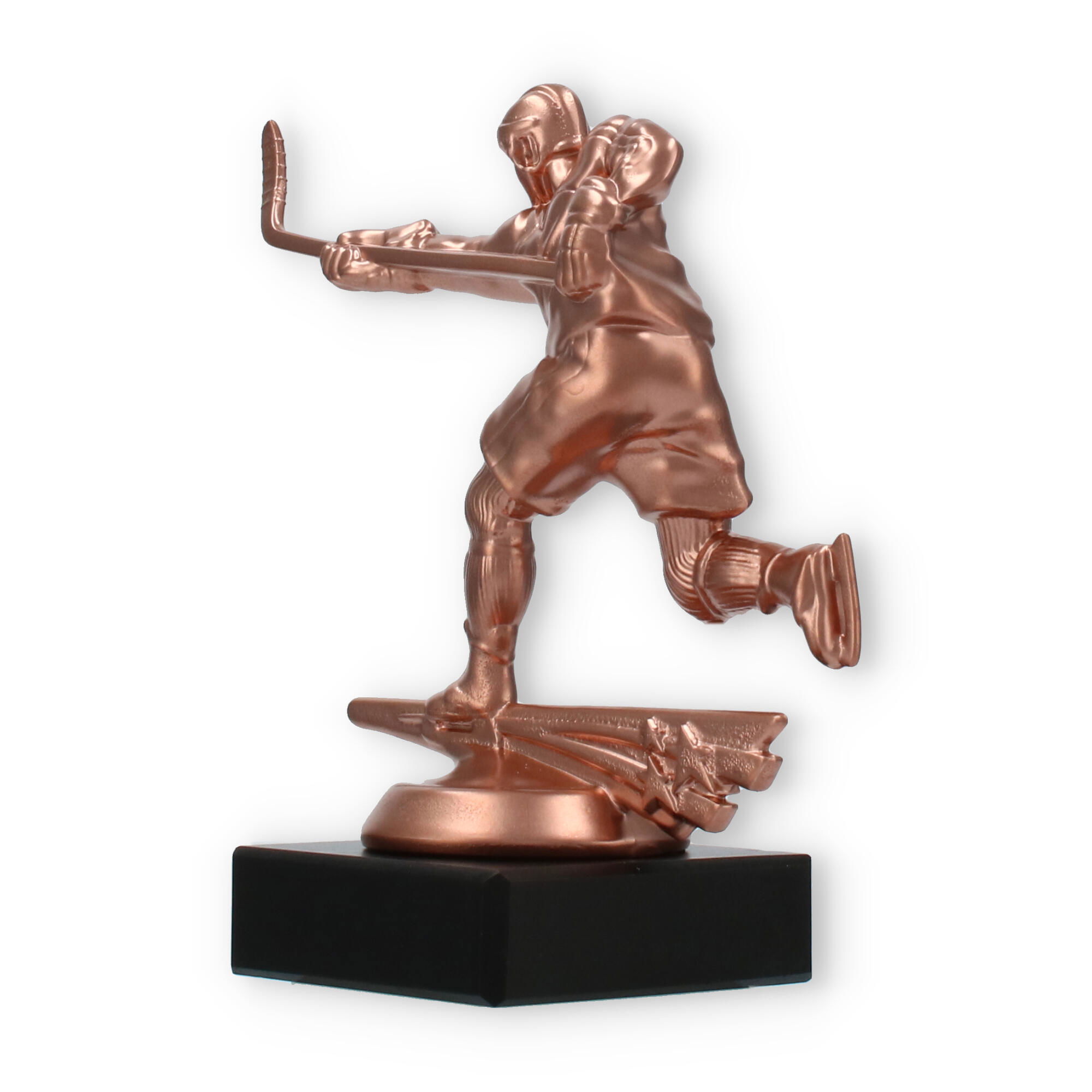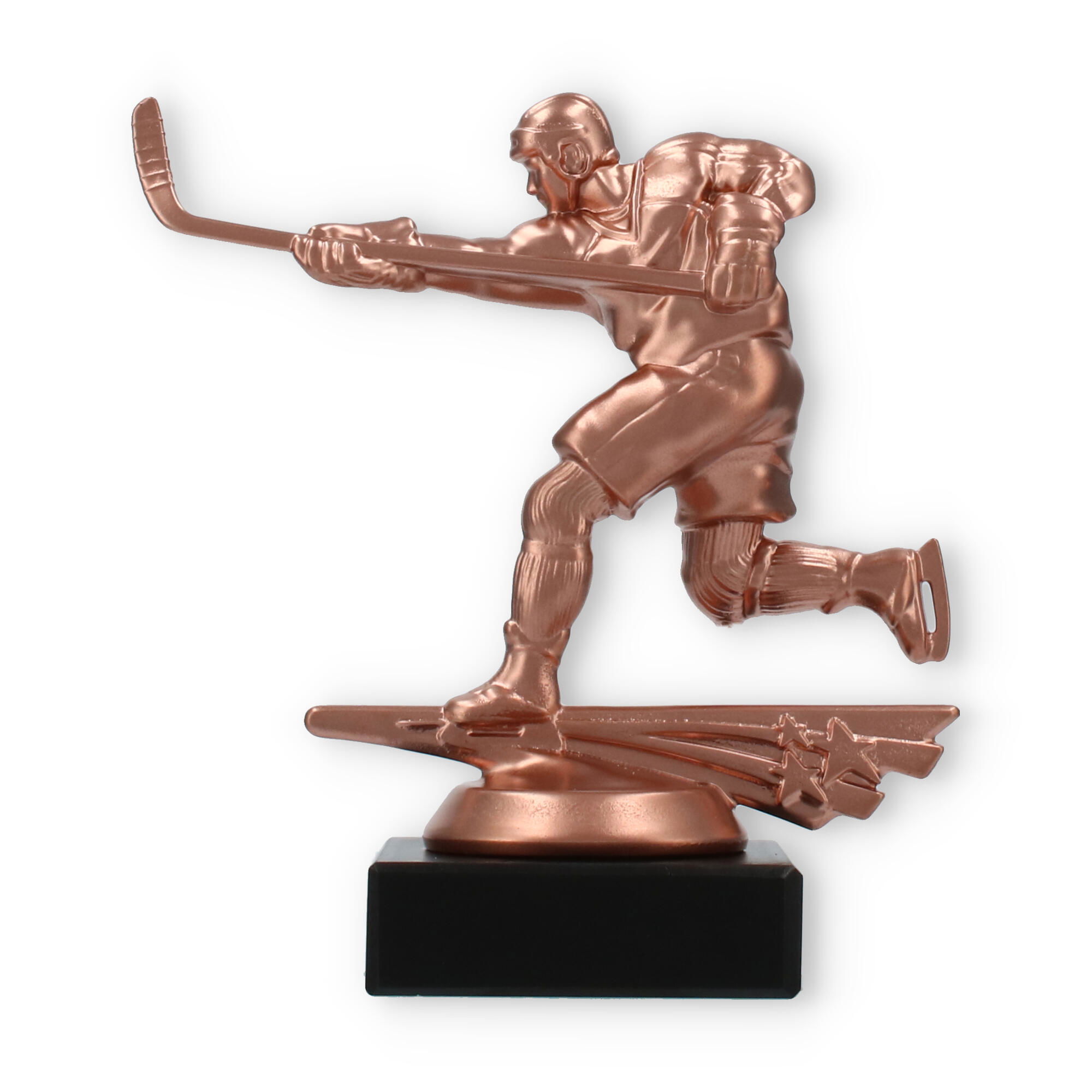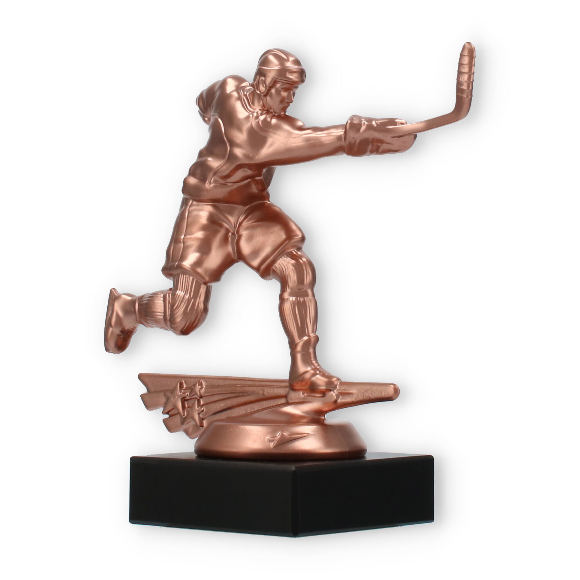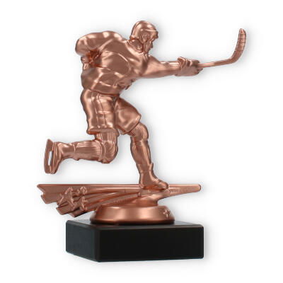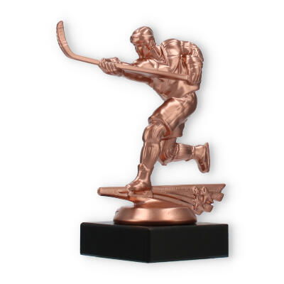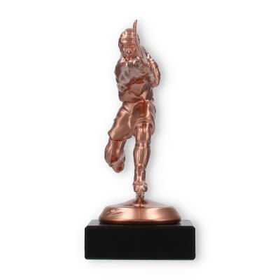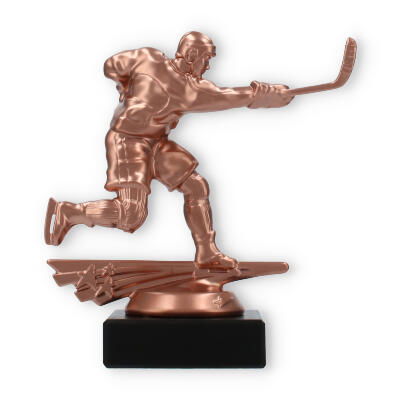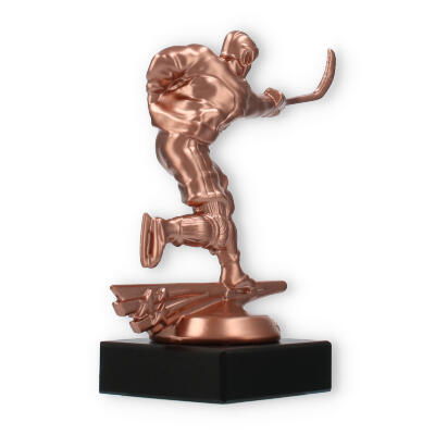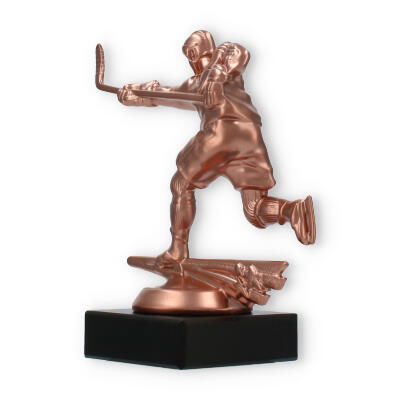 En dristig og detaljeret præsentation - denne ishockeypokal i bronzefarvet look fanger øjeblikket, hvor spilleren i fuld action rammer pucken. Figuren, der er 13,8 cm høj, er omhyggeligt udformet med linjer, der viser dragtens folder og udstyrets detaljer.