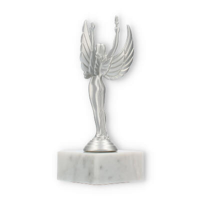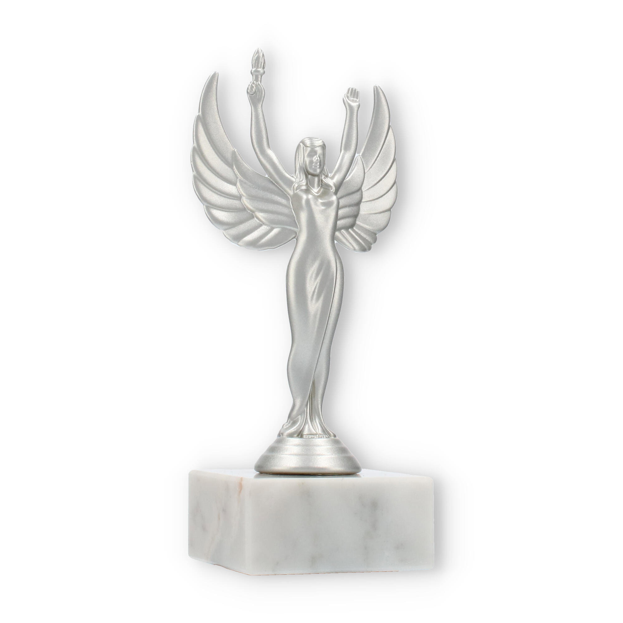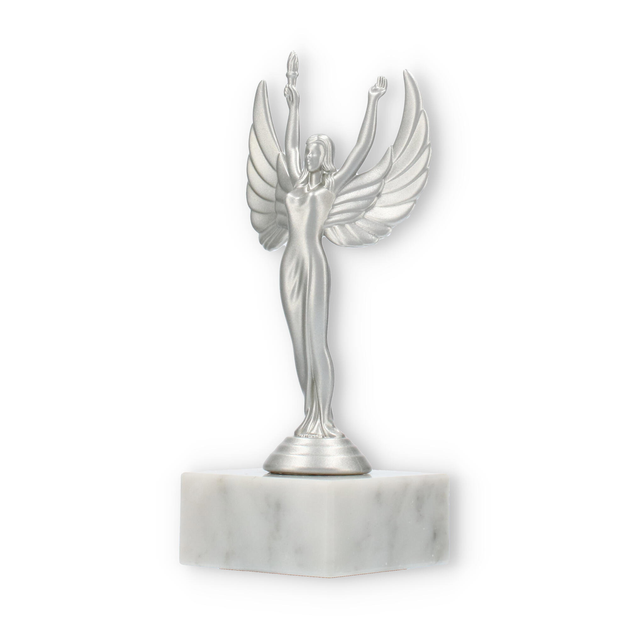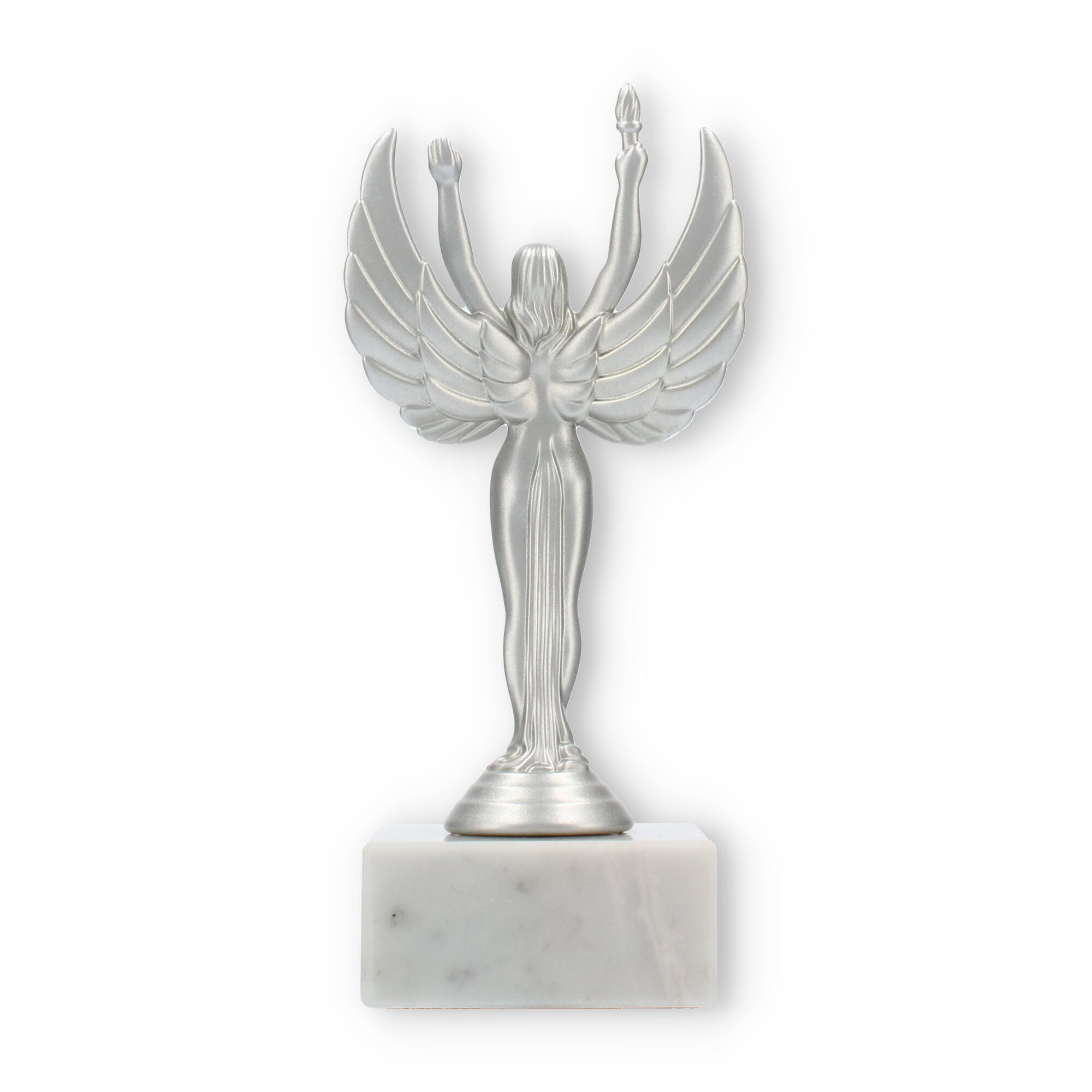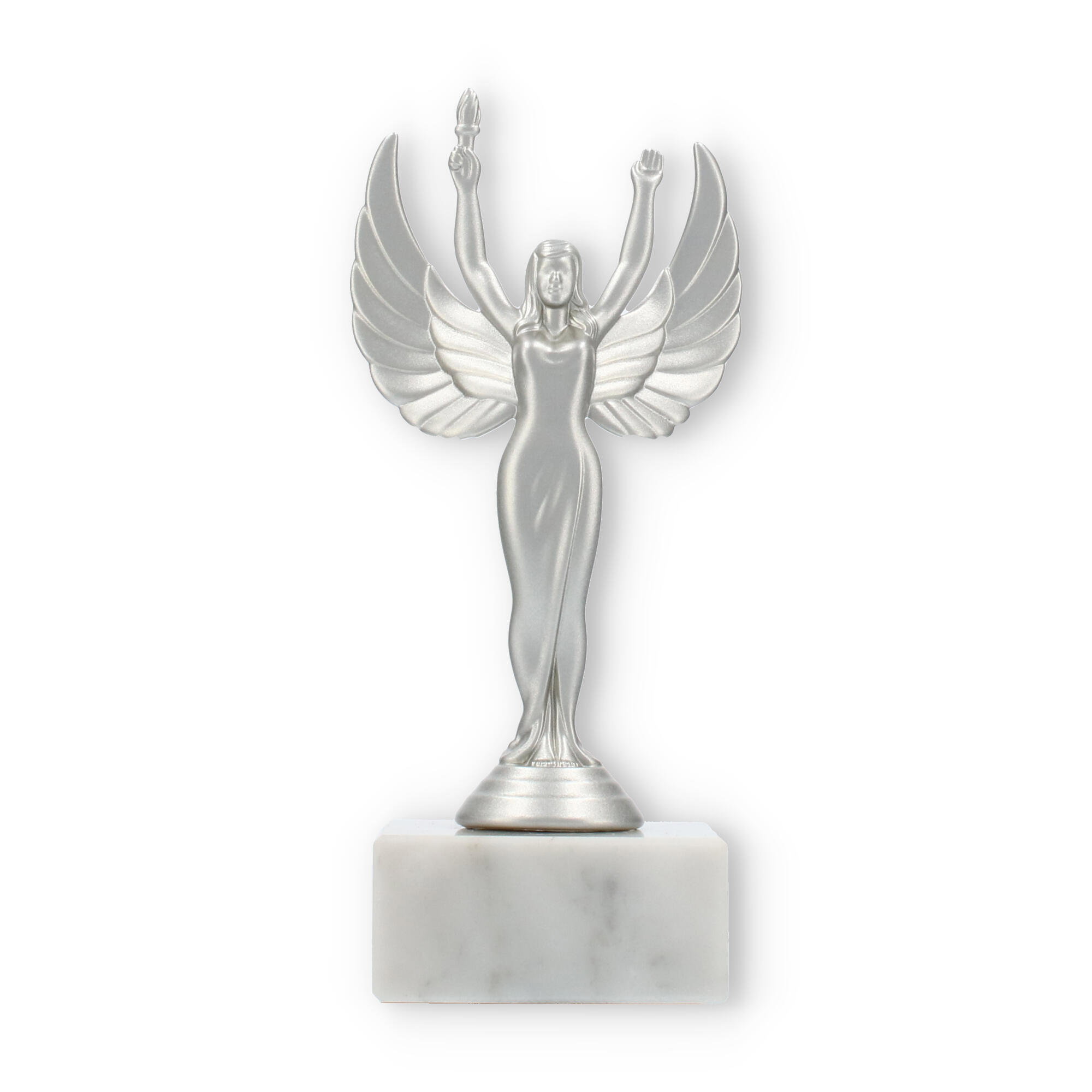 Sejrsgudinde-pokalen, skabt til at ære præstation, fremstår i en dramatisk sølvmetallic finish med en hvid marmorsokkel. Håndholdt fakkel og symmetriske vinger understreger dens elegante design. Fås i forskellige størrelser, og kan personliggøres med indgravering, hvilket gør den til det ideelle valg for prisoverrækkelser.