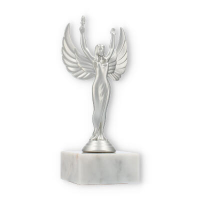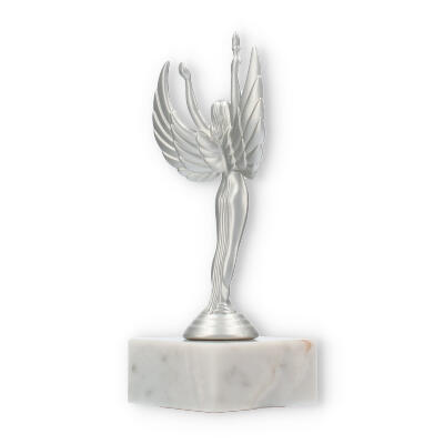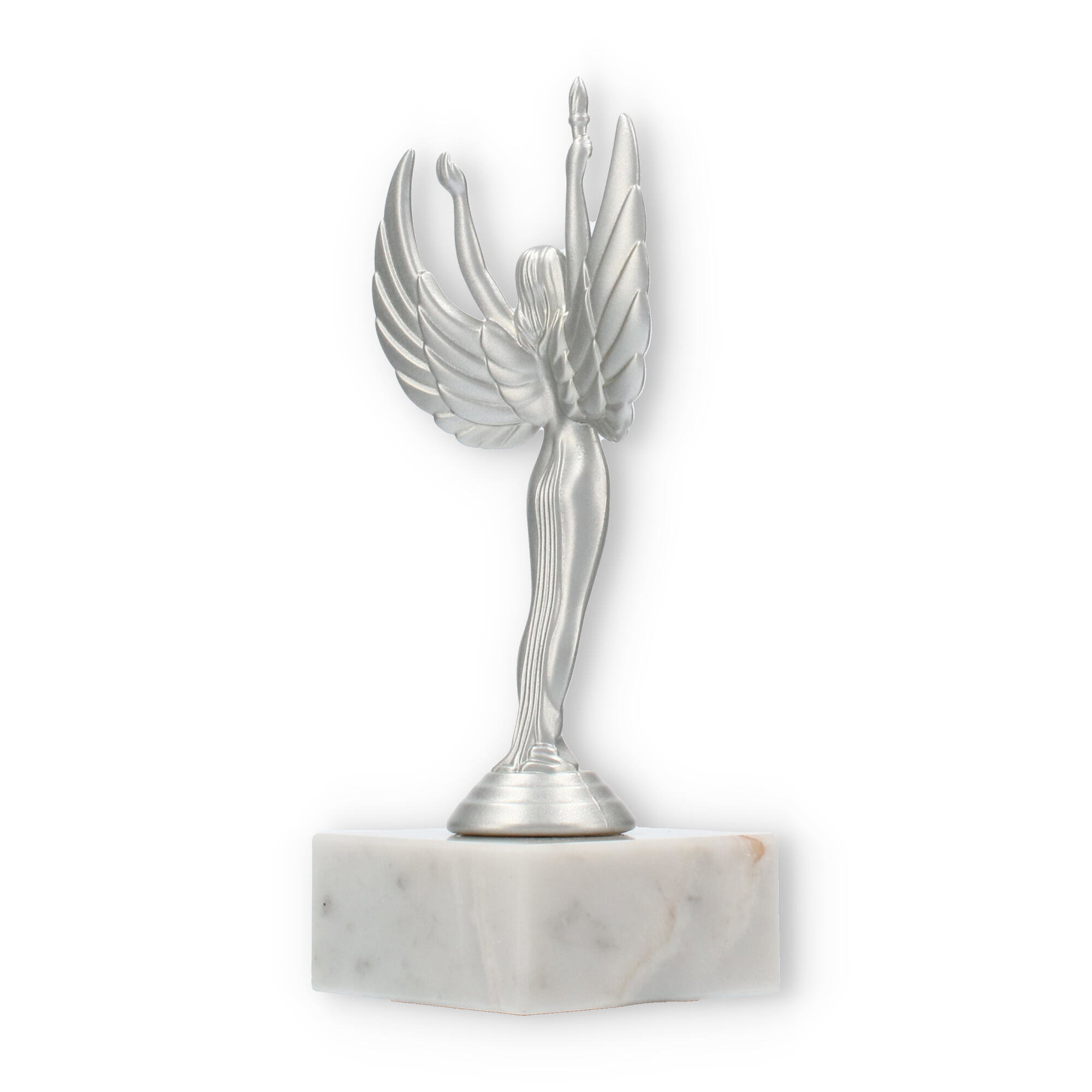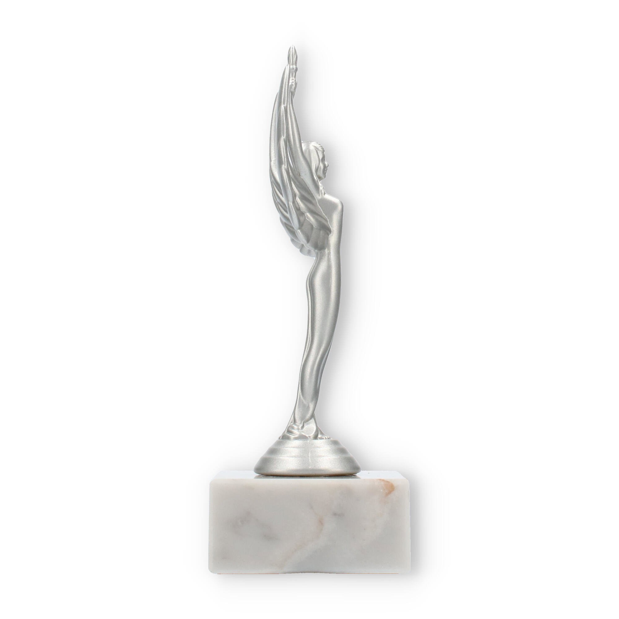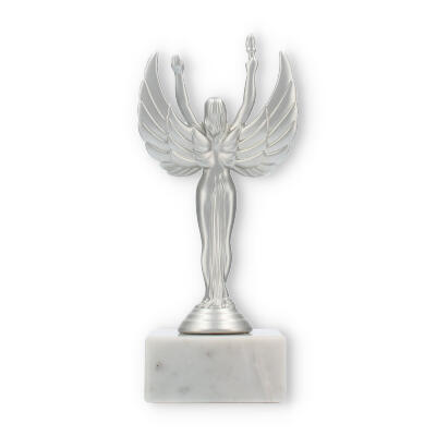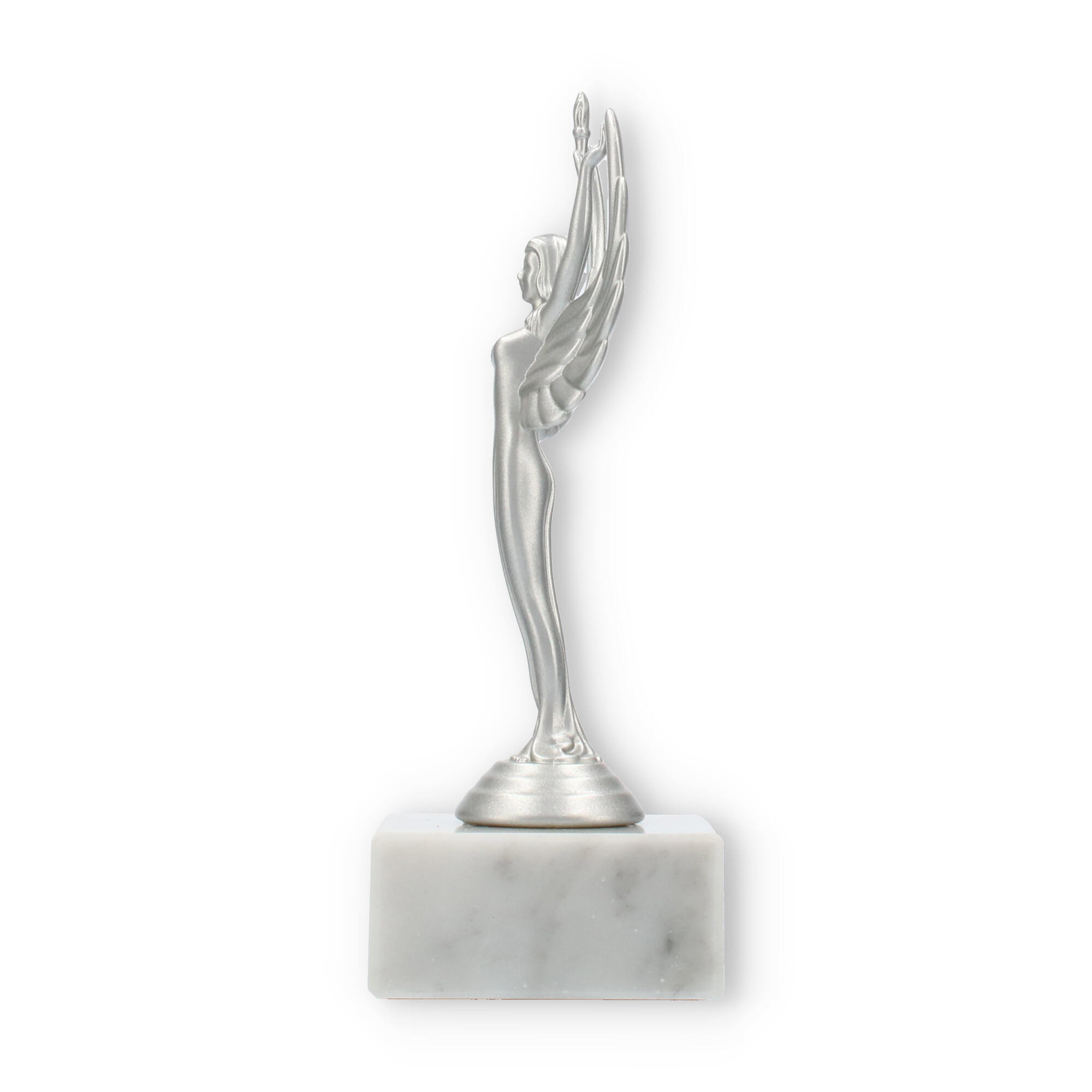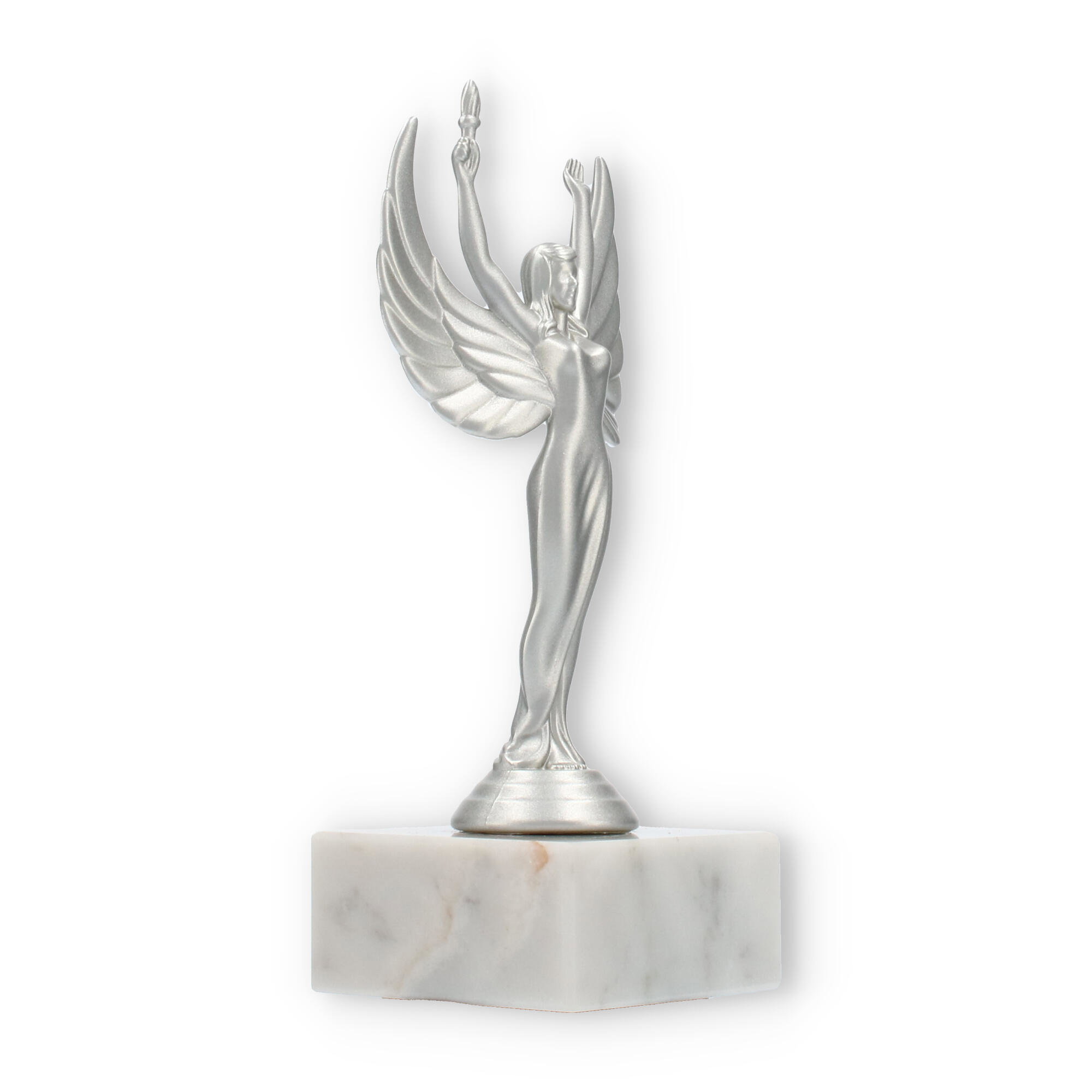 Sejrsgudinde-pokalen, skabt til at ære præstation, fremstår i en dramatisk sølvmetallic finish med en hvid marmorsokkel. Håndholdt fakkel og symmetriske vinger understreger dens elegante design. Fås i forskellige størrelser, og kan personliggøres med indgravering, hvilket gør den til det ideelle valg for prisoverrækkelser.