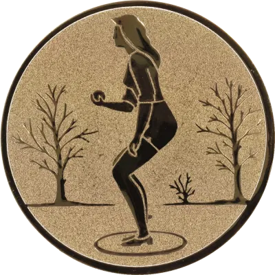 The bronze embossed aluminum emblem 25mm - Petanque ladies showcases an exquisite representation of a lady in action. This emblem features a meticulously detailed engraving of a woman holding a ball, surrounded by stylized leafless trees, giving it an elegant and unique touch.