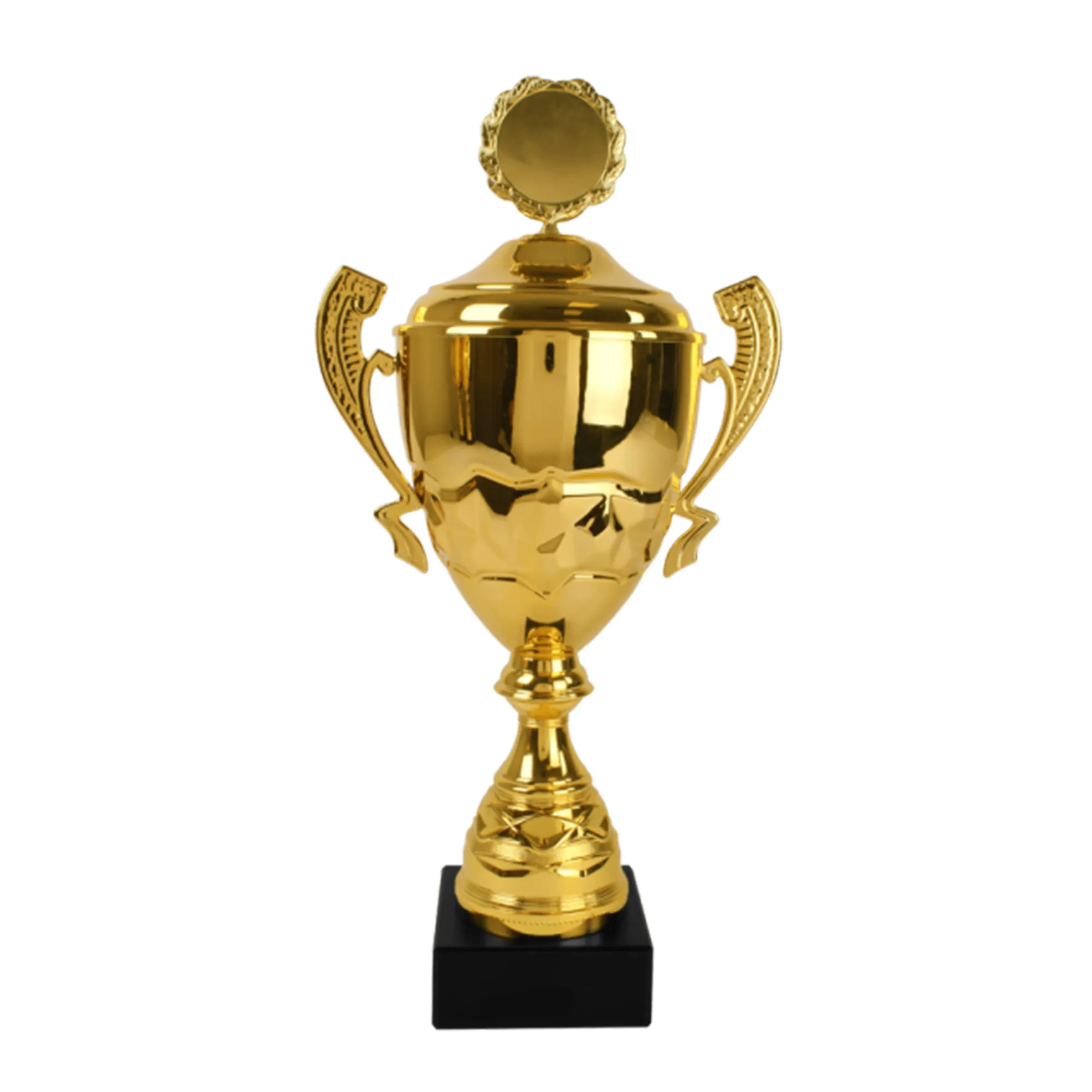 At the pinnacle of the trophy is a round, waved lid with a medallion featuring a serrated edge, which enhances its sophisticated appearance. This decorative detail adds a layer of depth and is perfect for additional personalization, completing the trophy's distinguished style.
