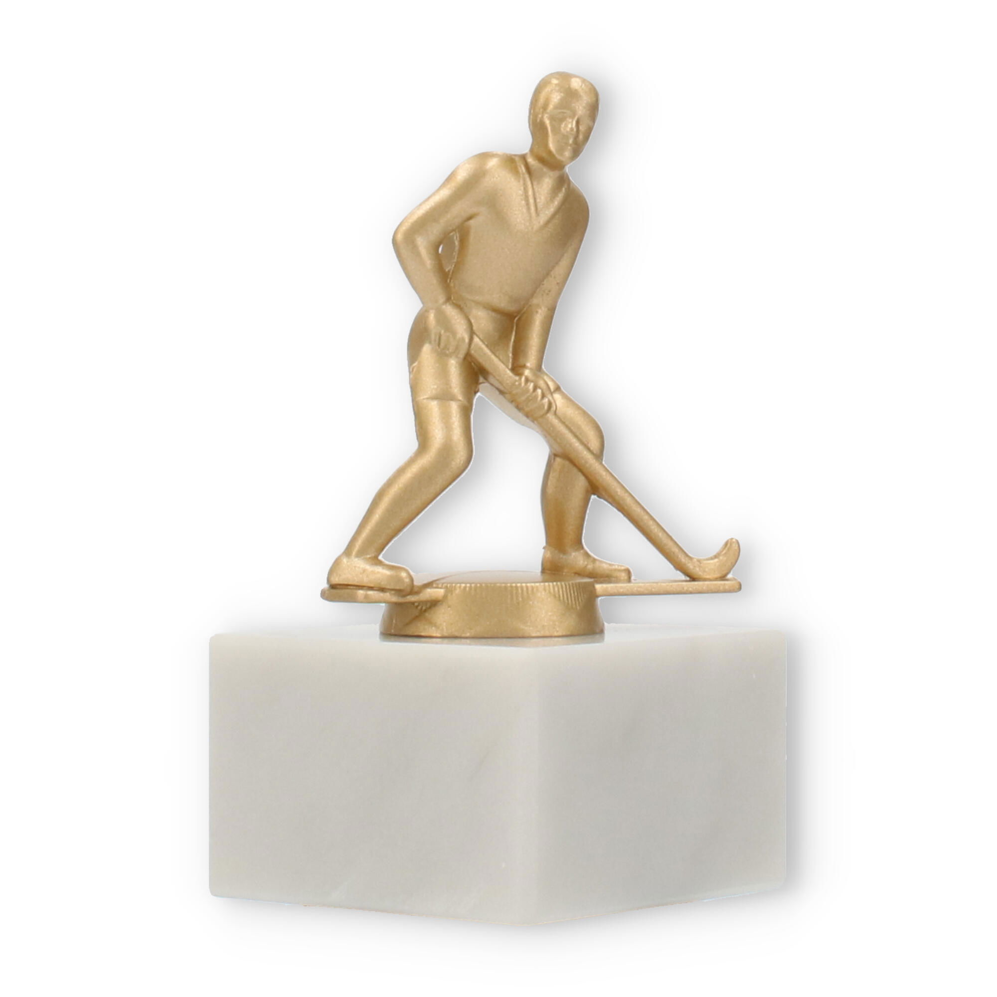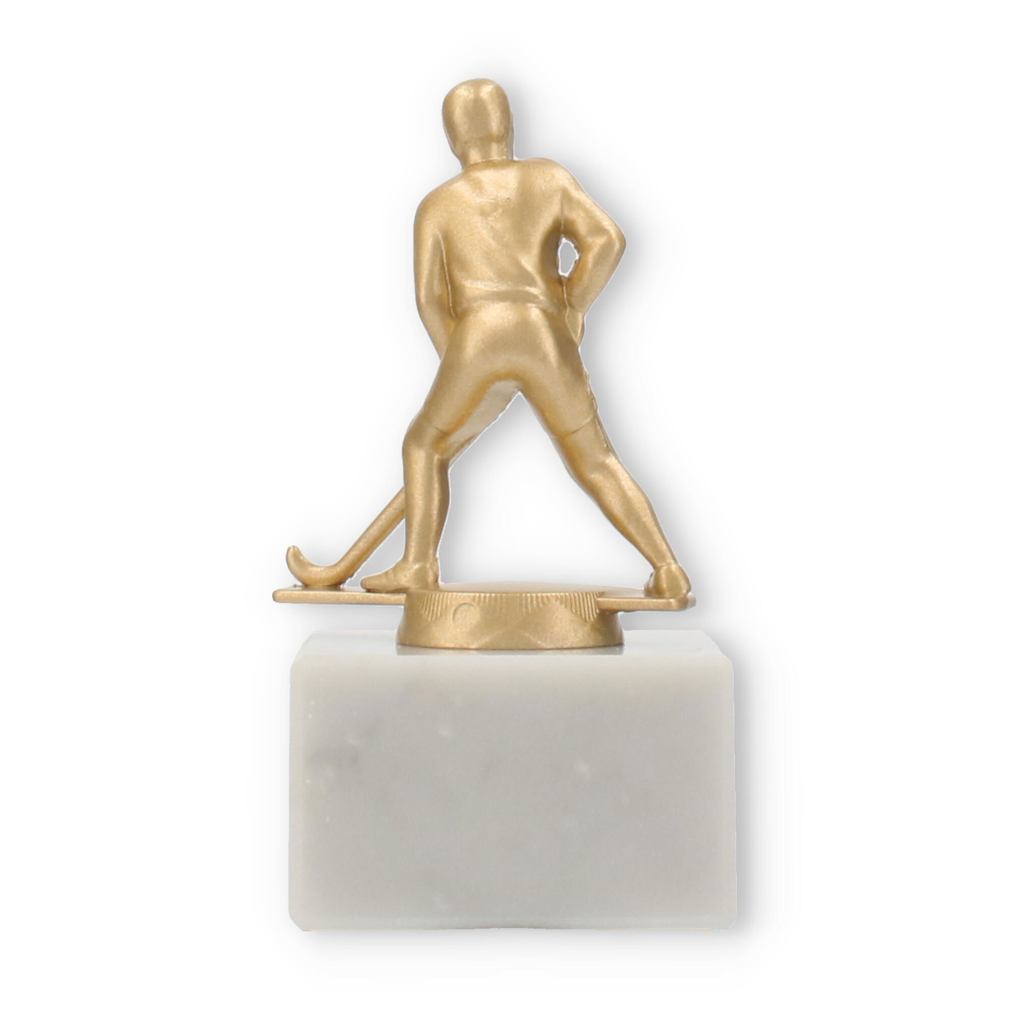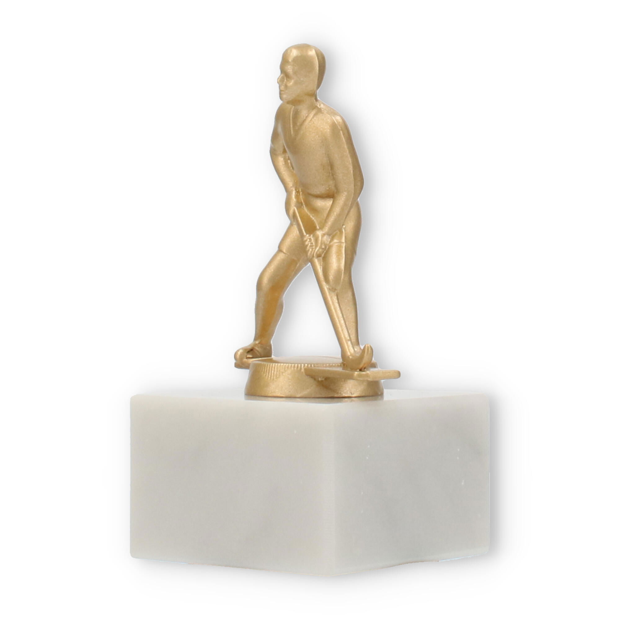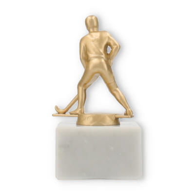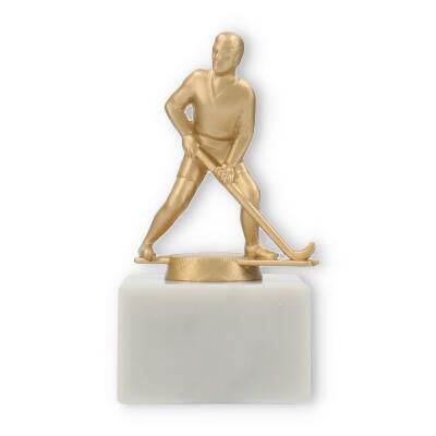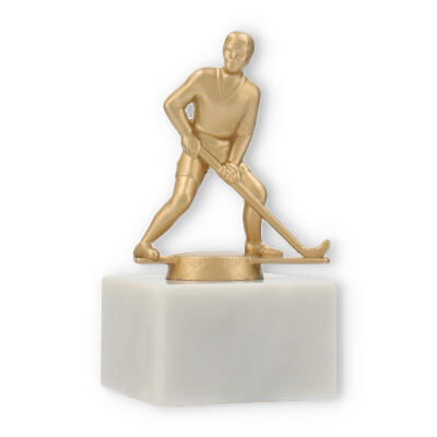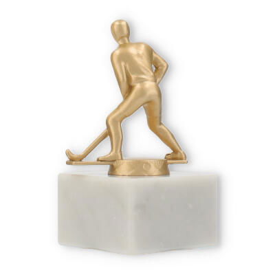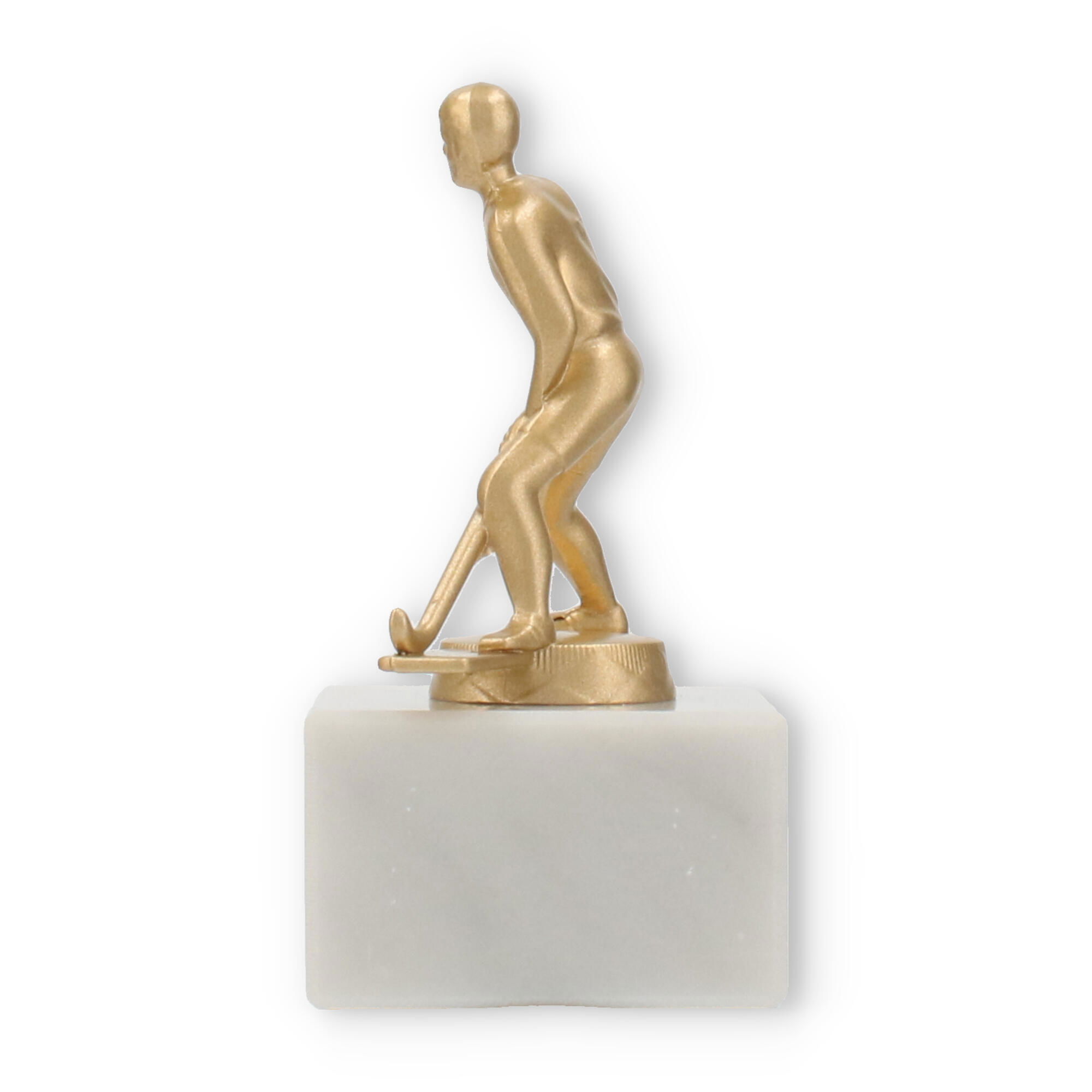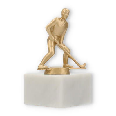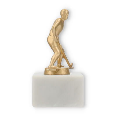 Introducing the distinguished Trophy metal figure field hockey gold metallic on white marble base 12.5cm. This trophy is designed to celebrate the energetic spirit of field hockey tournaments and to honor the extraordinary skills of the champions.