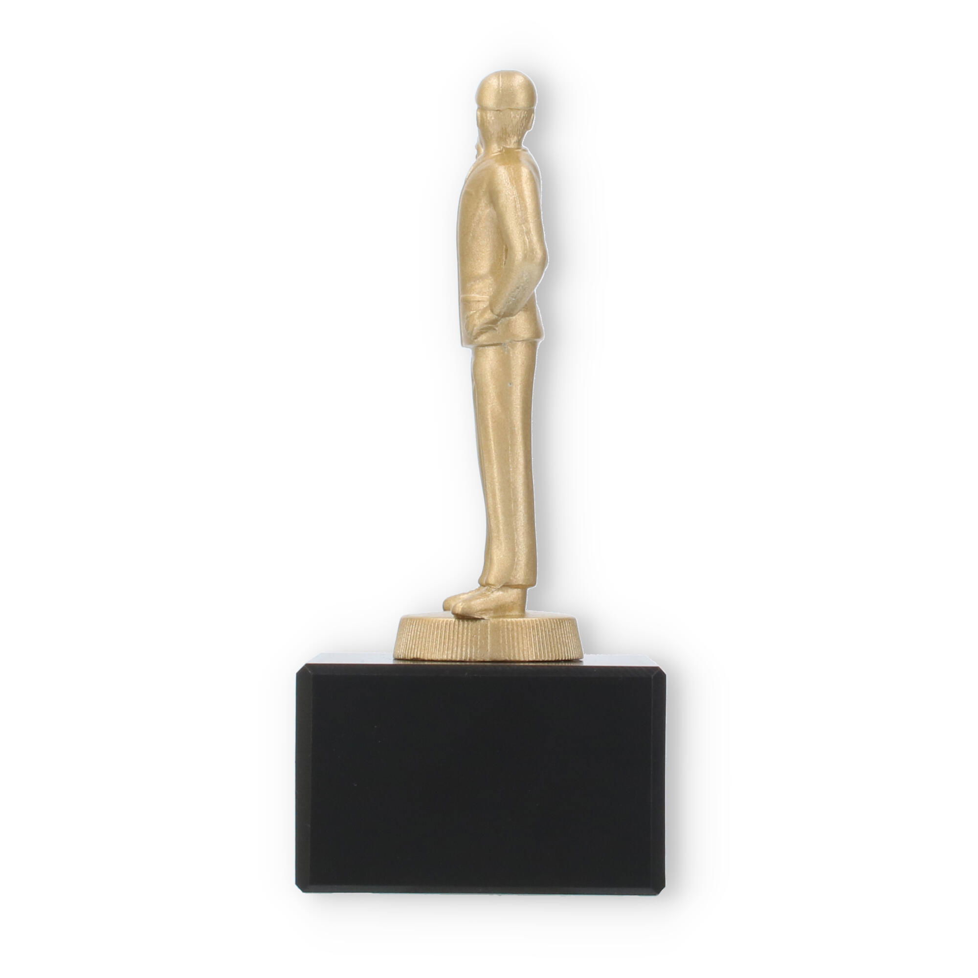 The base, crafted from solid black marble, provides a sturdy foundation and a striking contrast to the gold-colored figure above. The natural veins of the marble add to the unique aesthetic appeal, ensuring each trophy is slightly different from the other, just like each winner’s journey.