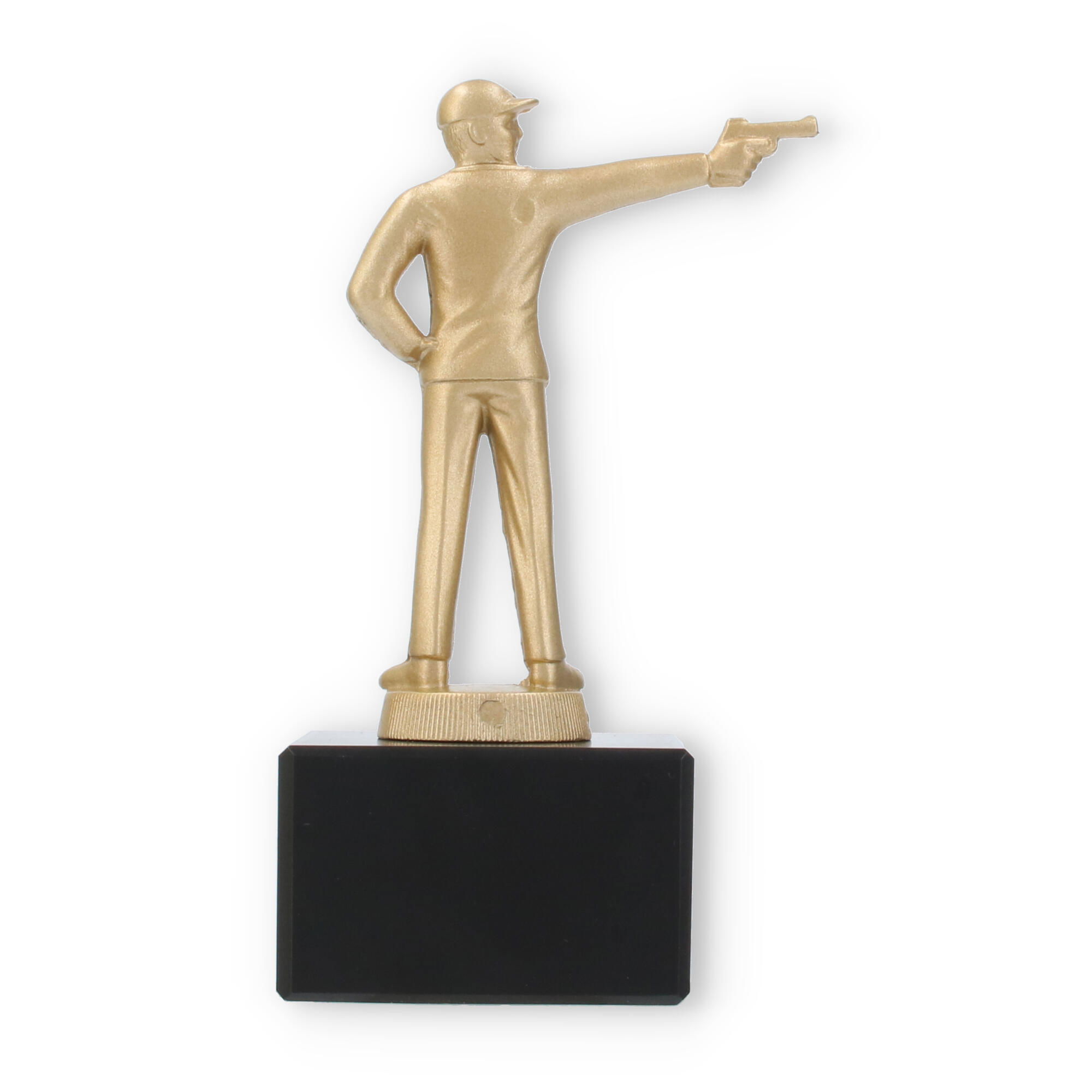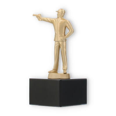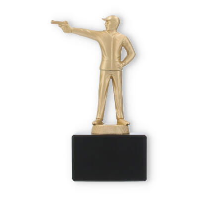 Standing at 15.0 cm tall, this trophy is perfectly proportioned to convey a sense of grandeur and achievement. The figurine, designed to represent a poised shooter in action, holds a pistol with determined focus, exemplifying dedication and skill.