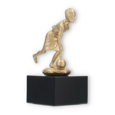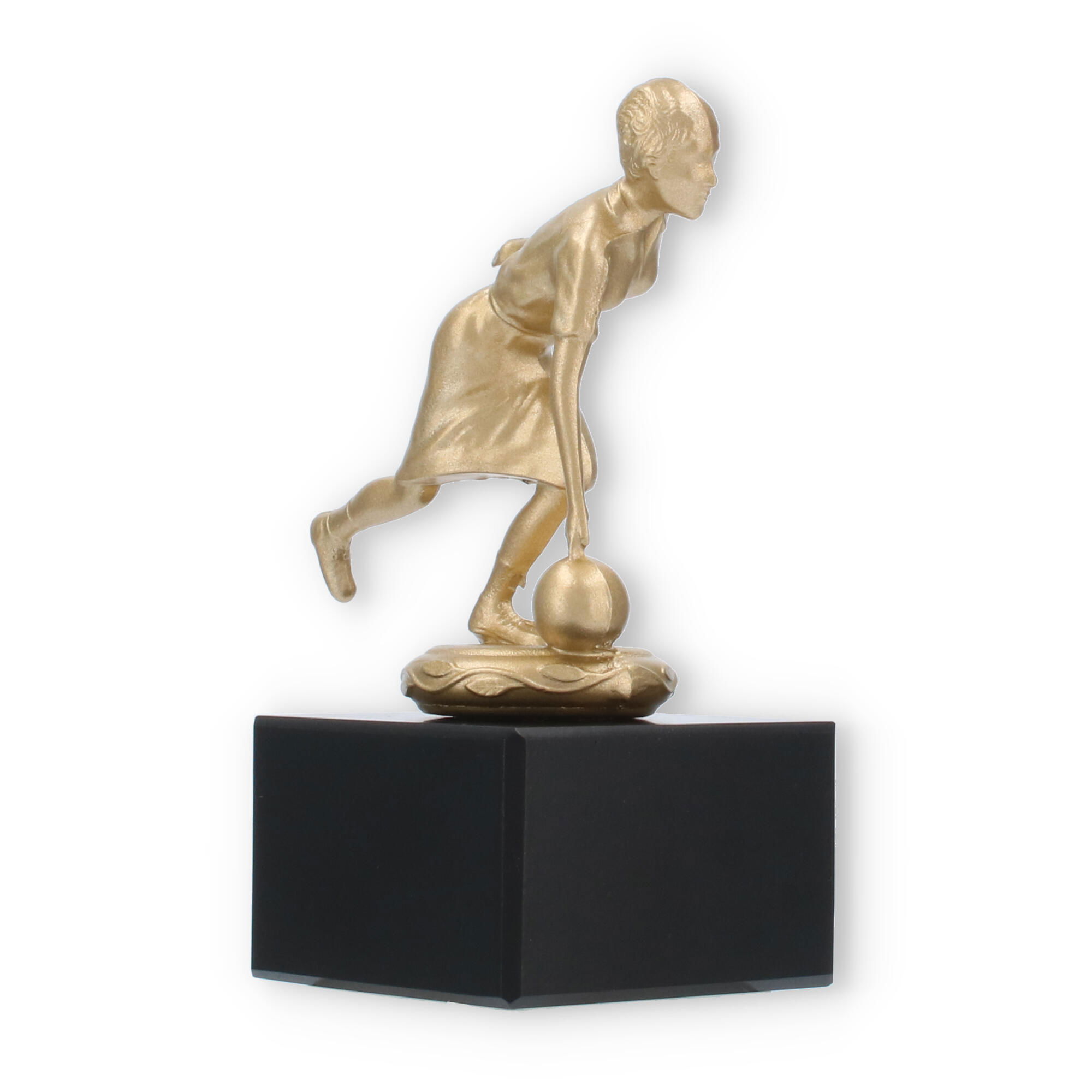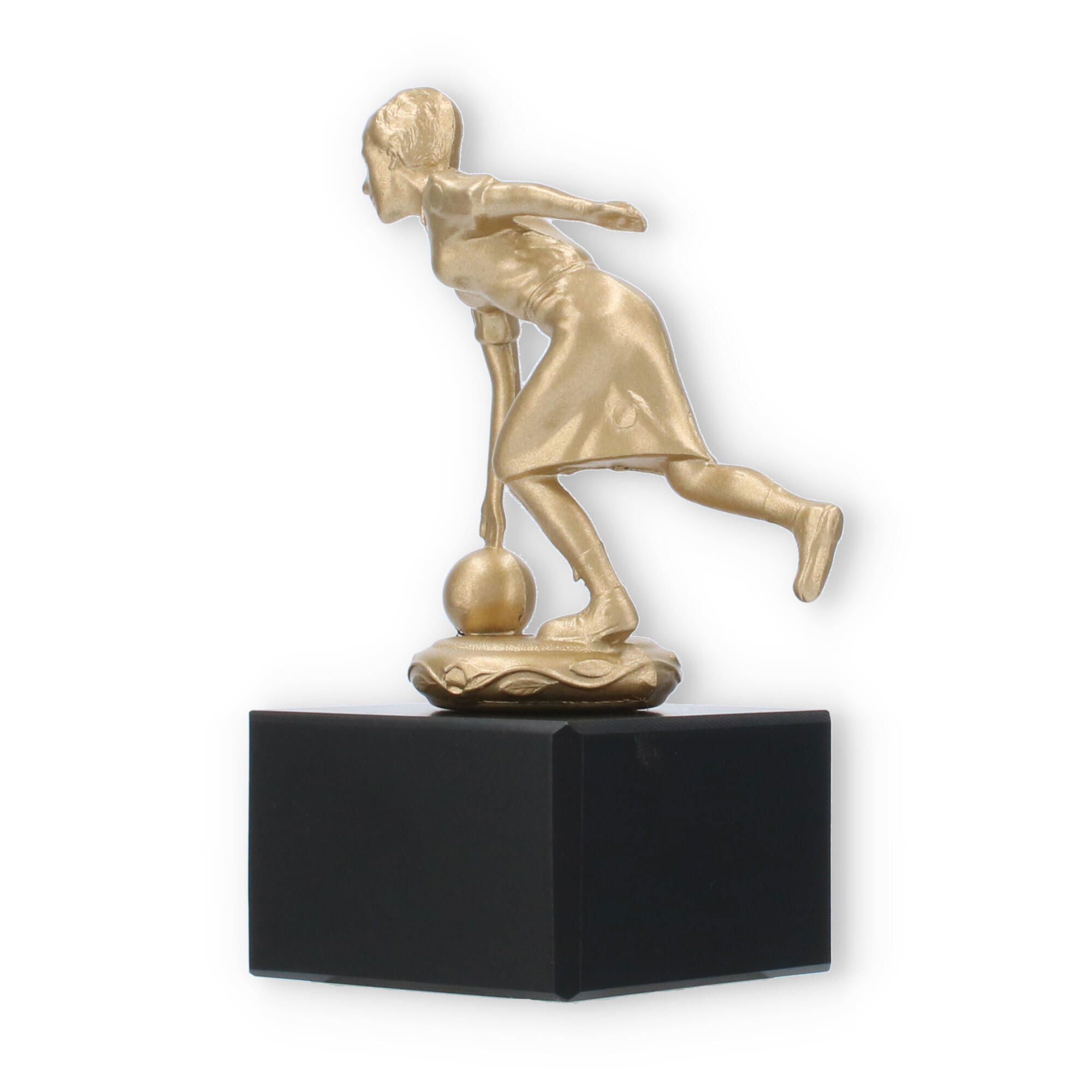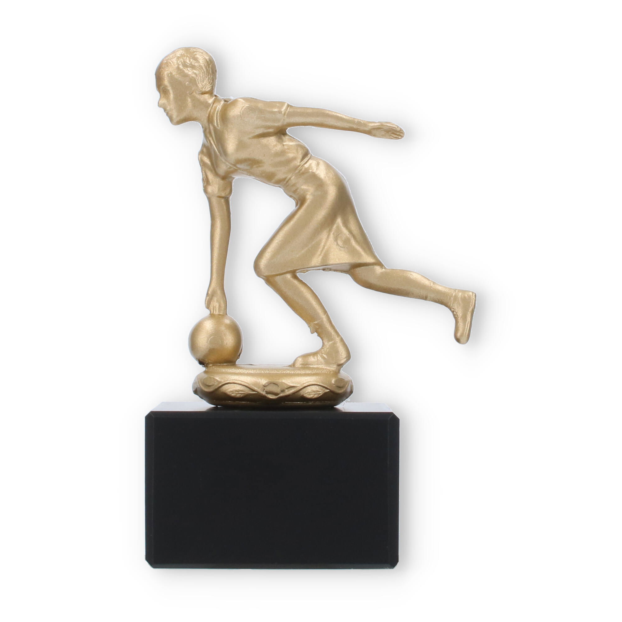 The detailed craftsmanship of the Skittles Ladies figure showcases a dynamic sporting pose, making it a standout piece on any awards table. The base, made of sturdy black marble, provides a solid foundation, adding to its sophisticated look. Each trophy comes with a customizable gold-colored engraving plate, allowing you to add a personal touch for every winner.