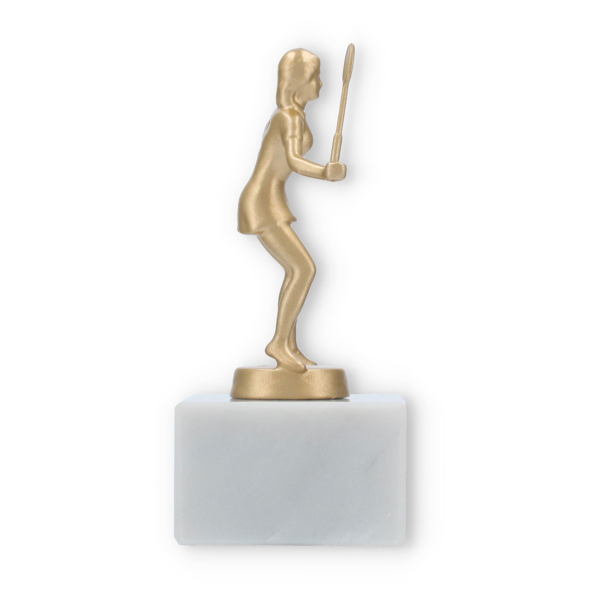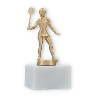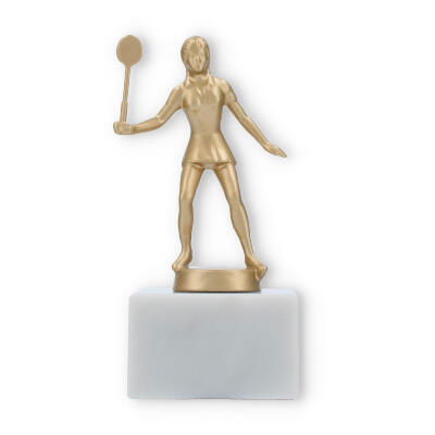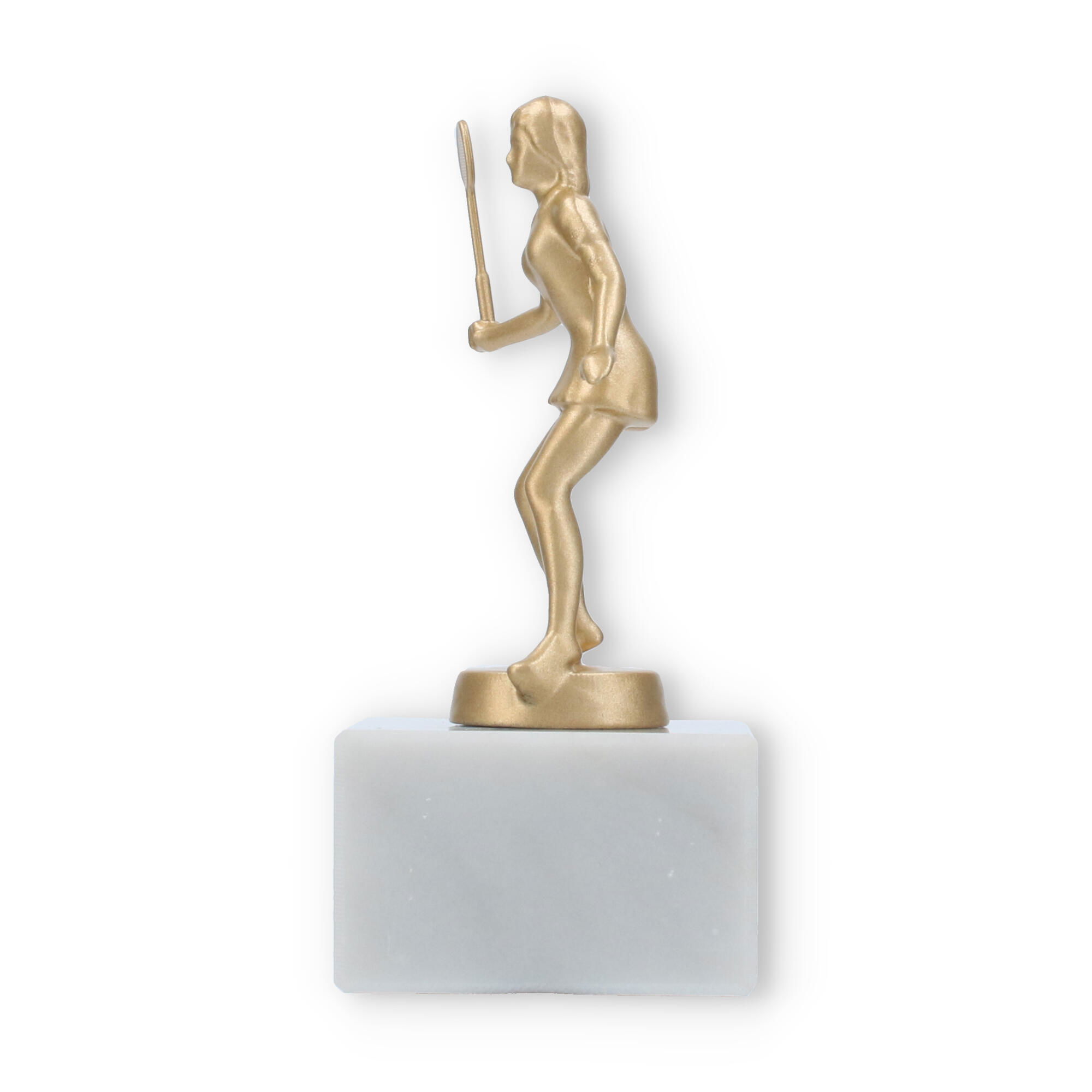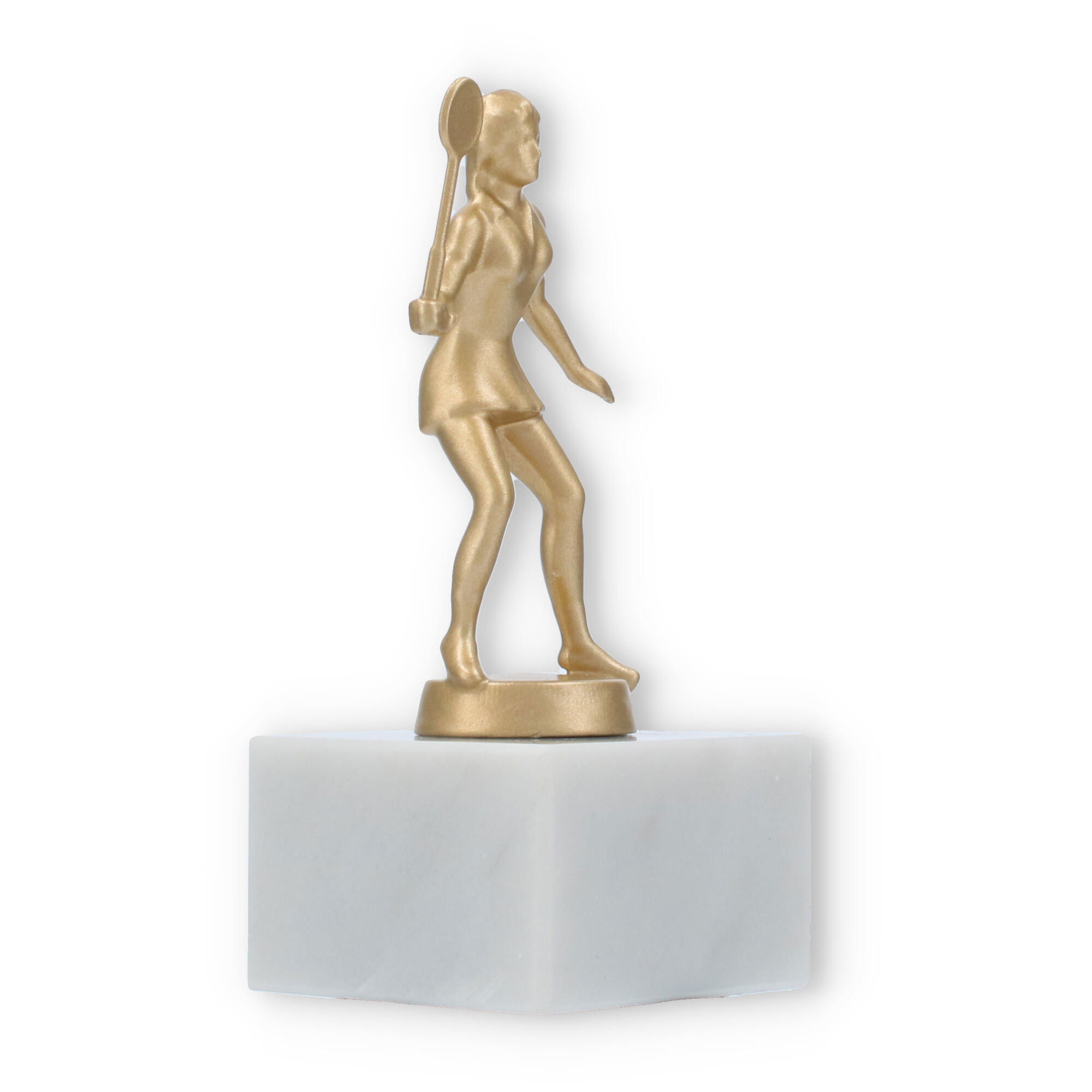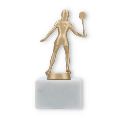 The trophy metal figure squash ladies, standing 14.0 cm tall, is an excellent way to honor champions. Designed for squash, it features a gold-colored figure and a sturdy white marble base. Personalize it with custom engraving for a lasting memento.