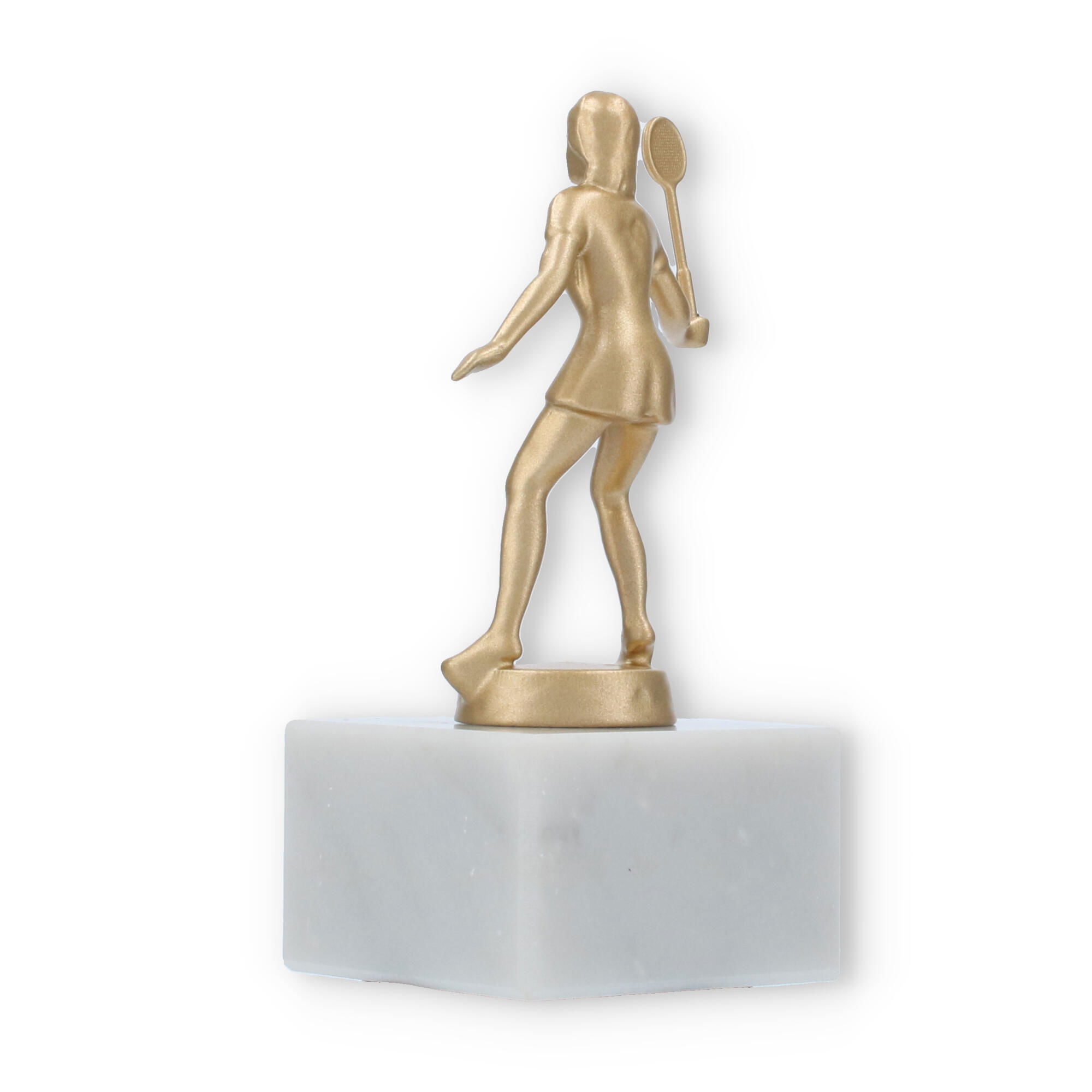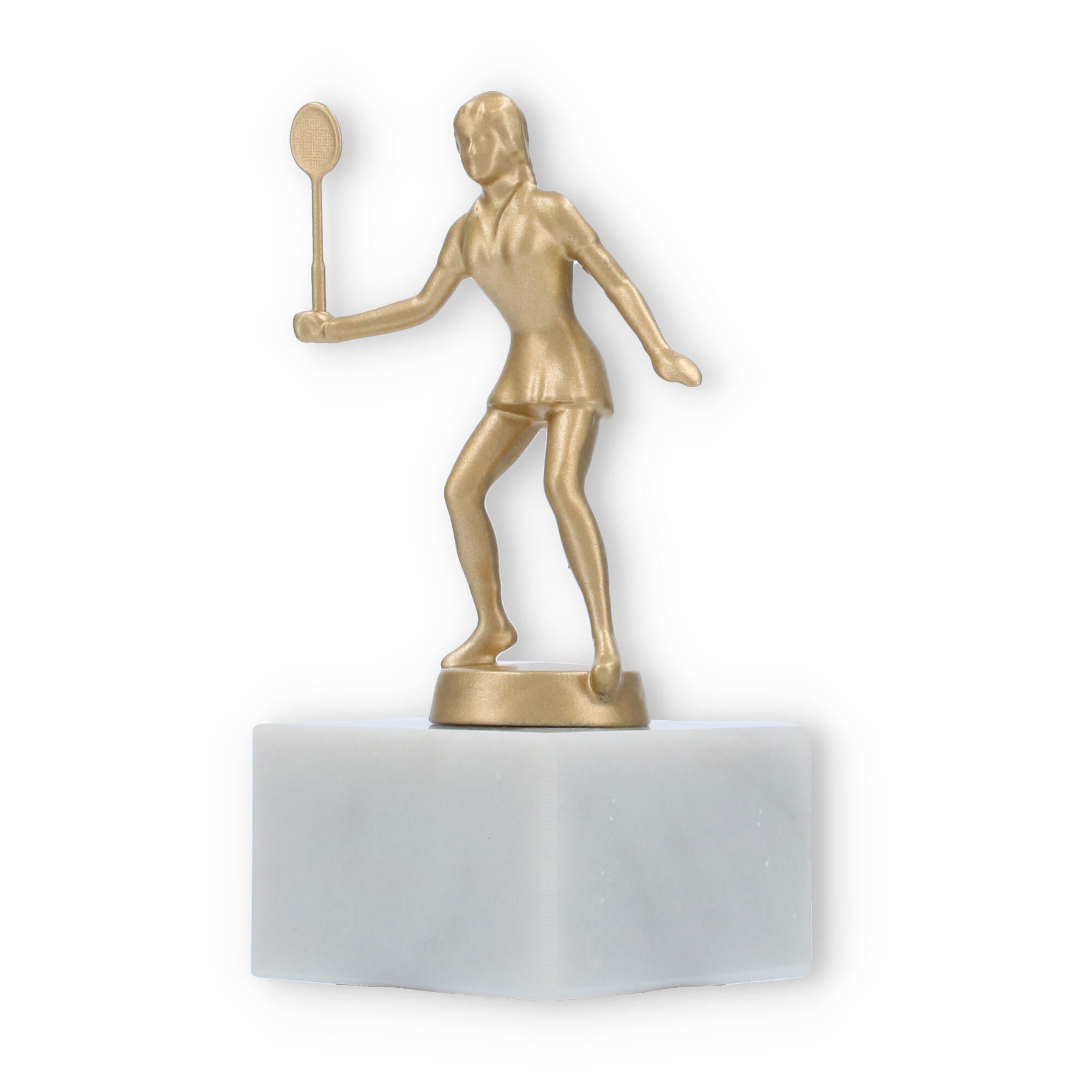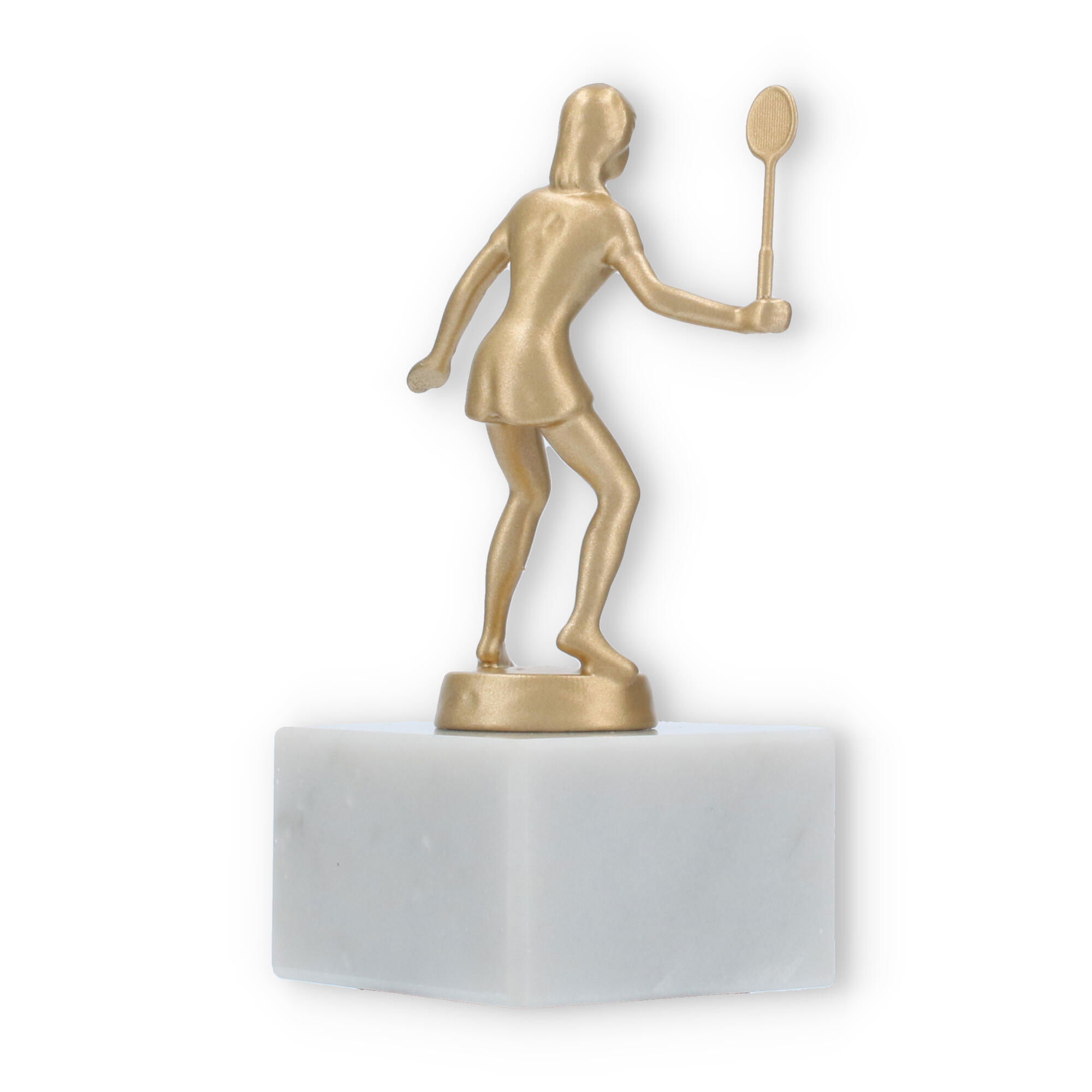 The trophy metal figure squash ladies, standing 14.0 cm tall, is an excellent way to honor champions. Designed for squash, it features a gold-colored figure and a sturdy white marble base. Personalize it with custom engraving for a lasting memento.