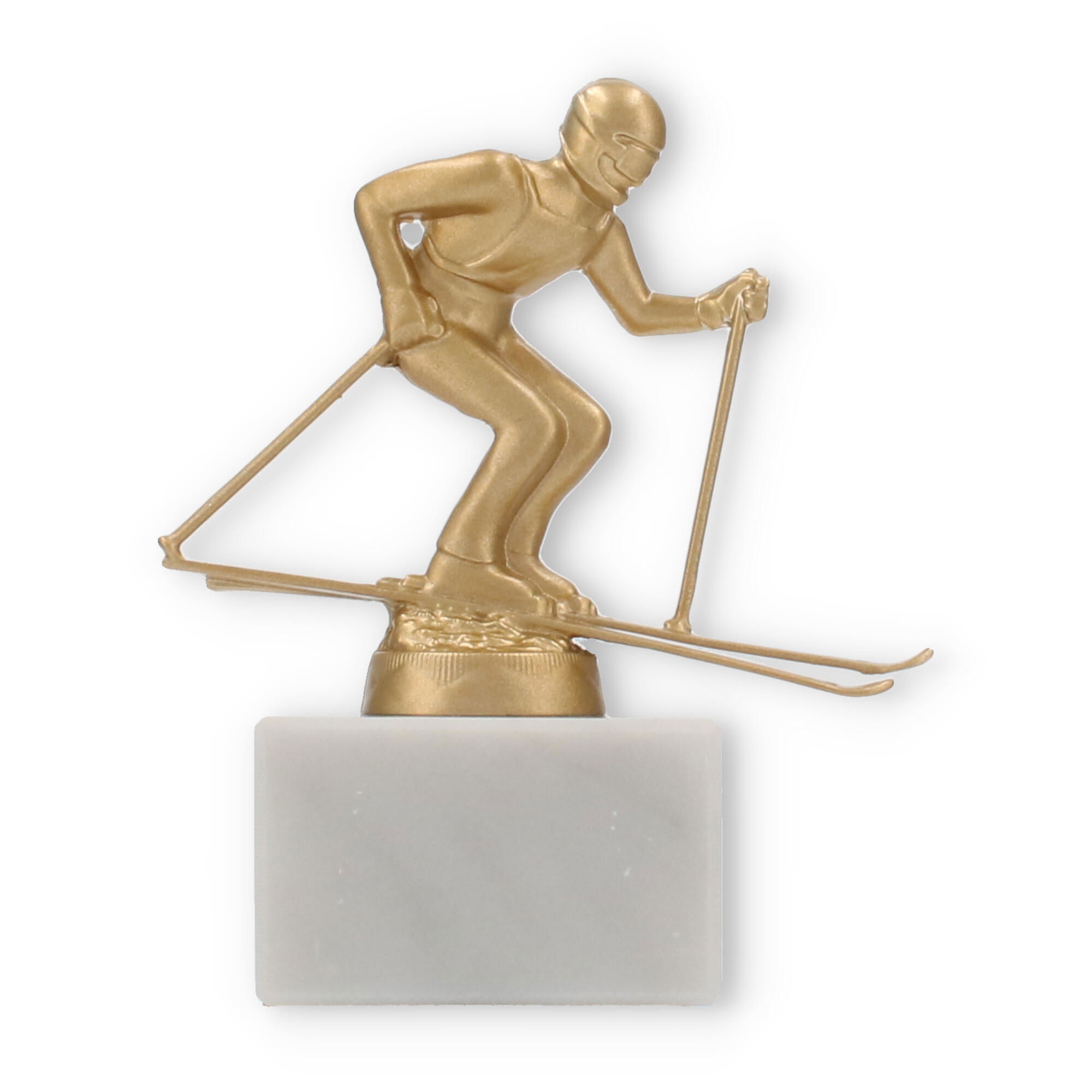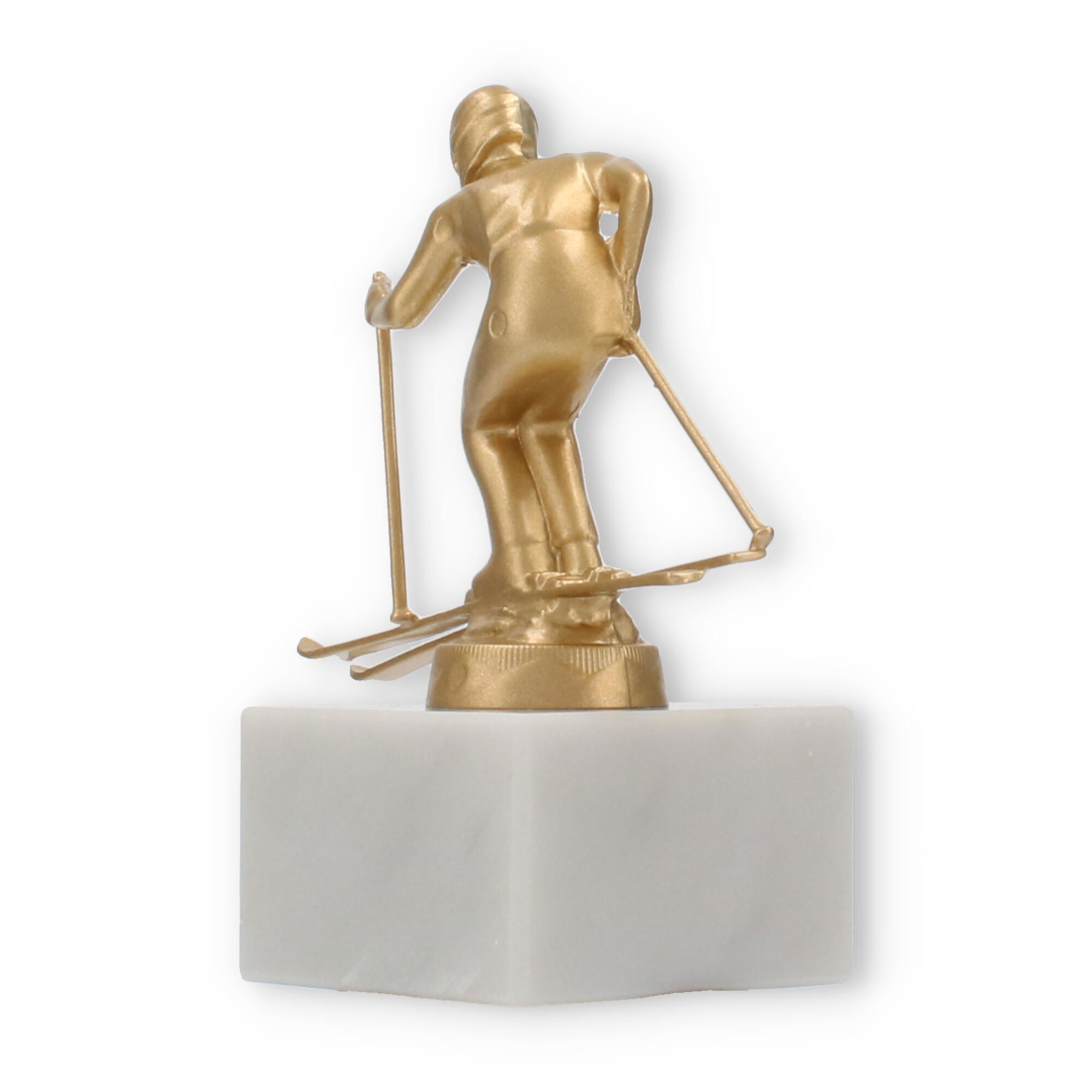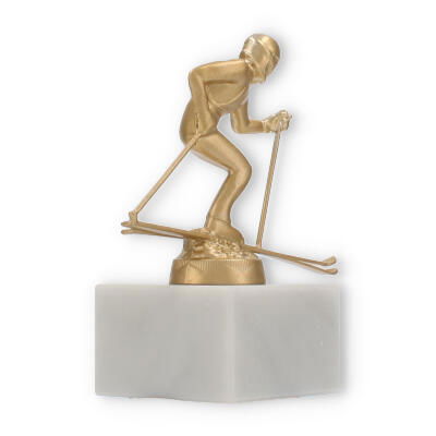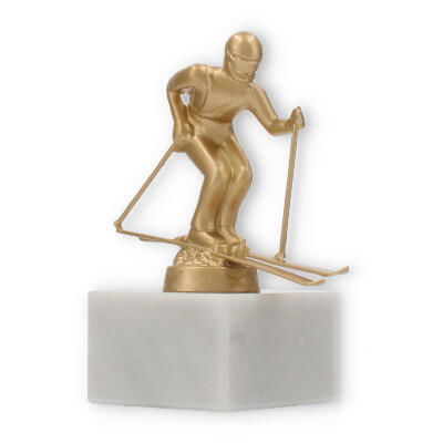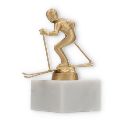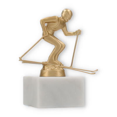 The base of this trophy is made from white marble, offering a robust and elegant foundation. The subtle gray veining typical of marble enhances its classic appeal, giving it a sophisticated look. On top of this base sits the gold-colored skier figure, made from a durable metal alloy. The figure, with its dynamic pose and detailed design, represents a skier in action, capturing a moment of triumph and athletic grace.