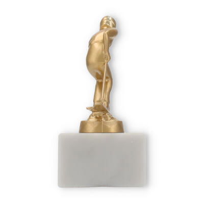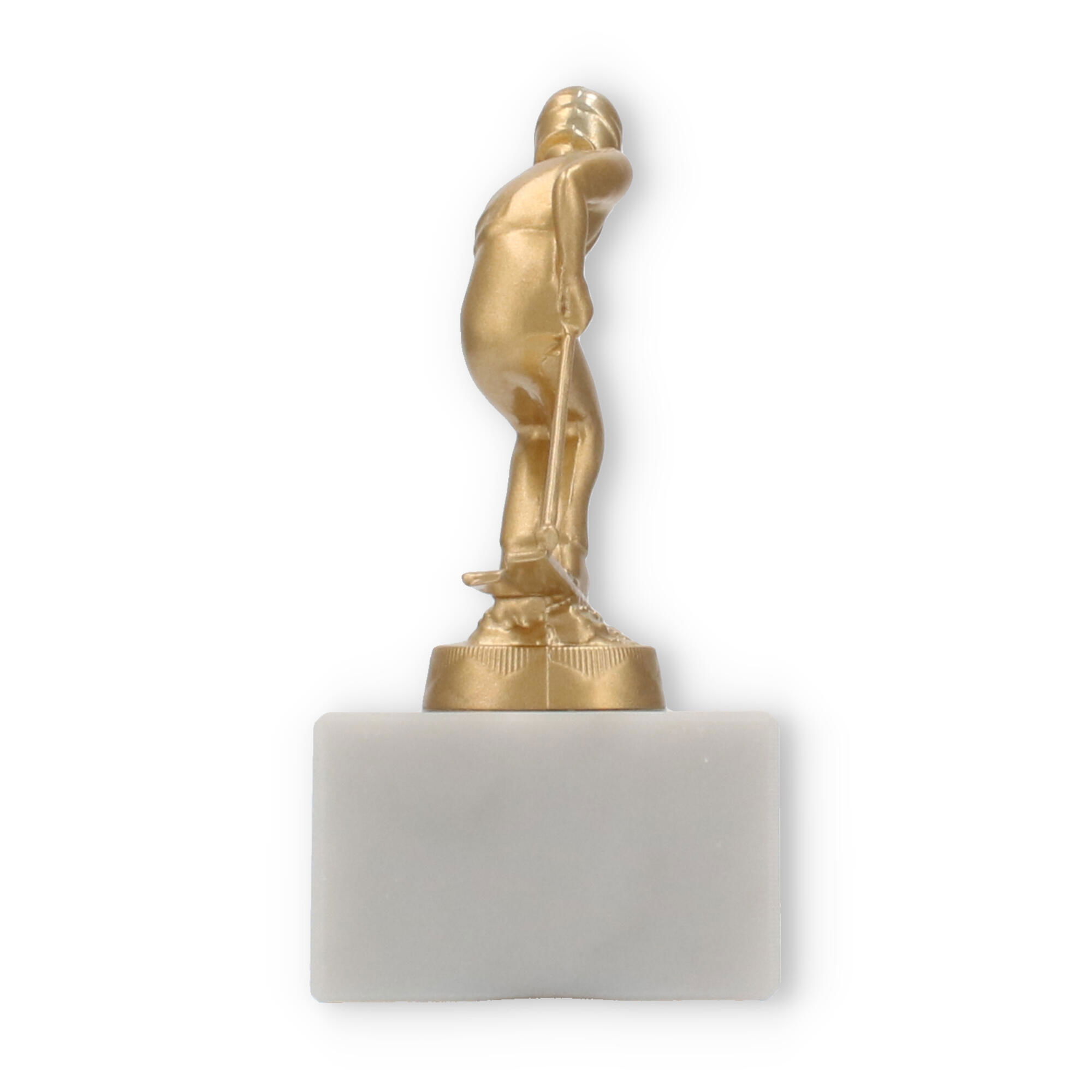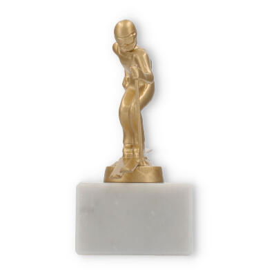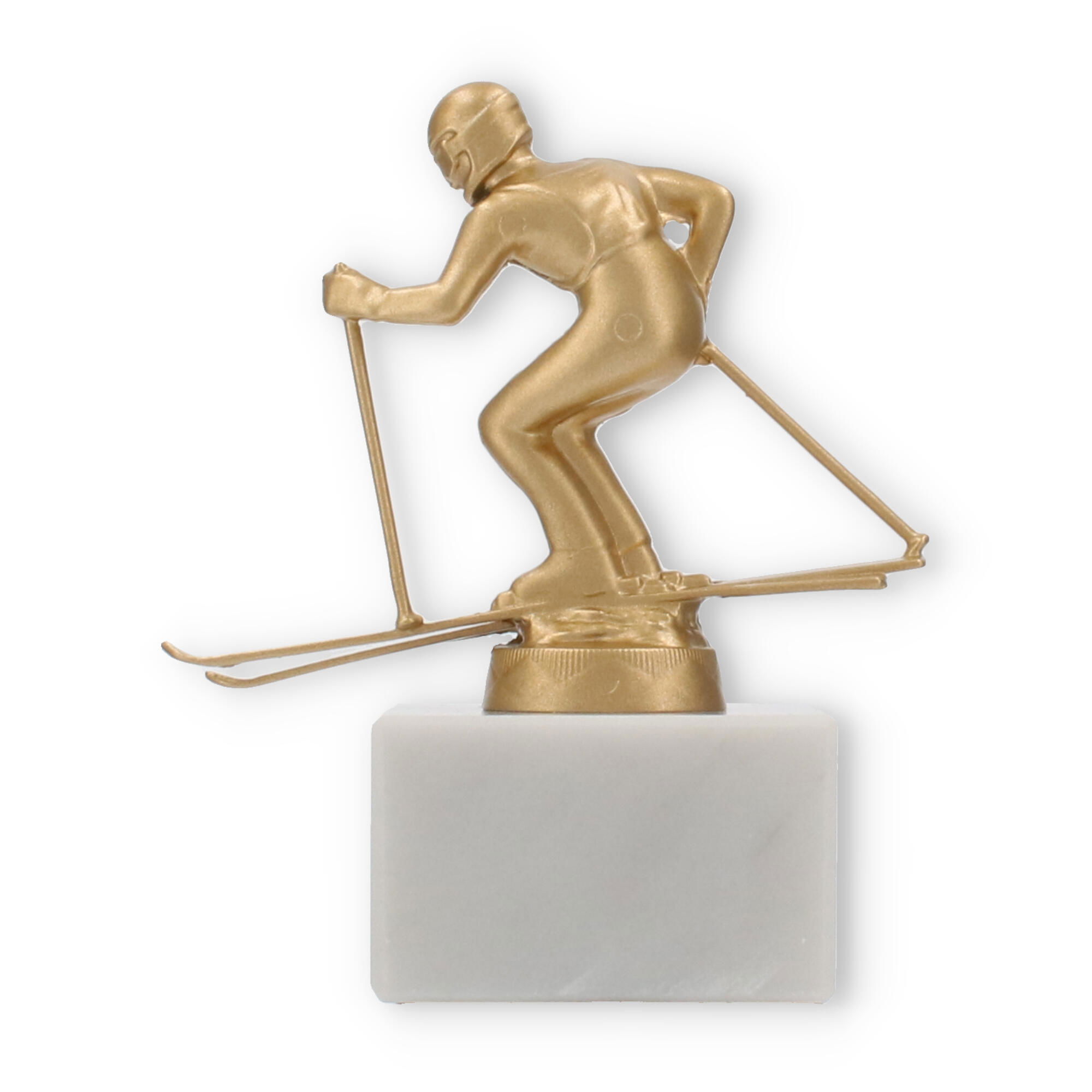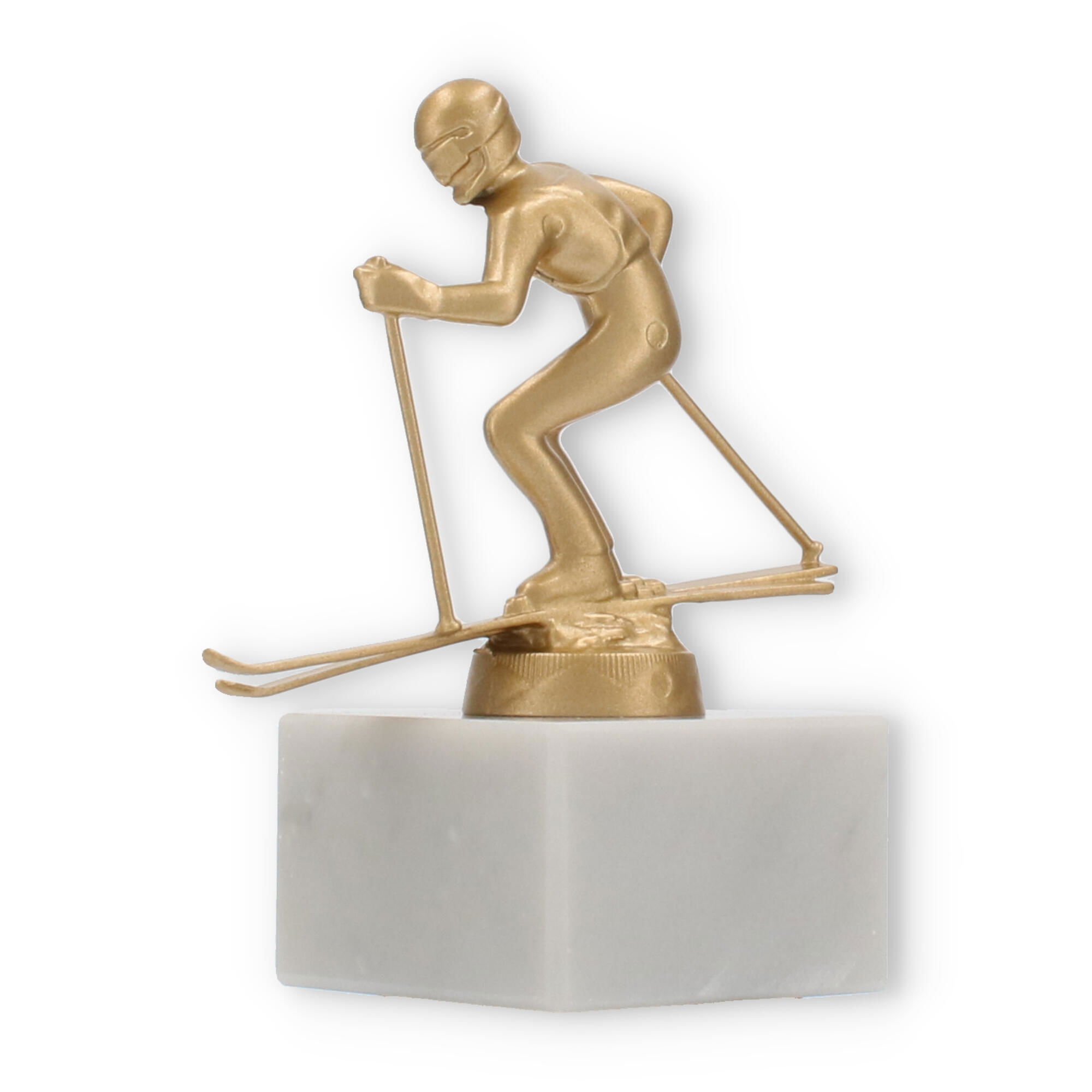 The base of this trophy is made from white marble, offering a robust and elegant foundation. The subtle gray veining typical of marble enhances its classic appeal, giving it a sophisticated look. On top of this base sits the gold-colored skier figure, made from a durable metal alloy. The figure, with its dynamic pose and detailed design, represents a skier in action, capturing a moment of triumph and athletic grace.