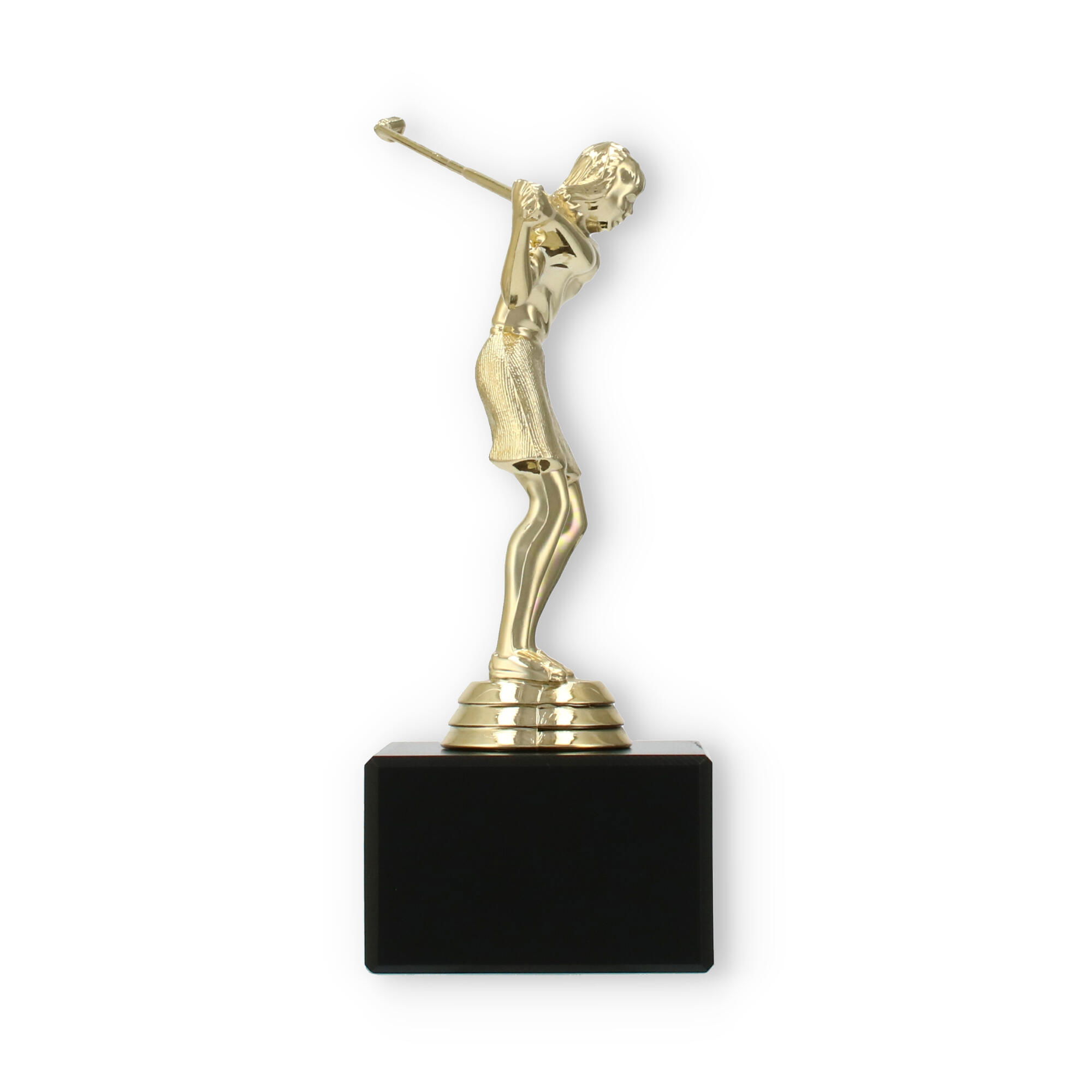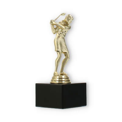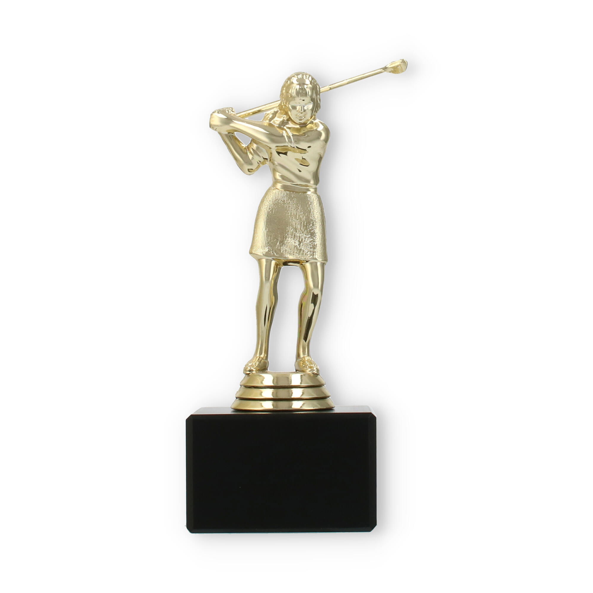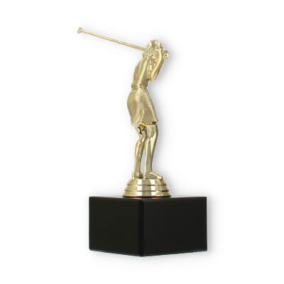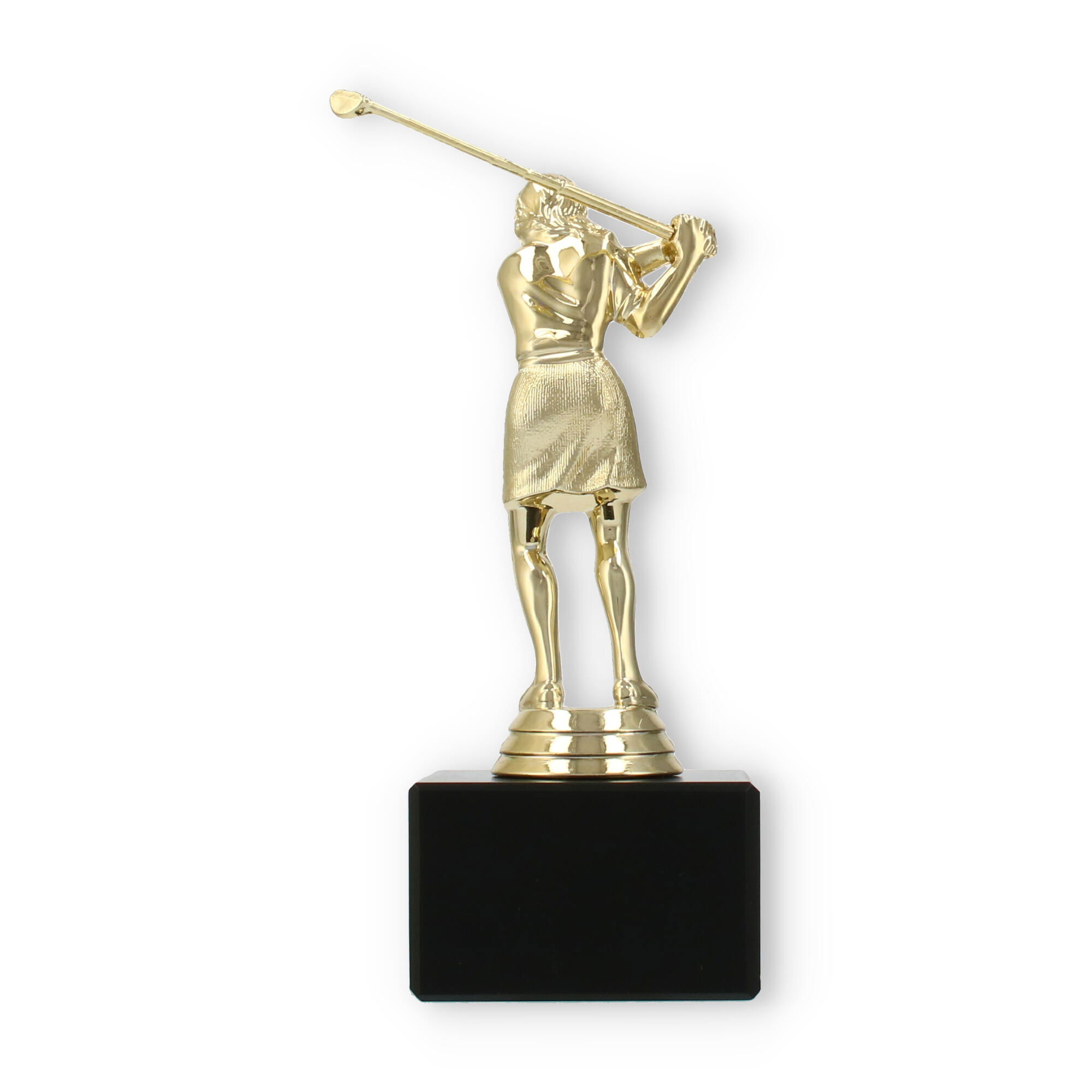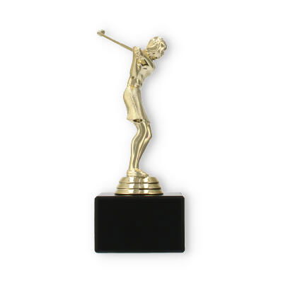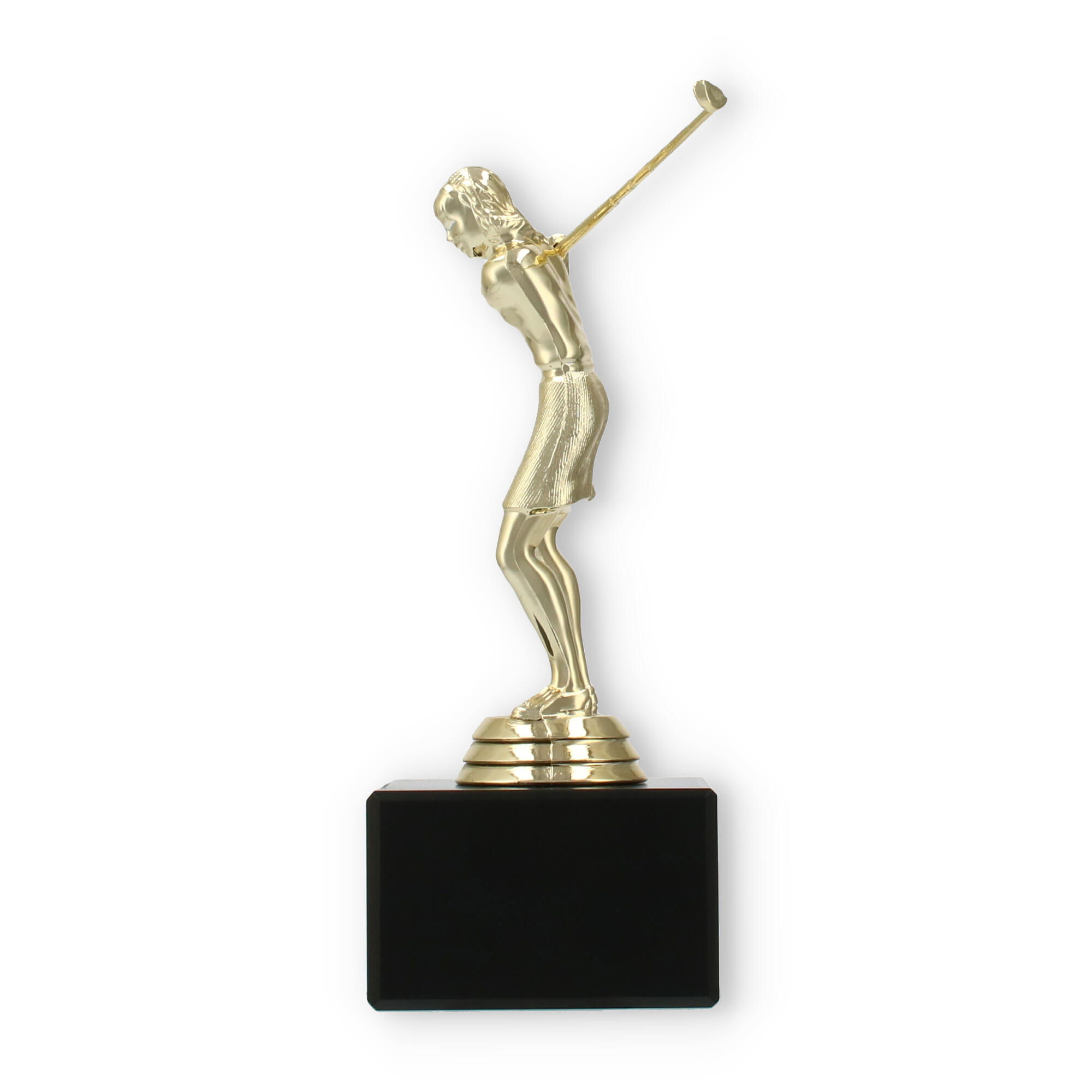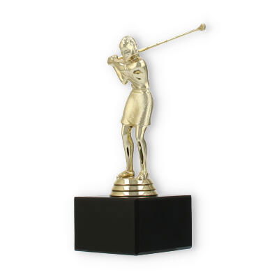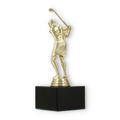 Crafted from gold-colored plastic, the figure stands tall on a durable black marble base, providing a striking contrast and ensuring stability. Its detailed design, from the golfer’s attire to the golf club, adds a touch of realism that will be appreciated by all.