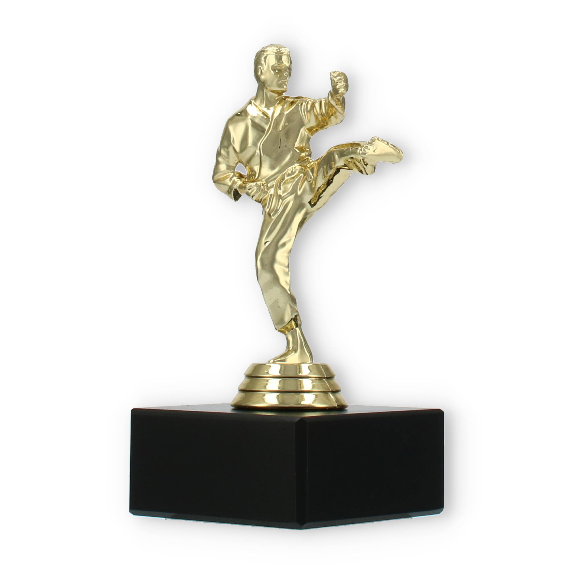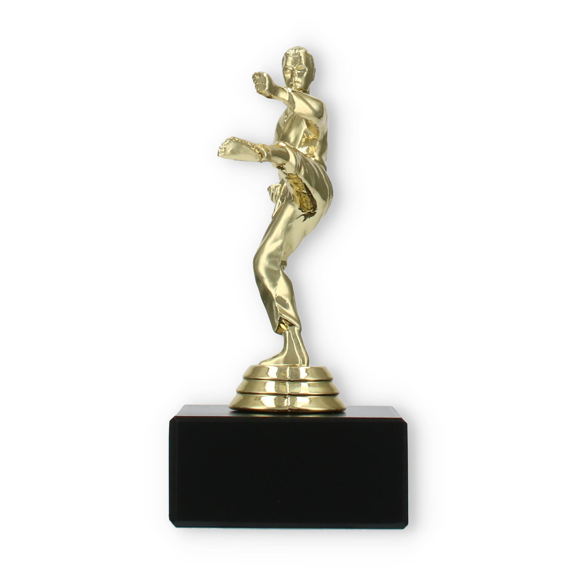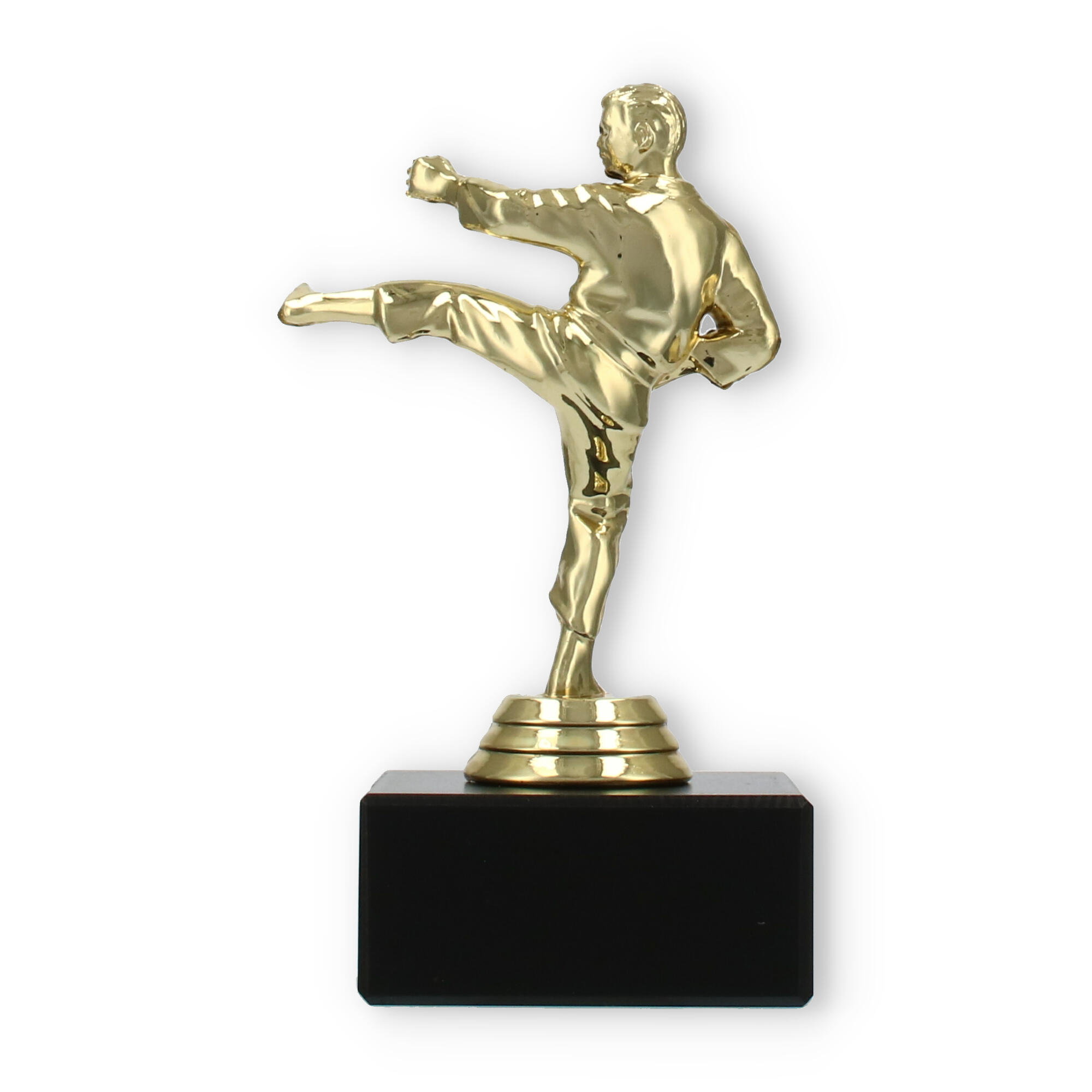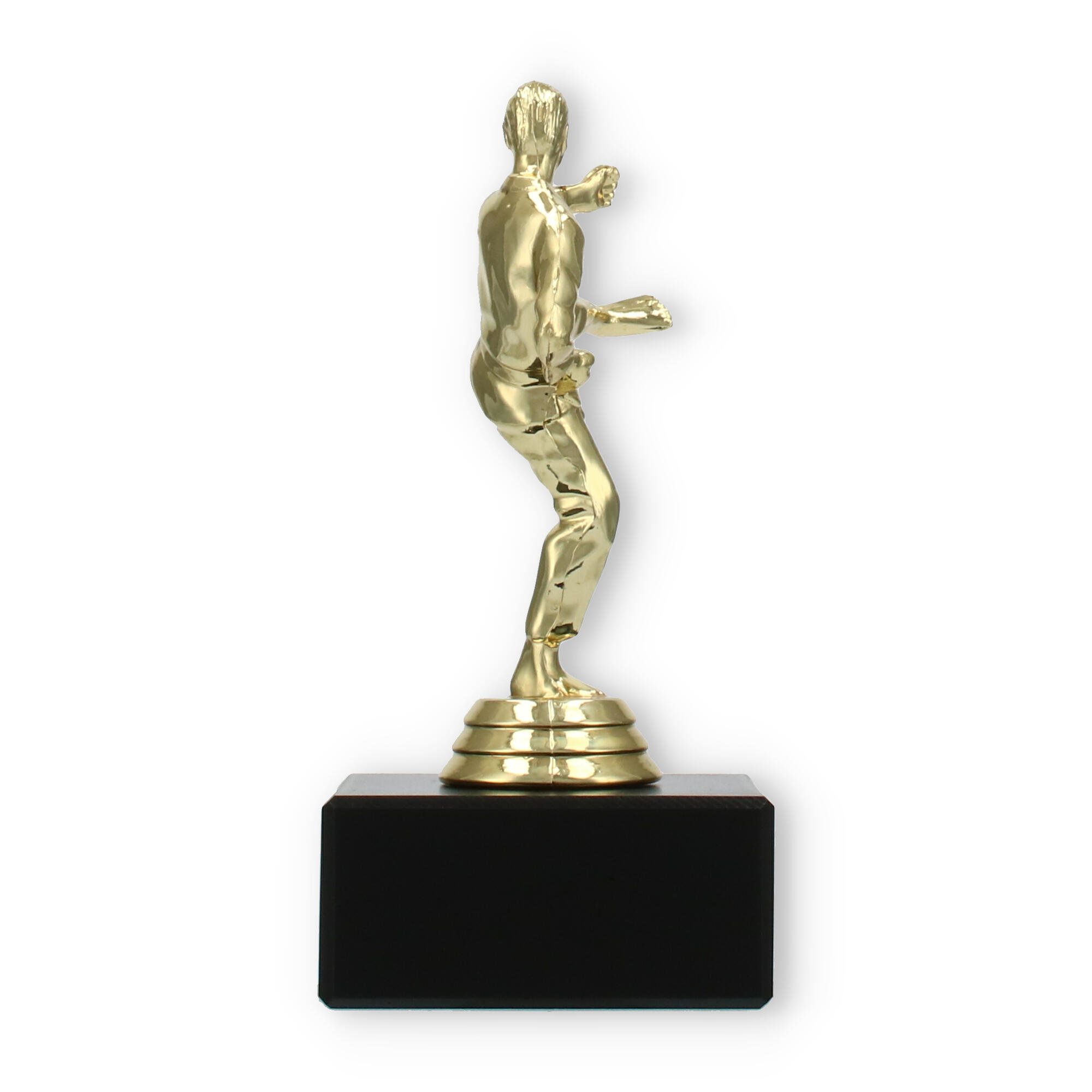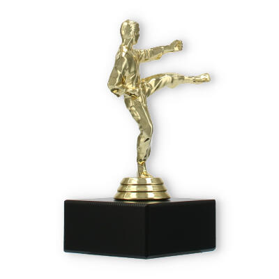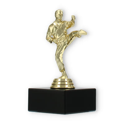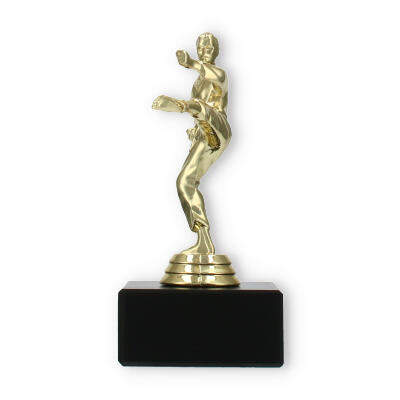 The Karate Men trophy plastic figure combines detailed craftsmanship with a touch of elegance, making it the perfect award for any karate competition. The figure portrays a male karate practitioner in a dynamic kicking pose, symbolizing strength and agility. Crafted from gold-colored plastic, the figure shines brightly, attracting attention and admiration.