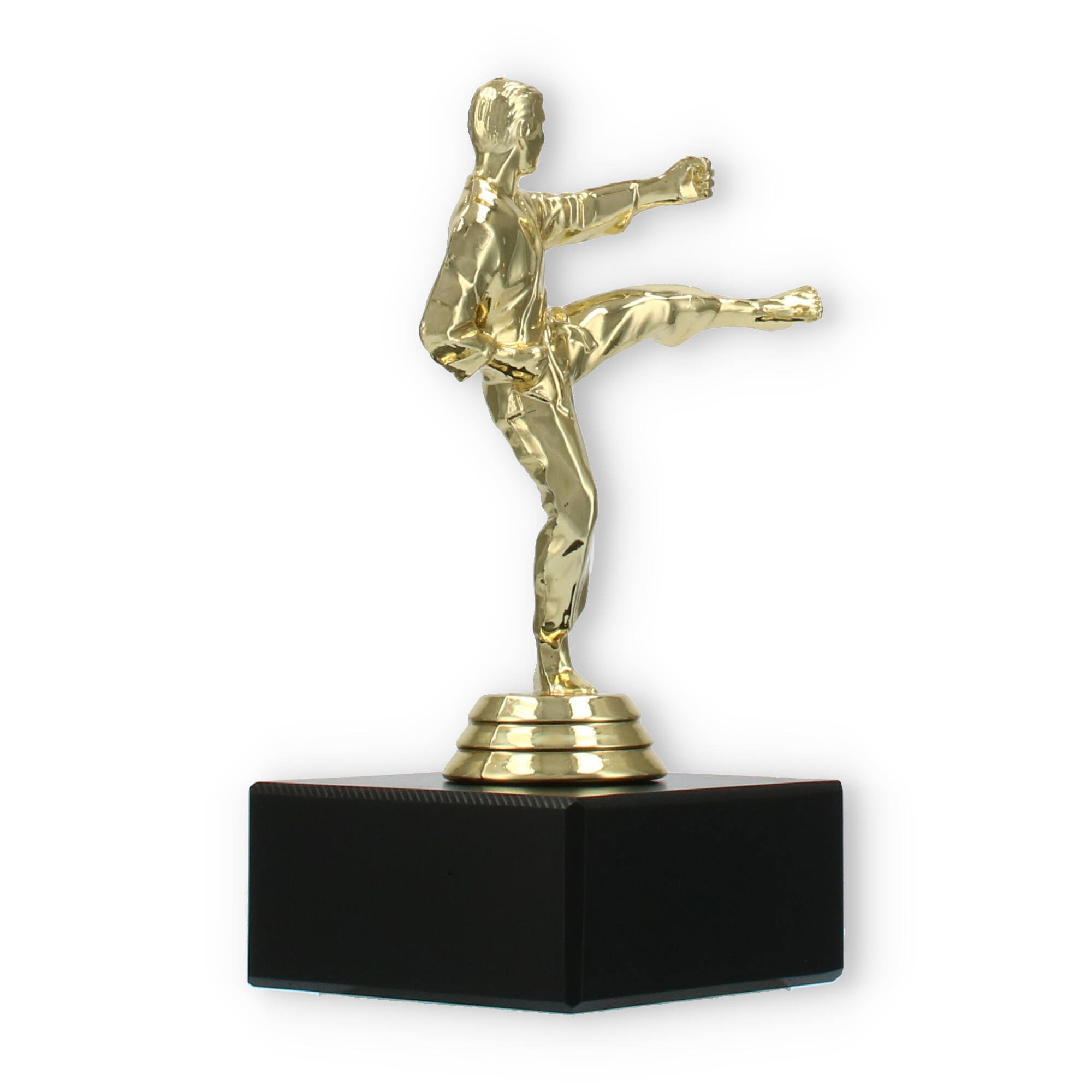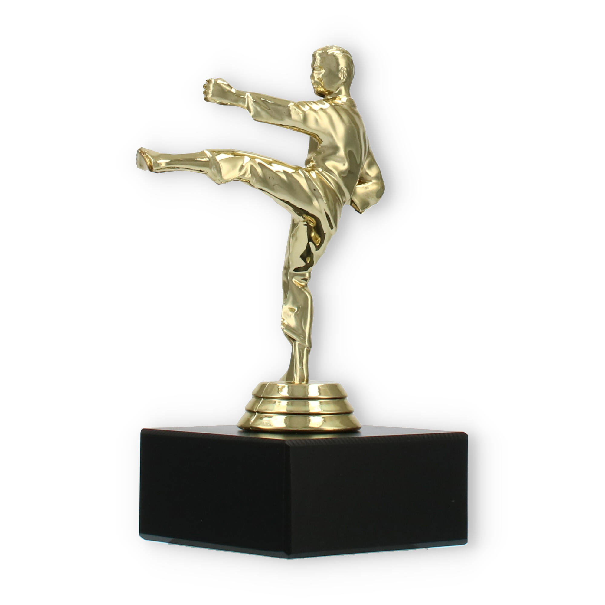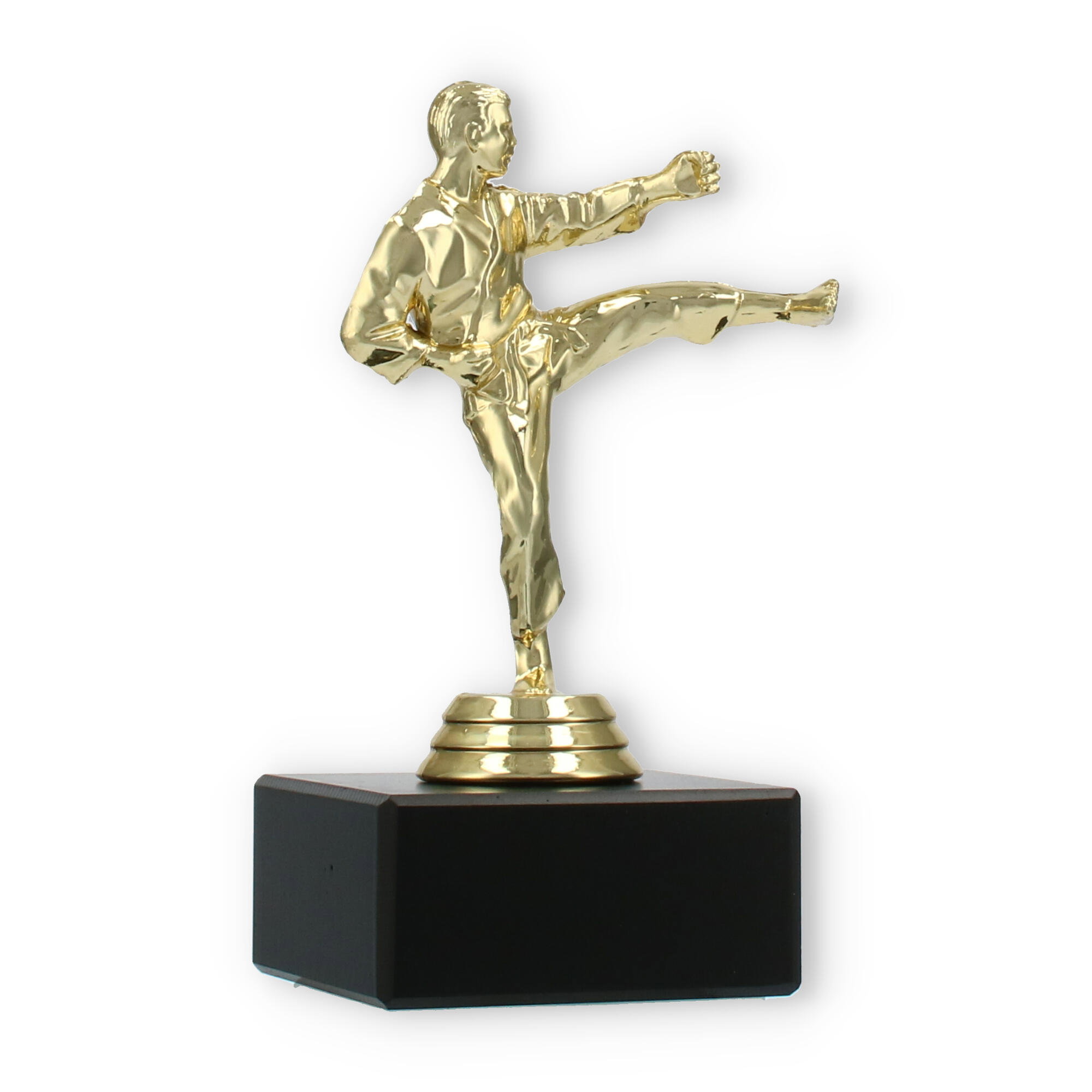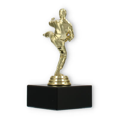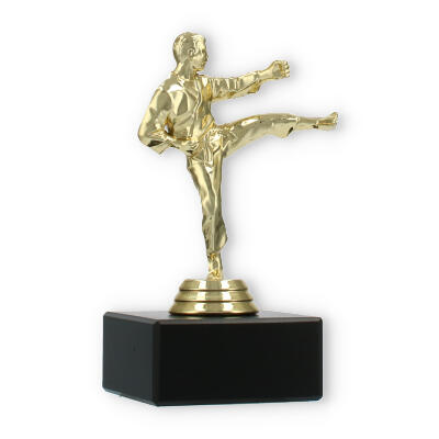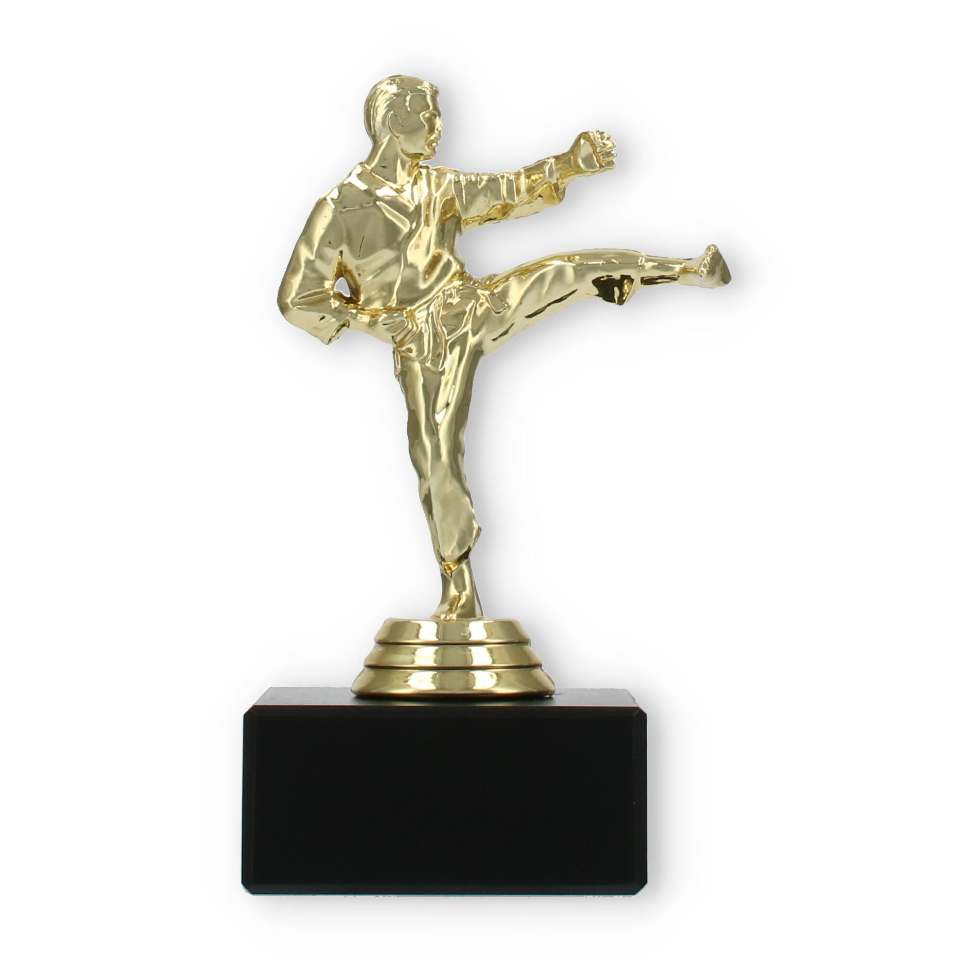 The Karate Men trophy plastic figure combines detailed craftsmanship with a touch of elegance, making it the perfect award for any karate competition. The figure portrays a male karate practitioner in a dynamic kicking pose, symbolizing strength and agility. Crafted from gold-colored plastic, the figure shines brightly, attracting attention and admiration.