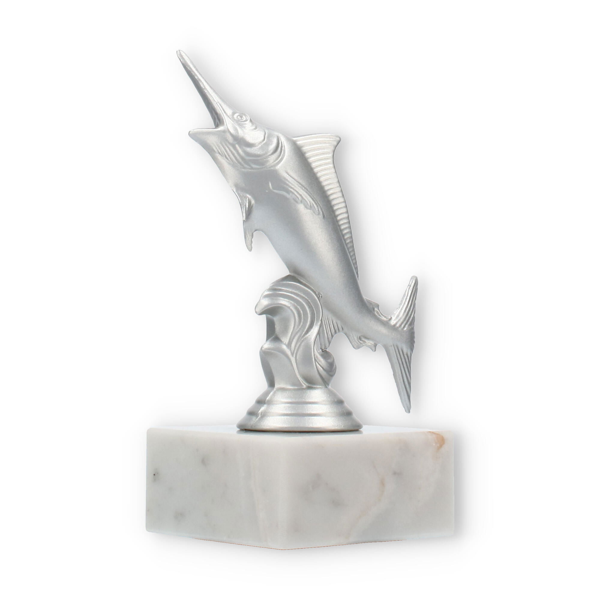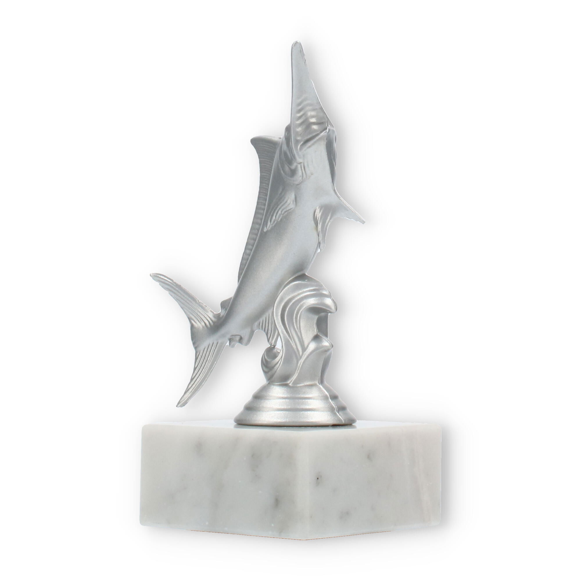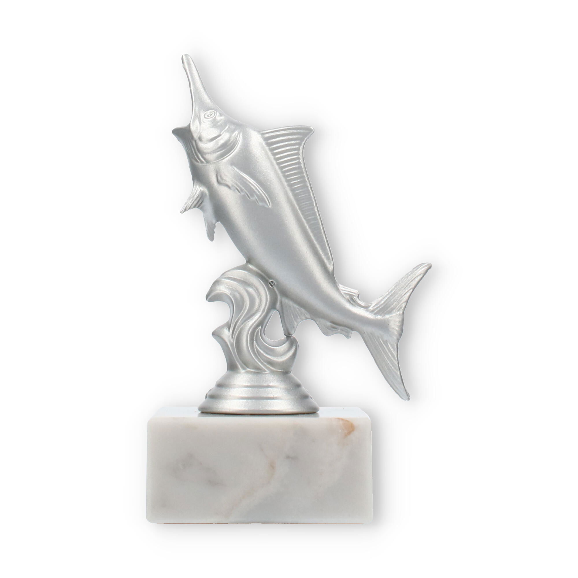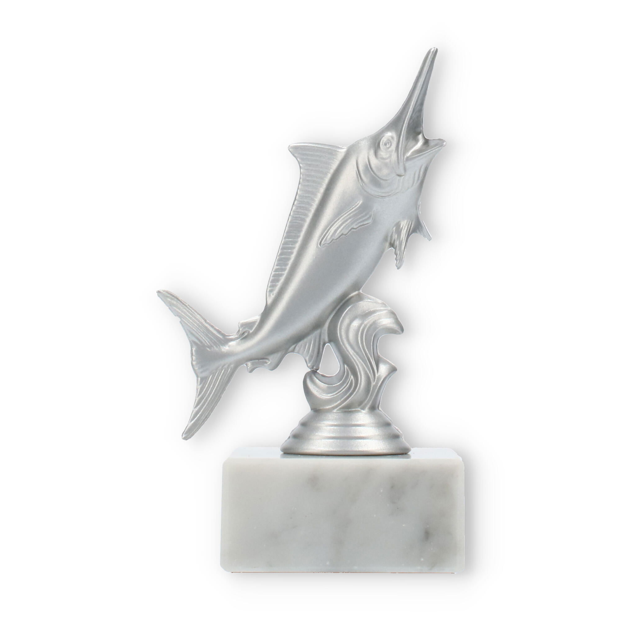 The base of the Marlin trophy is crafted from white marble, featuring natural gray veining that adds to its sophisticated elegance. This solid marble base provides stability and a touch of refinement, making the trophy not just beautiful but also durable and substantial. The transition between the sculpture and the marble base is seamless, ensuring a harmonious and balanced design.