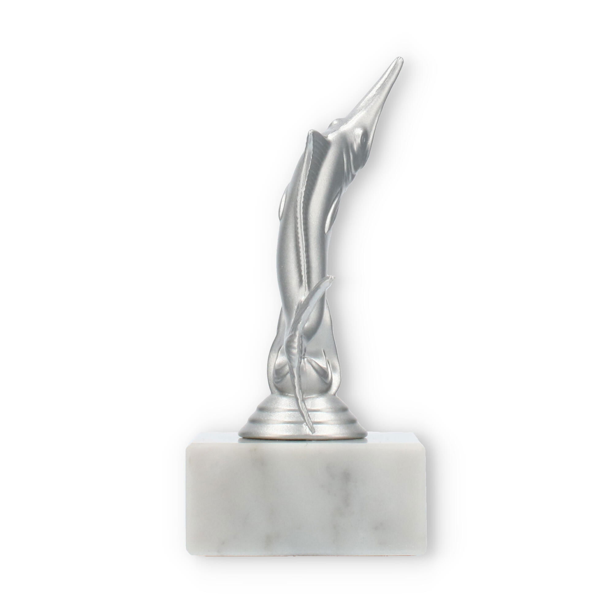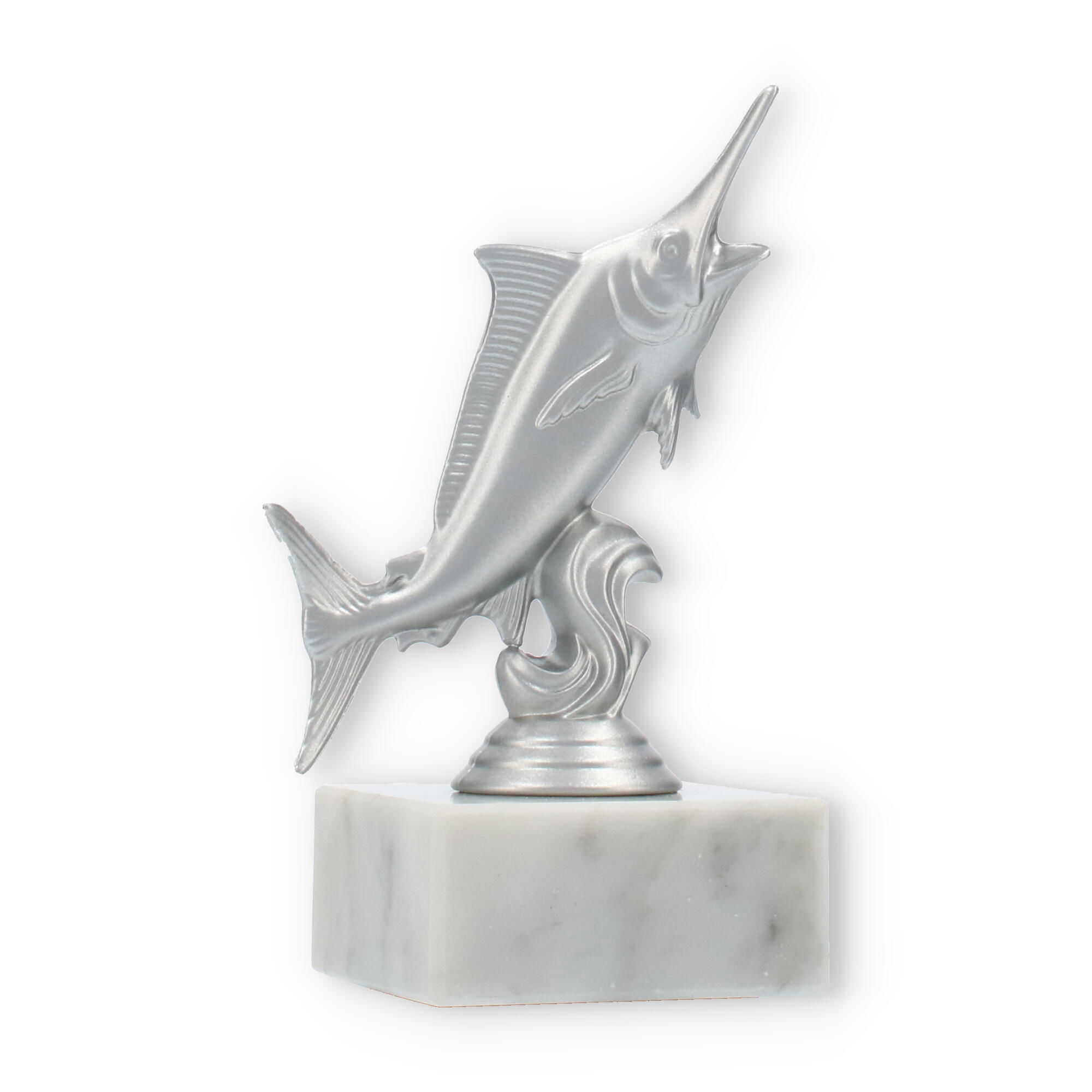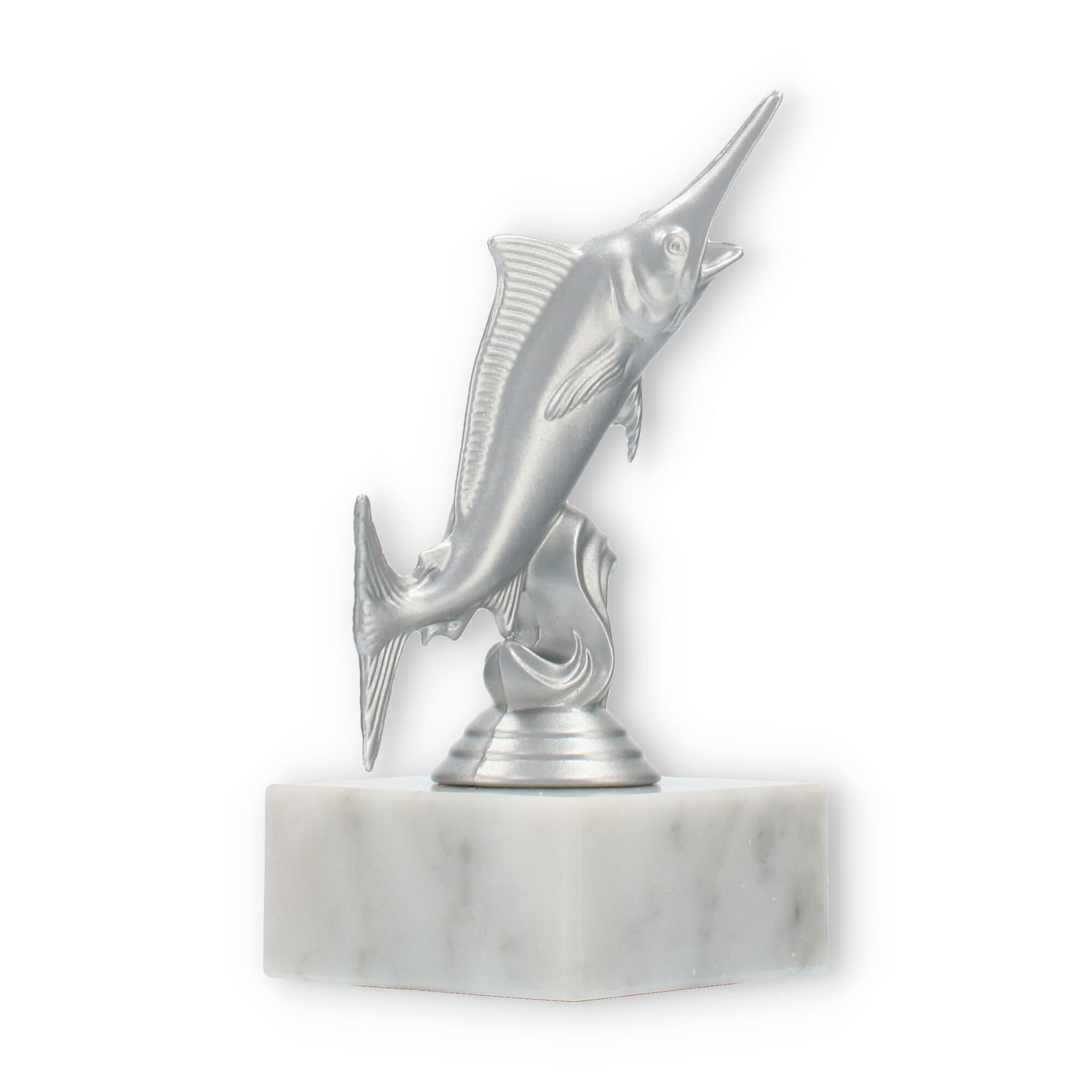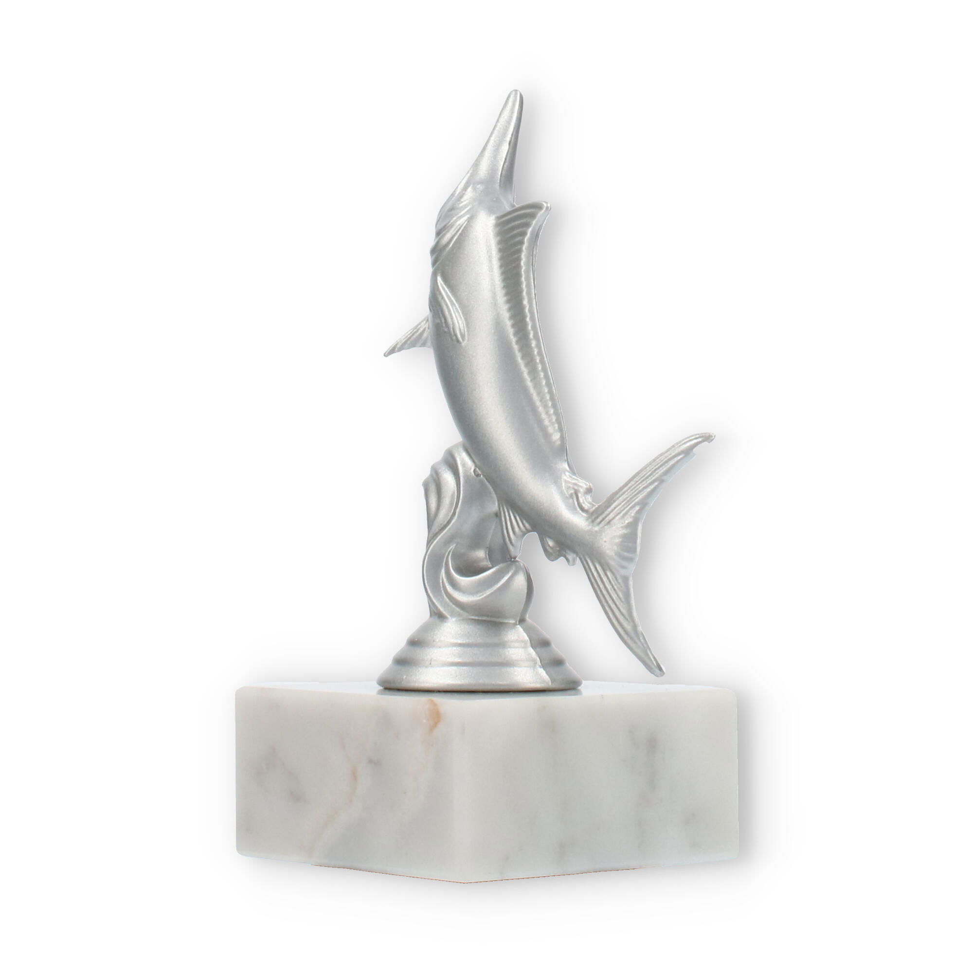 The base of the Marlin trophy is crafted from white marble, featuring natural gray veining that adds to its sophisticated elegance. This solid marble base provides stability and a touch of refinement, making the trophy not just beautiful but also durable and substantial. The transition between the sculpture and the marble base is seamless, ensuring a harmonious and balanced design.