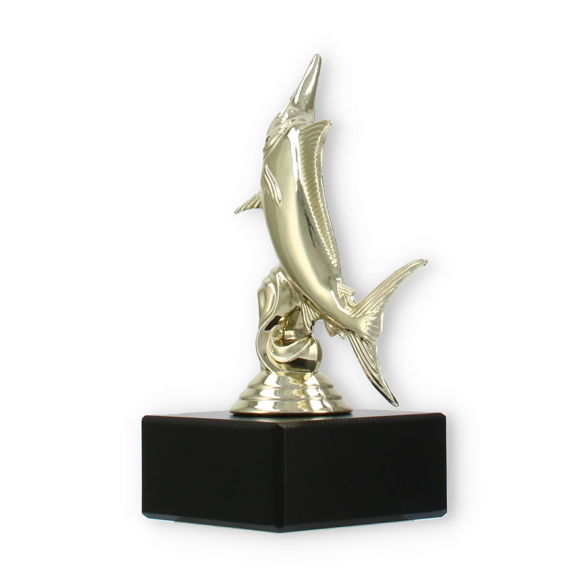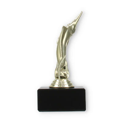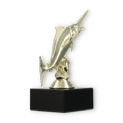 The marlin figure, crafted from gold-colored plastic, captures the dynamic motion of this majestic fish. The base, made from polished black marble, provides a sturdy foundation, enhancing the trophy’s overall elegance and balance. The realistic details of the fish, from its pointed snout to its flowing fins, are finely molded to add a degree of sophistication.
