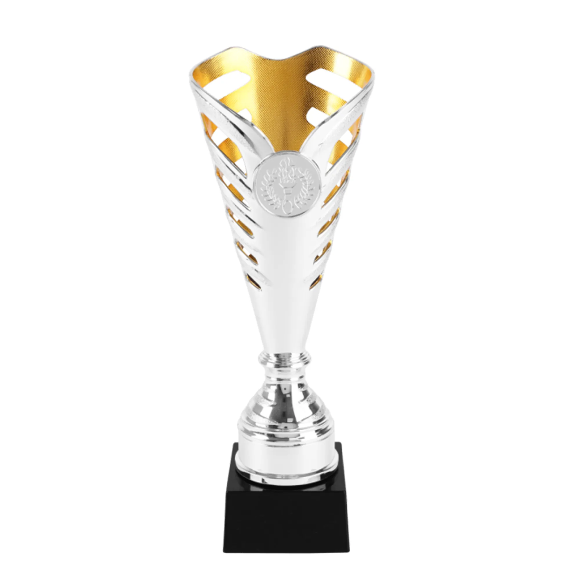 The Terry trophies masterfully blend aesthetic appeal and personalized expression for any distinguished occasion. Standing at 21.5 cm, these trophies feature a distinctive funnel-shaped cup, with a sleek silver-colored exterior that captivates with its modern elegance. The interior gleams with a gold-colored finish, creating a captivating contrast that highlights the award's importance.