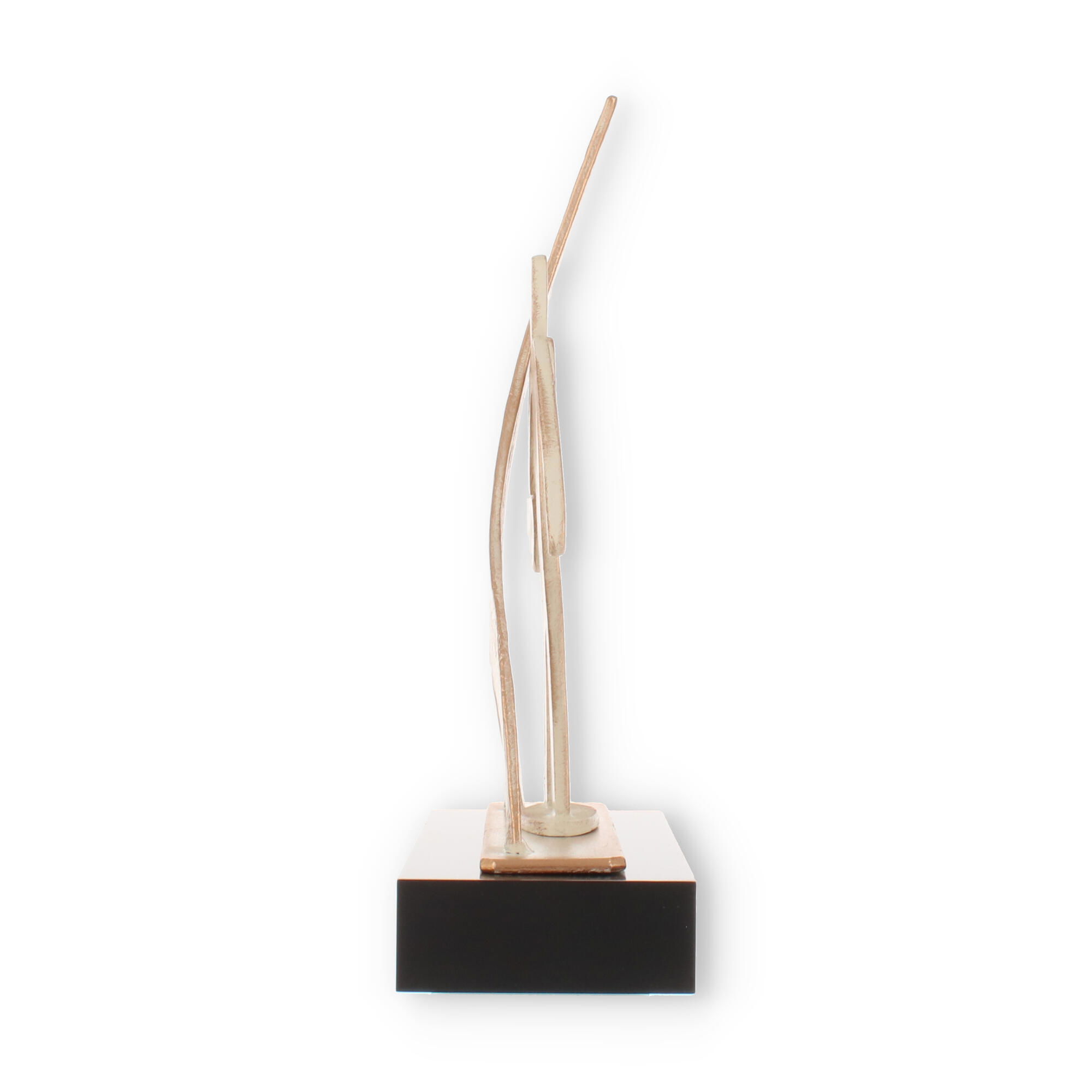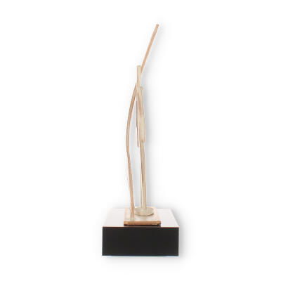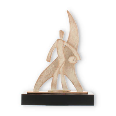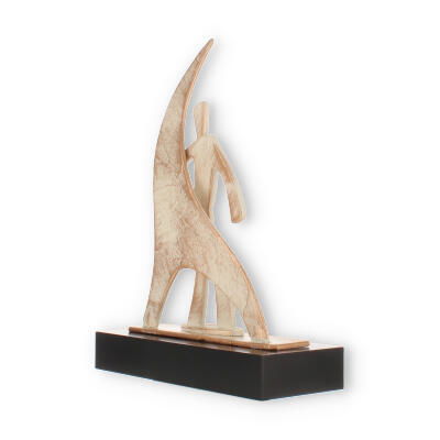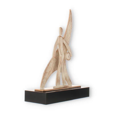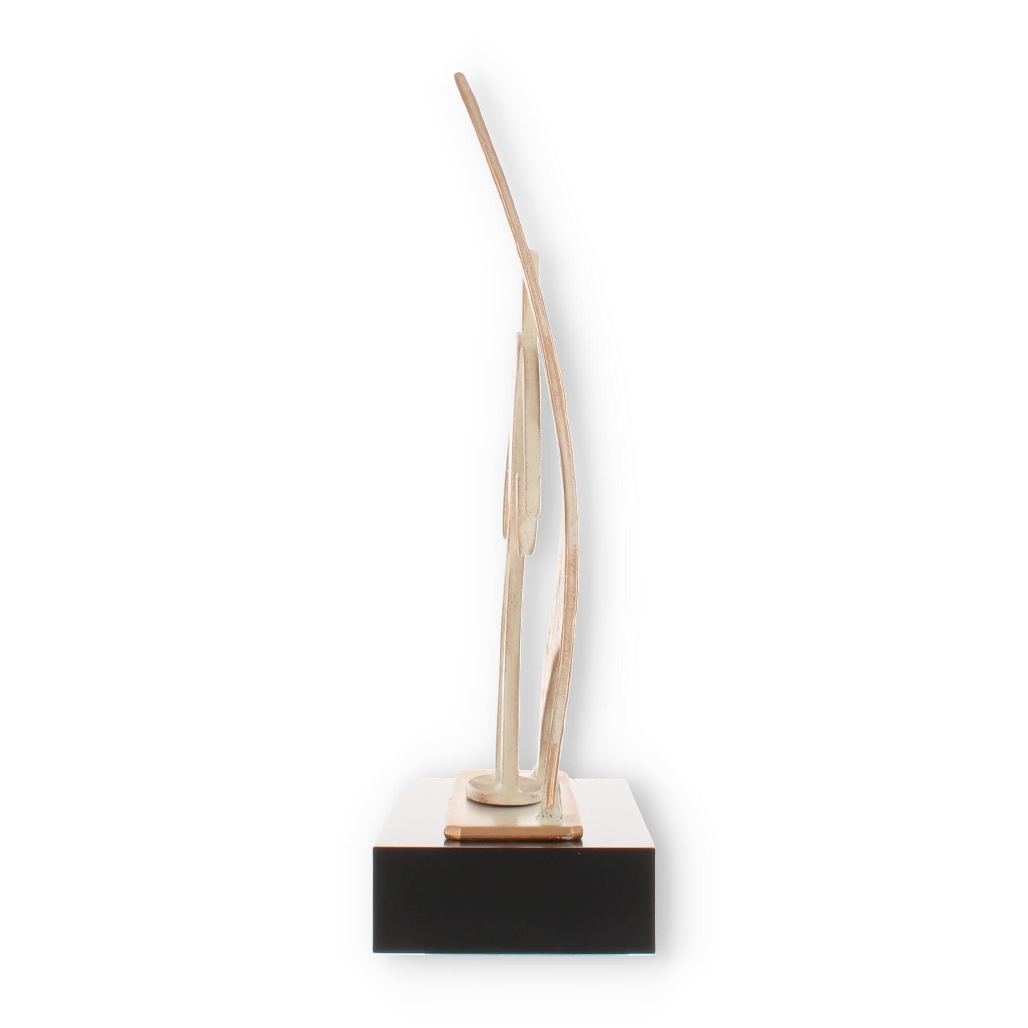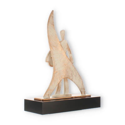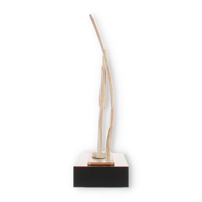 Introducing the Trophy Zamak figure Flame Skittles in gold and white, mounted on a black wooden base. This trophy is designed to bring a touch of sophistication and honor to your Skittles competition. Its modern and abstract form emphasizes movement and dynamism, showcasing a stylized figure in motion.