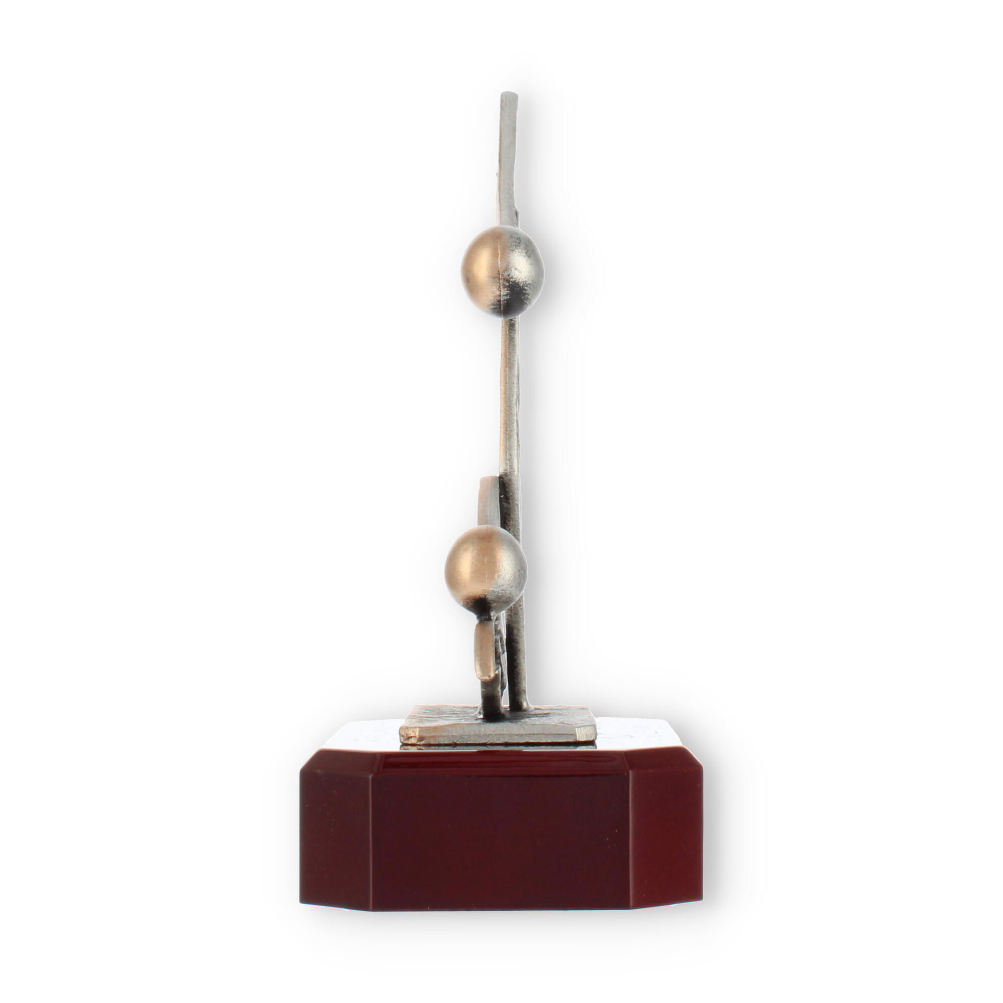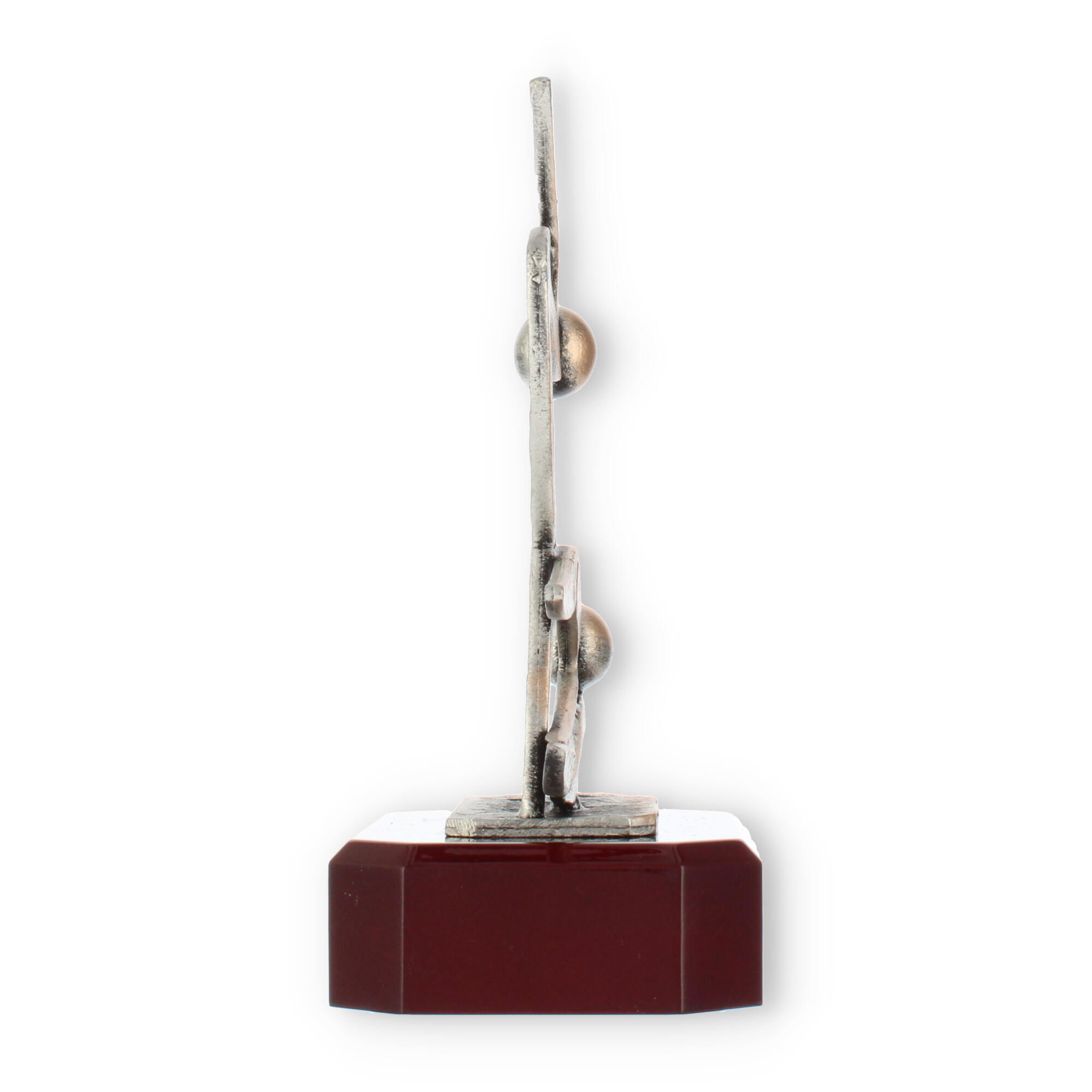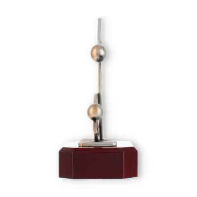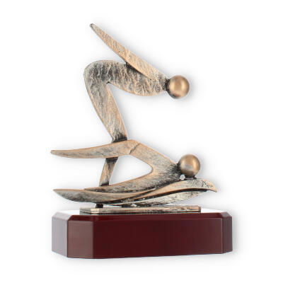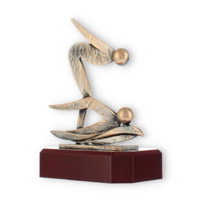 Artfully mounted on a solid wood base with a mahogany-look finish, the trophy ensures stability and elegance. The smooth, polished surface of the base contrasts beautifully with the figure's textured appearance, enhancing the overall aesthetic appeal. The chamfered edges of the base add a touch of refinement, making it a standout piece.