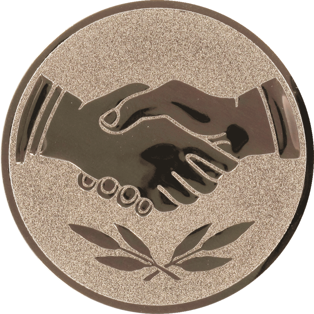 El emblema de aluminio en acabado bronceado de 50 mm captura la esencia del valor de la amistad. En el centro se ubican dos manos unidas en señal de confianza mutua, destacadas por un contorno brillante que contrasta con el fondo arenado. Bajo las manos, un olivo estilizado representa paz y conexión duradera. Este diseño intrincado, estampado en aluminio de alta calidad, garantiza una distinción sobresaliente.