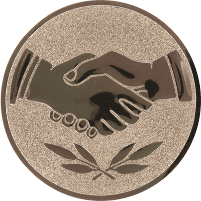 El emblema de aluminio en color bronce, con un diámetro de 50 mm, resalta un mensaje de amistad y unión. Su diseño detallado, con manos entrelazadas y motivo de olivo, ofrece una textura y brillo únicos que inmortalizan momentos especiales.