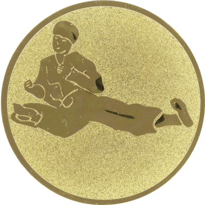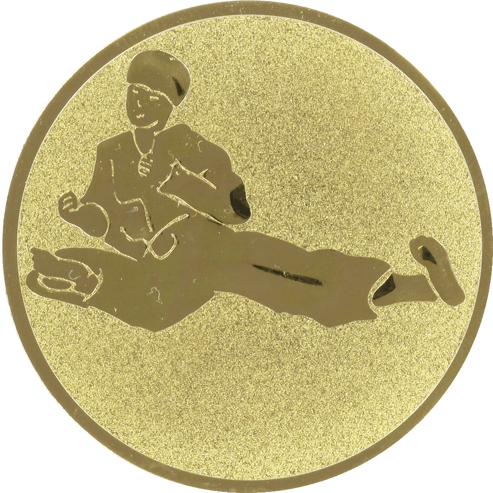 El emblema de taekwondo en aluminio dorado de 25mm es una pieza que no solo simboliza el esfuerzo y dedicación, sino que también añade un toque de refinamiento a cualquier evento de reconocimiento. Cada aspecto de este emblema está cuidadosamente diseñado para capturar la esencia del taekwondo, presentando una figura en una dinámica pose de patada.