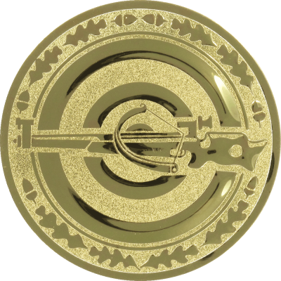 Este emblema color dorado de 50mm, elaborado en aluminio estampado, incorpora una intricada ballesta. Perfecto para reconocimientos únicos, combina detalles precisos con un diseño visualmente impresionante.