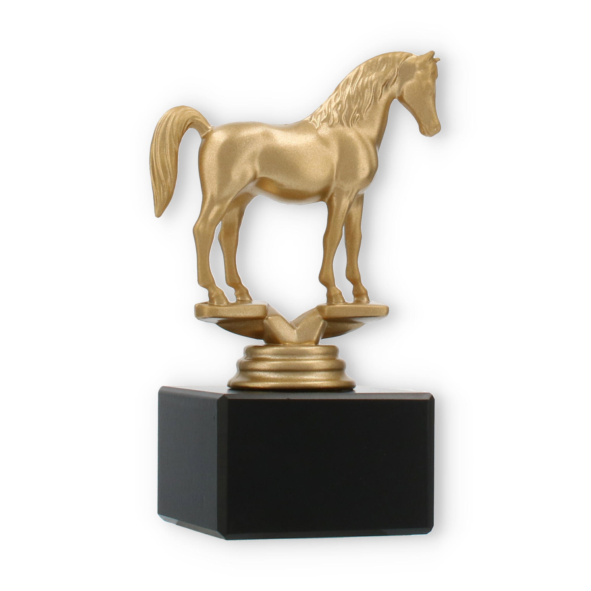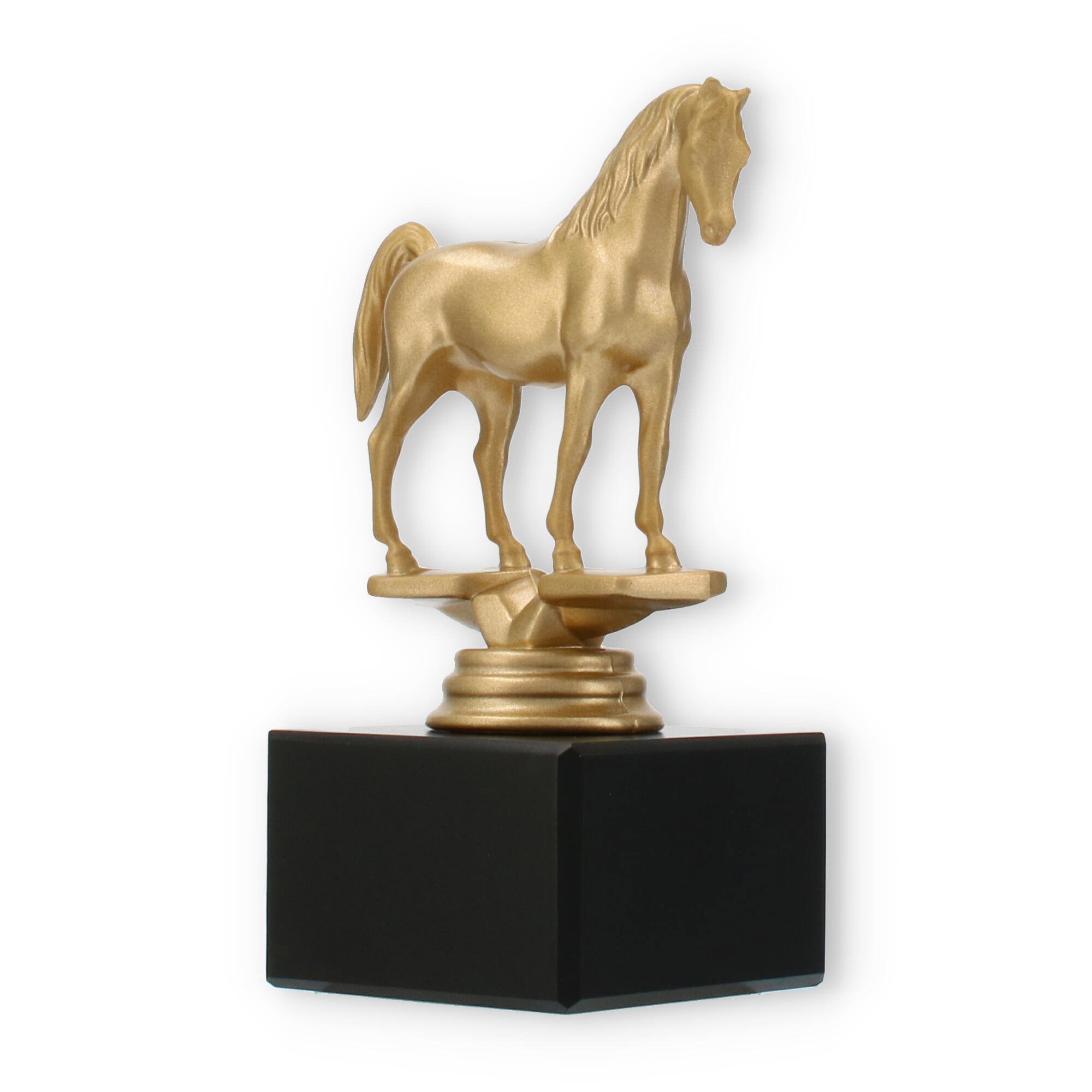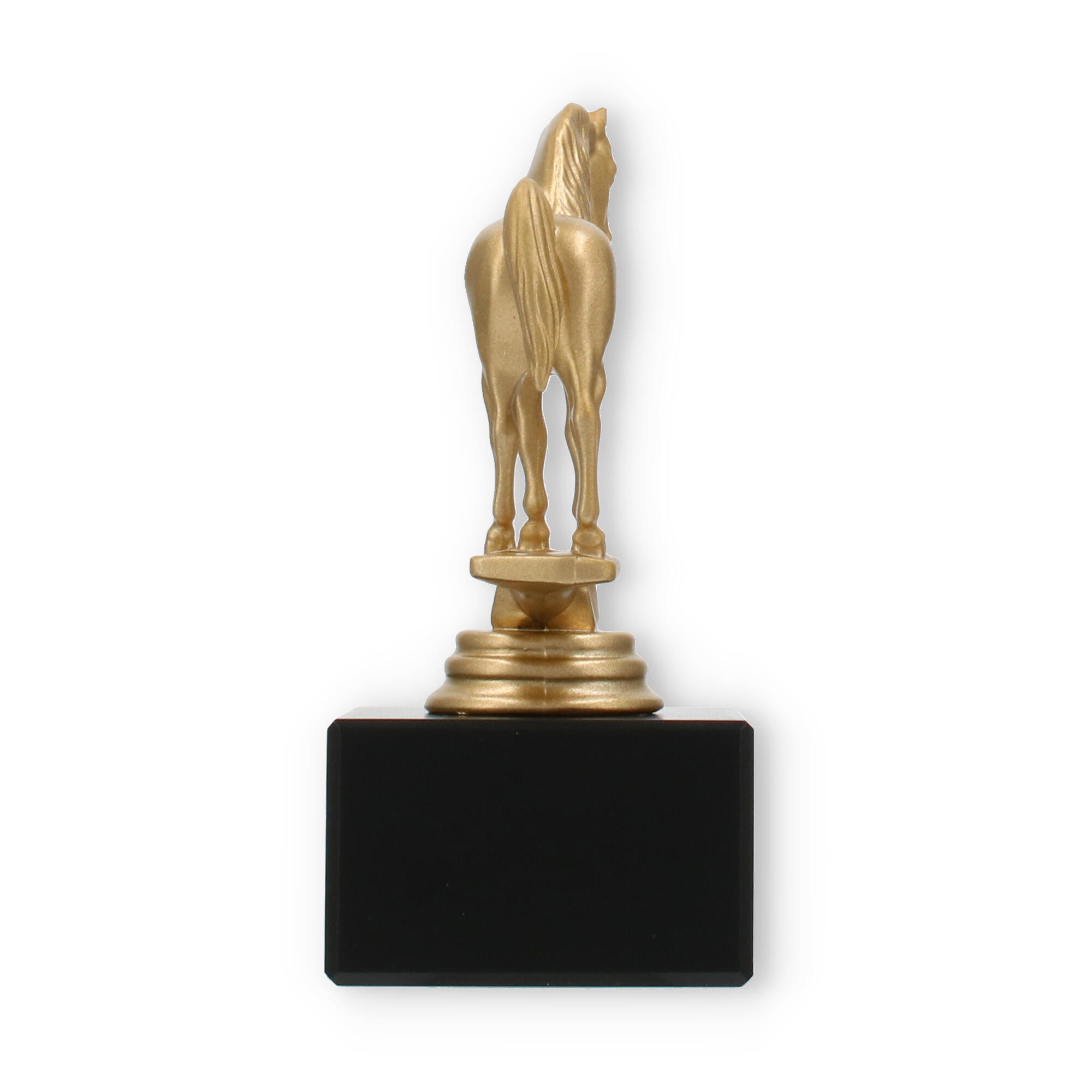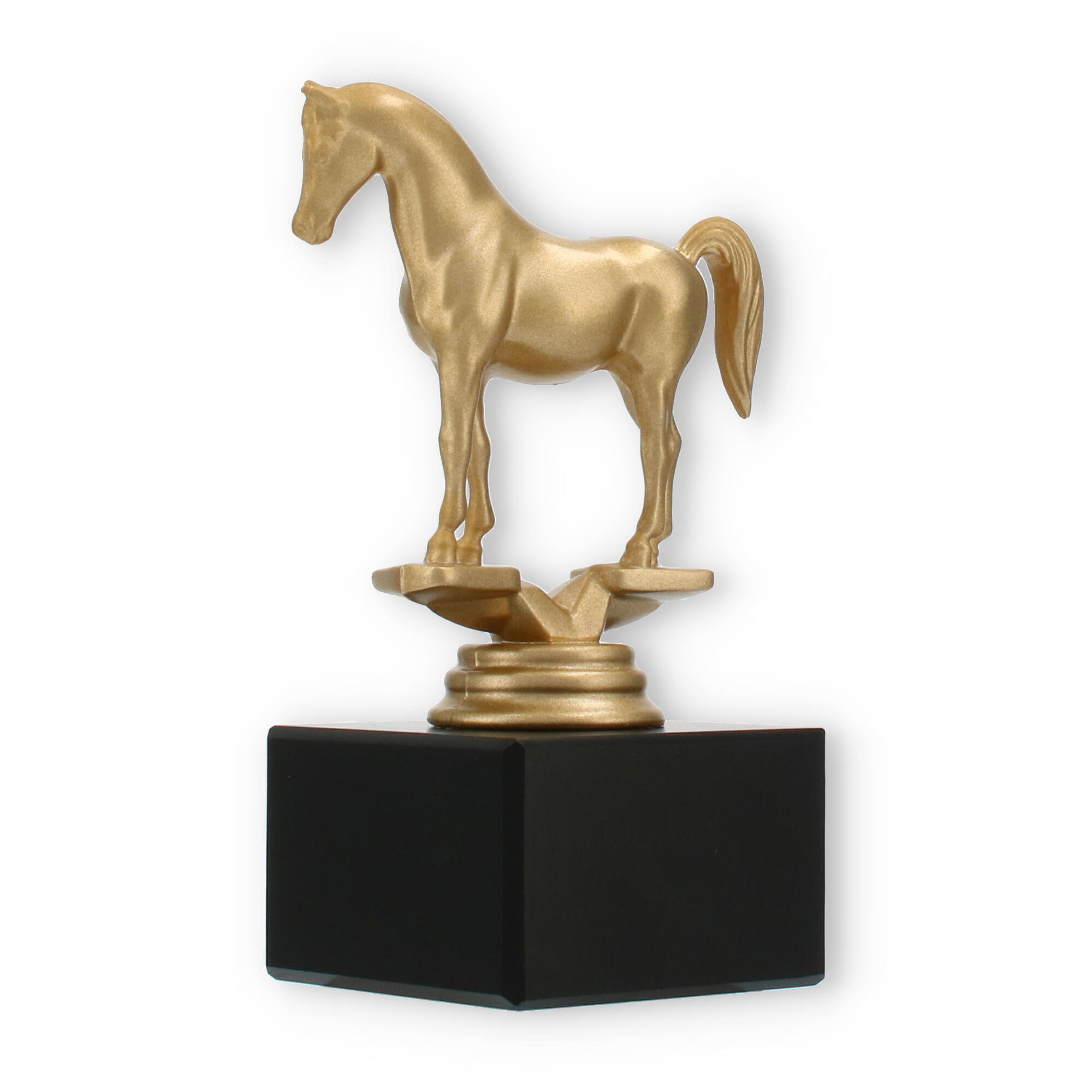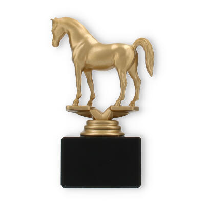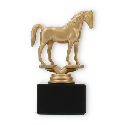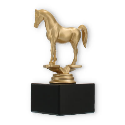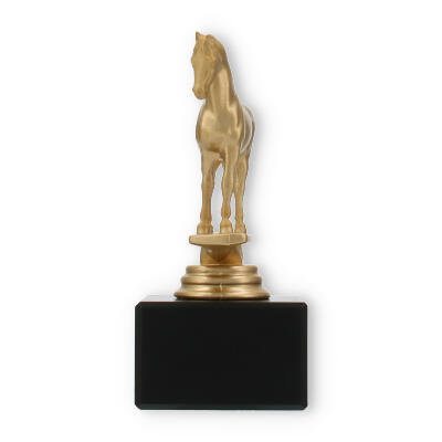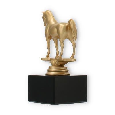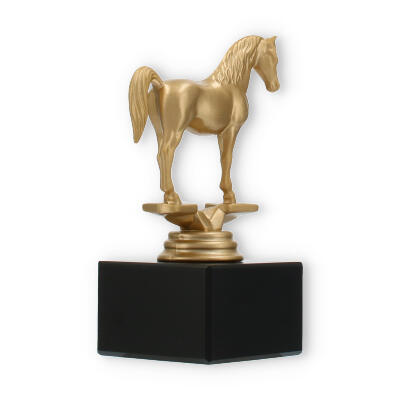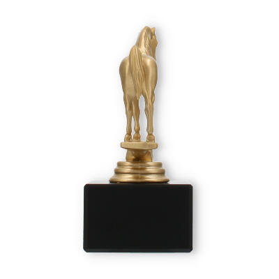 La figura de trofeo Árabe combina elegancia y simbolismo, elaborada para honrar a la perfección los logros ecuestres. Con una altura de 14,0 cm, este trofeo capta la grandeza de su evento con su llamativo caballo dorado sobre una base de mármol negro.