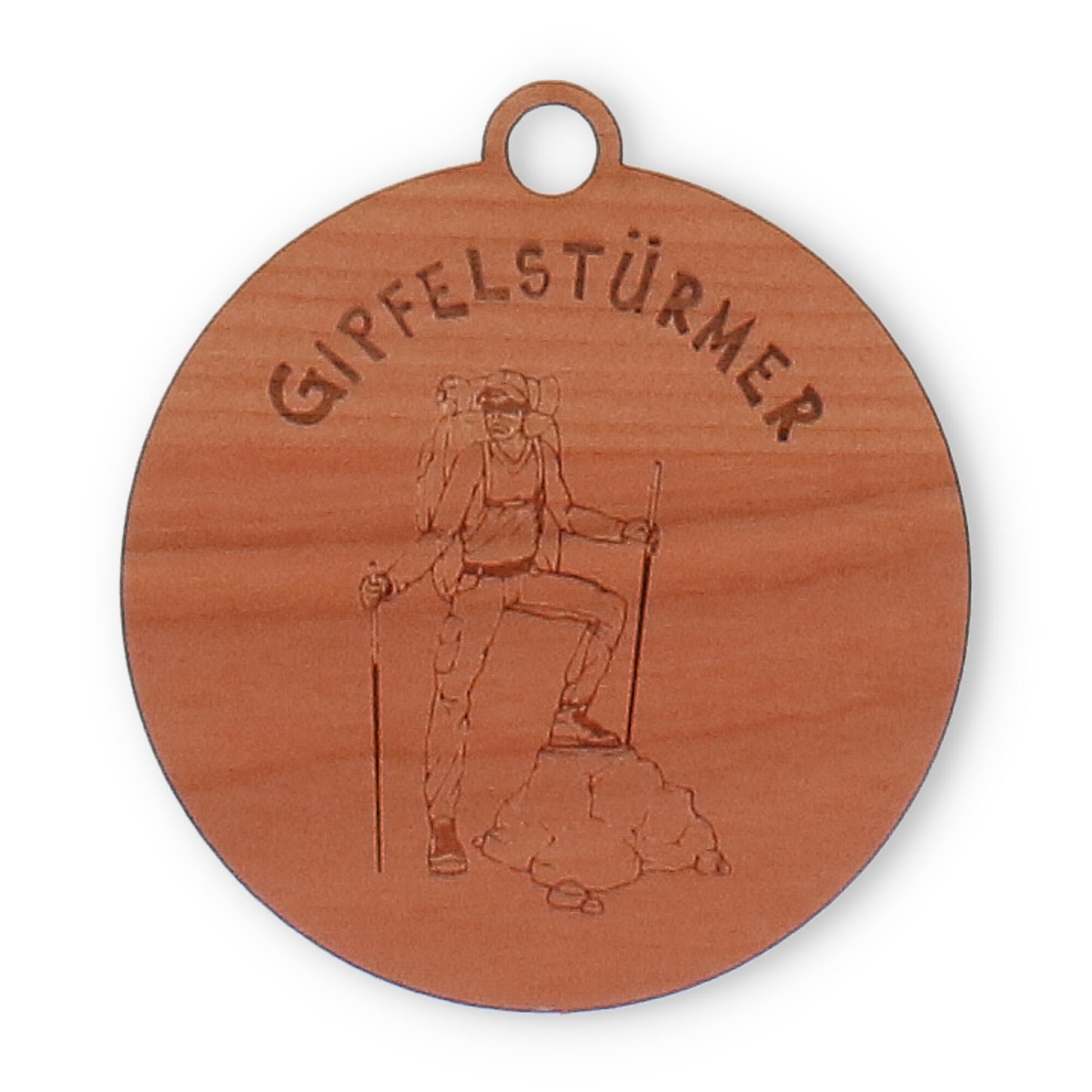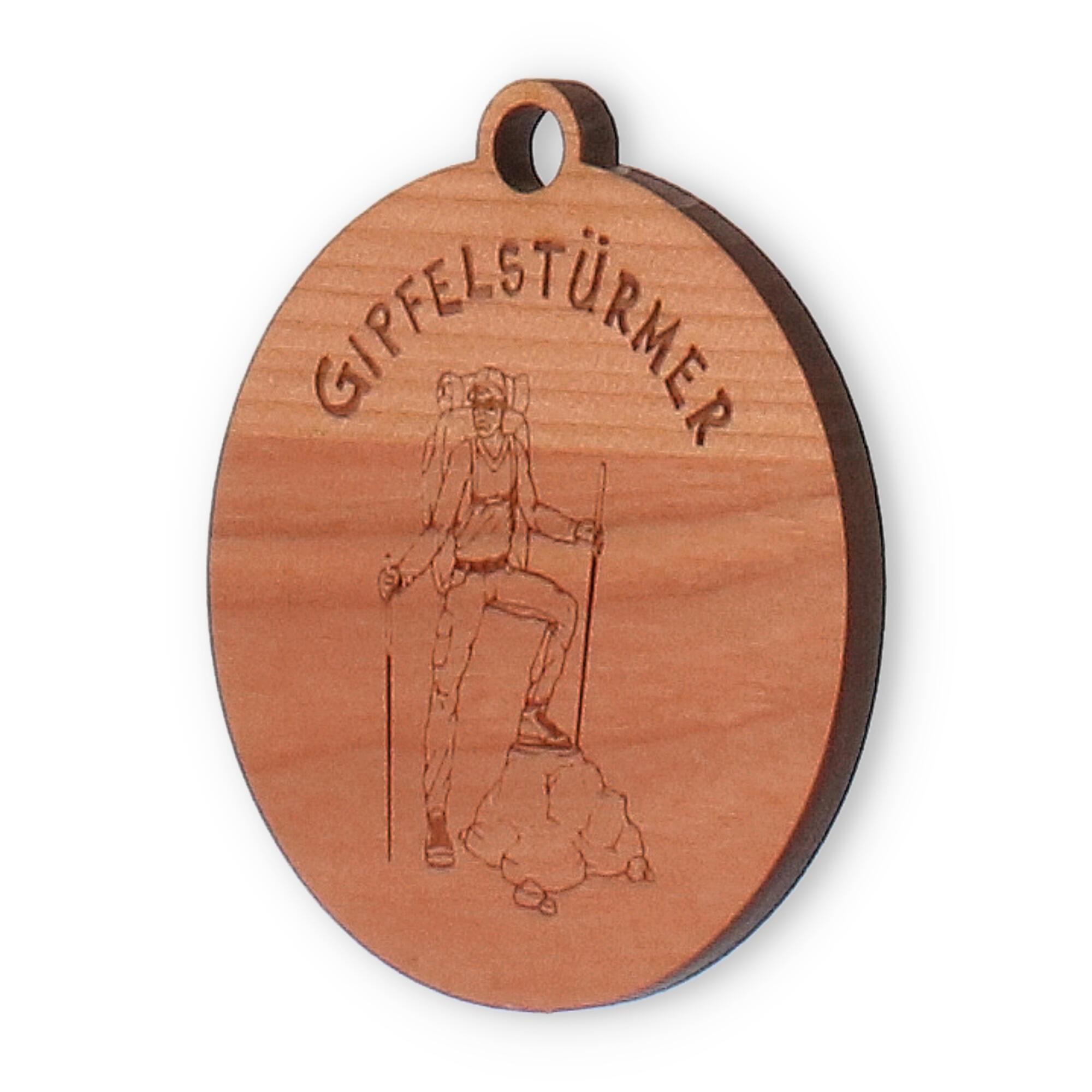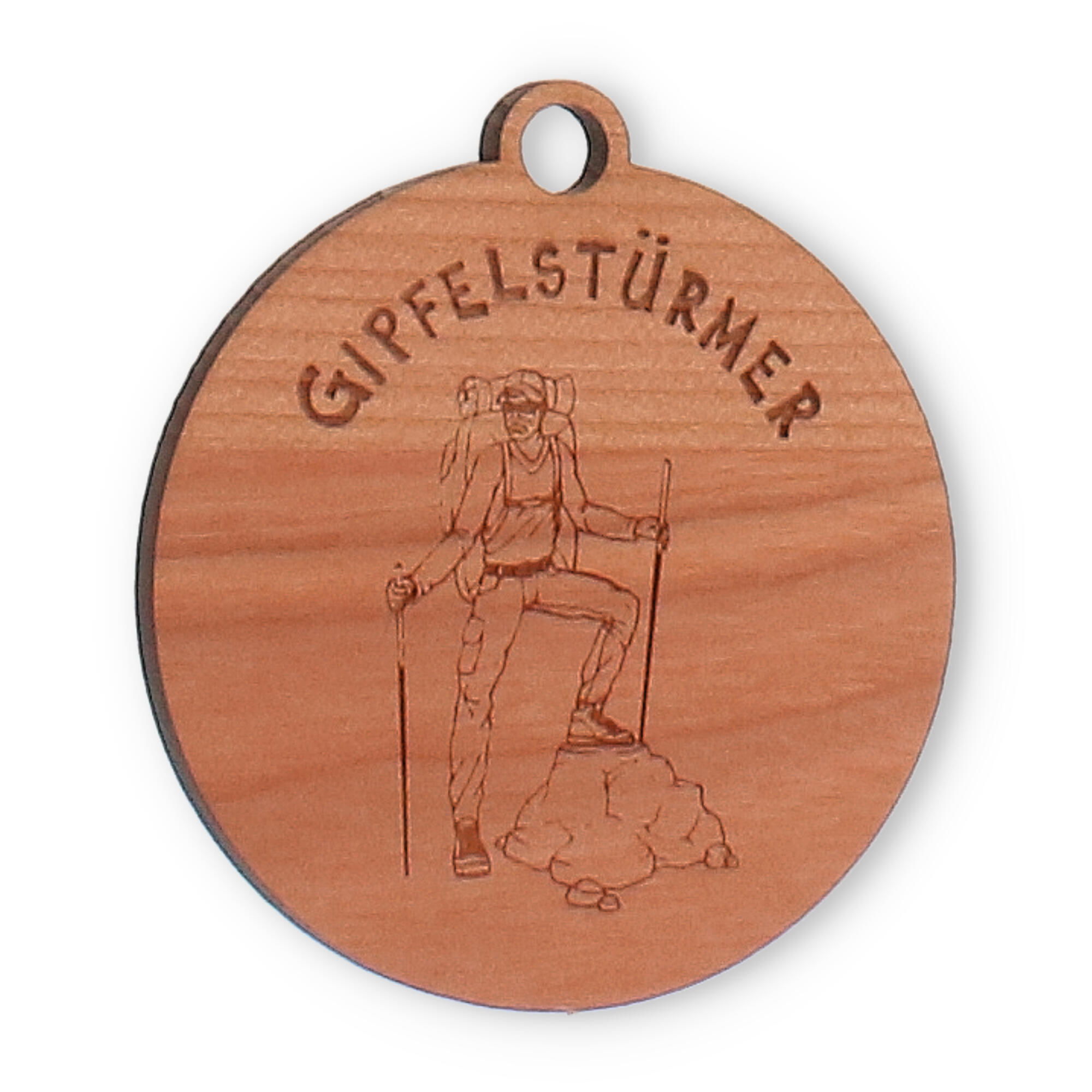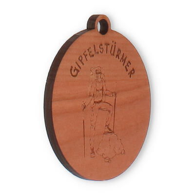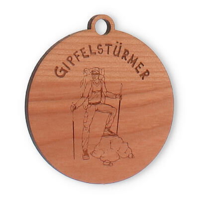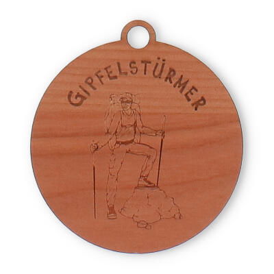 Entregar una medalla Vera es reconocer y celebrar logros con un toque de naturaleza auténtica. Al sostener una, se siente la calidez de la madera maciza de cerezo que captura la esencia del trabajo duro y la dedicación. El grabado en su superficie, con el detalle preciso de un senderista sobre una roca y el título "GIPFELSTÜRMER", simboliza la conquista personal.