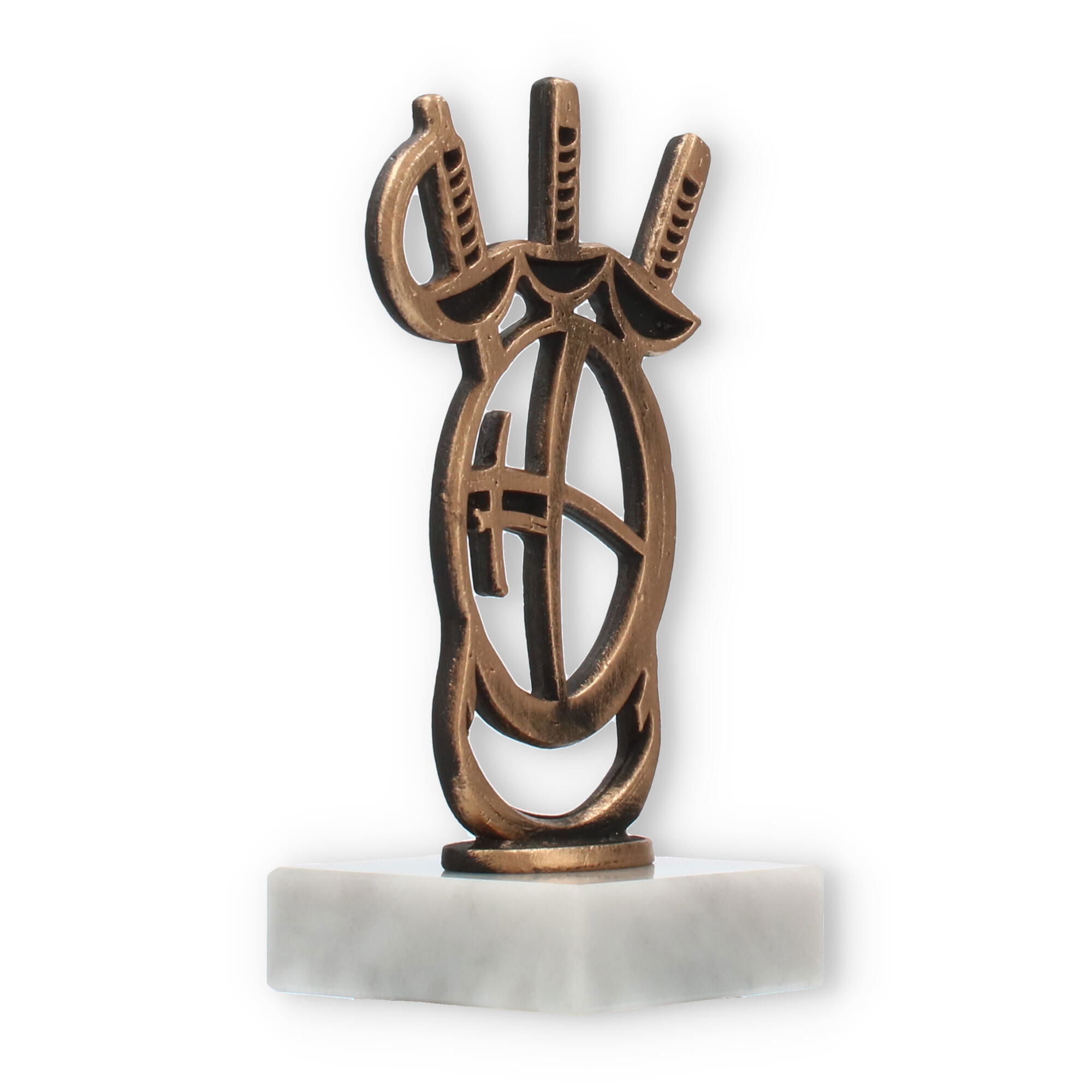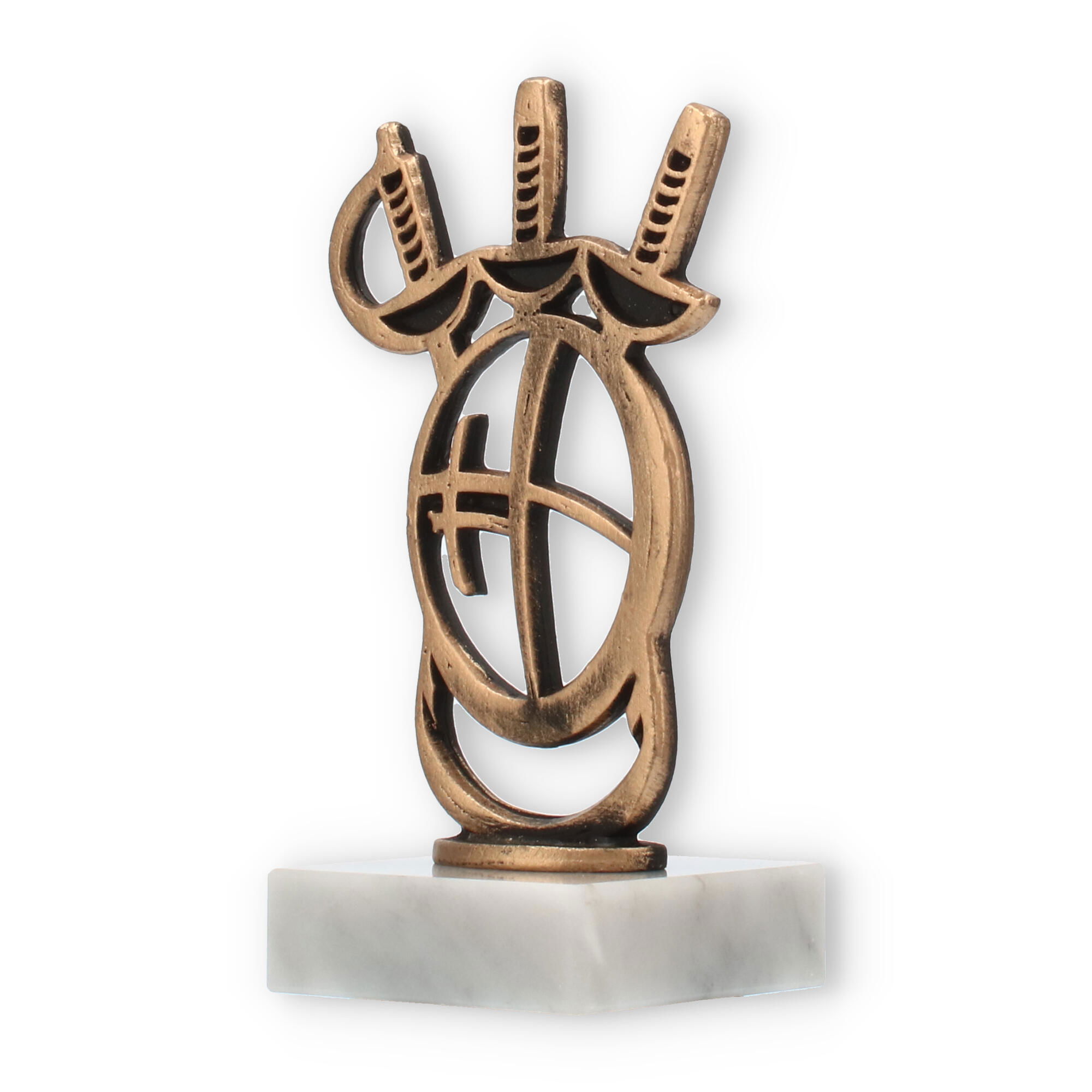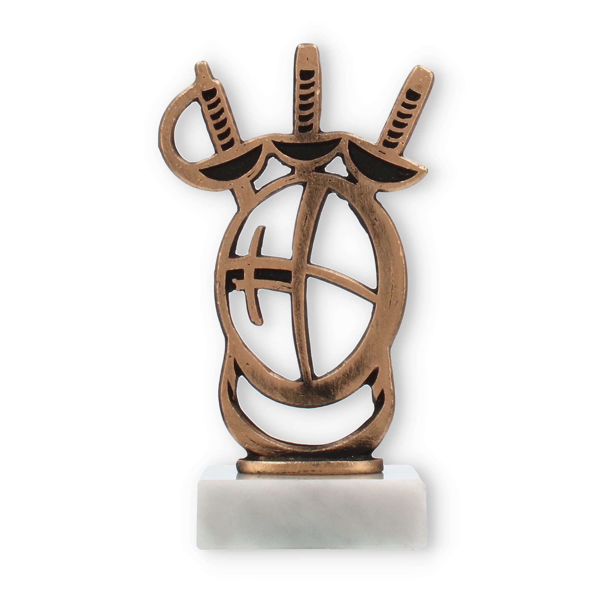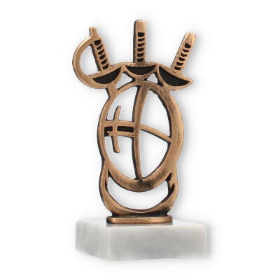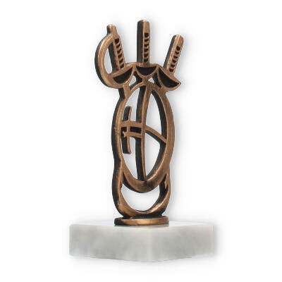 Considera el impacto que puede tener en un evento de esgrima o cualquier ceremonia de premiación. El diseño intrincado de su cuerpo metálico y su acabado en un color oro envejecido crea una presencia imponente. La base de mármol blanco añade un contraste visual que realza su aspecto refinado, listo para ser exhibido con orgullo.