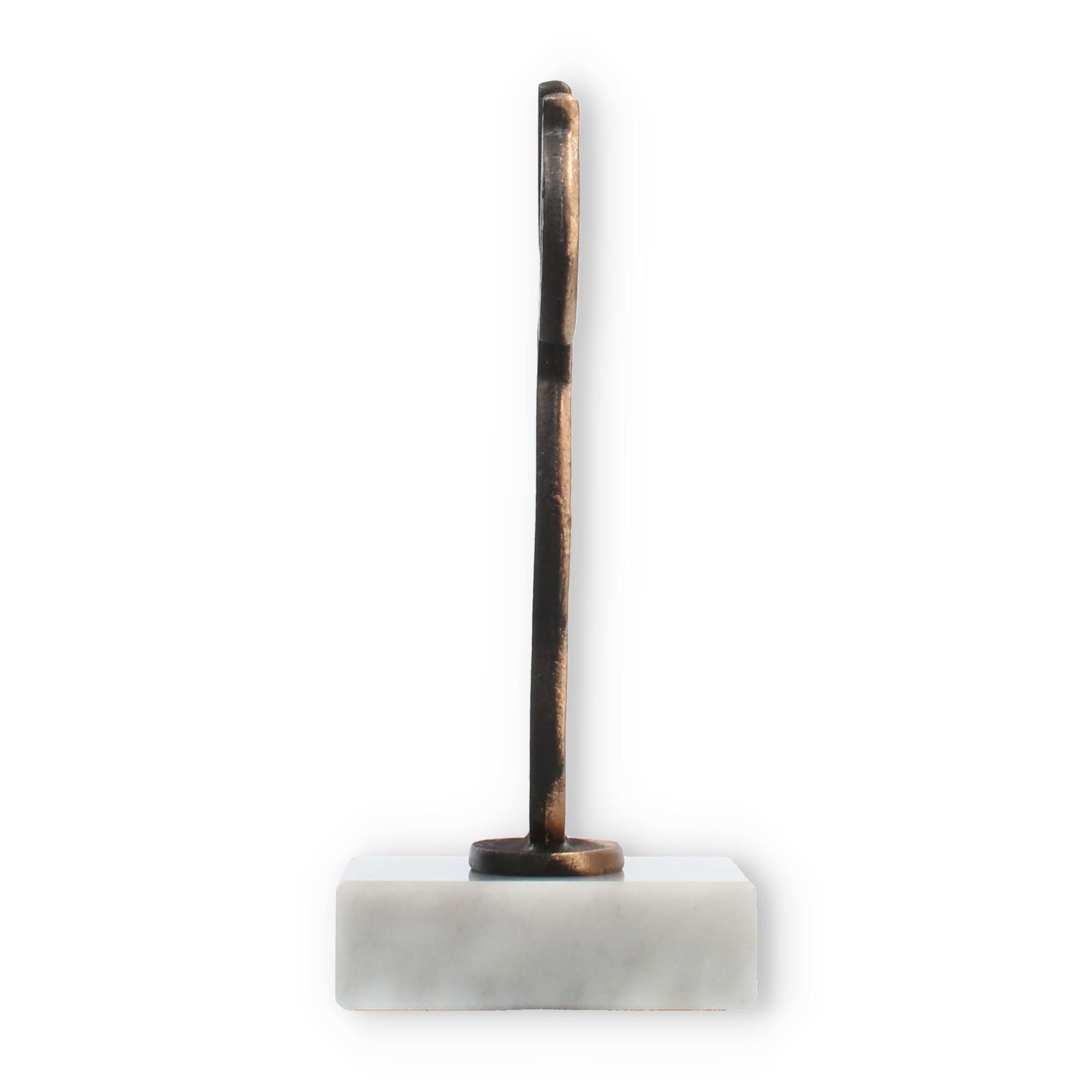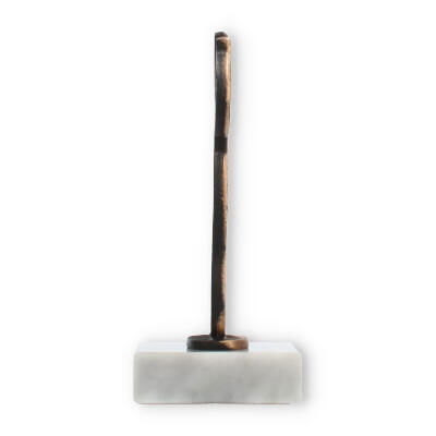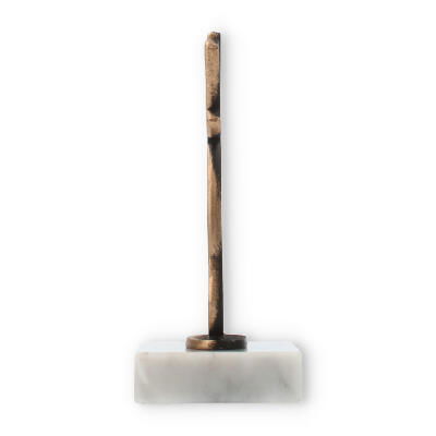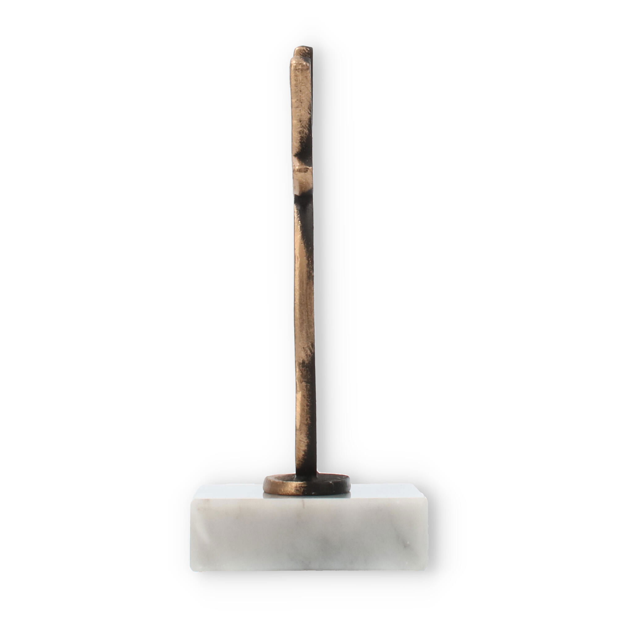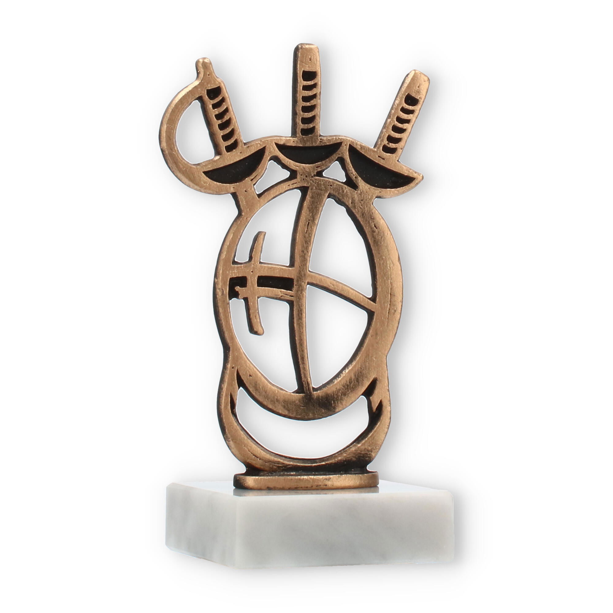 Considera el impacto que puede tener en un evento de esgrima o cualquier ceremonia de premiación. El diseño intrincado de su cuerpo metálico y su acabado en un color oro envejecido crea una presencia imponente. La base de mármol blanco añade un contraste visual que realza su aspecto refinado, listo para ser exhibido con orgullo.