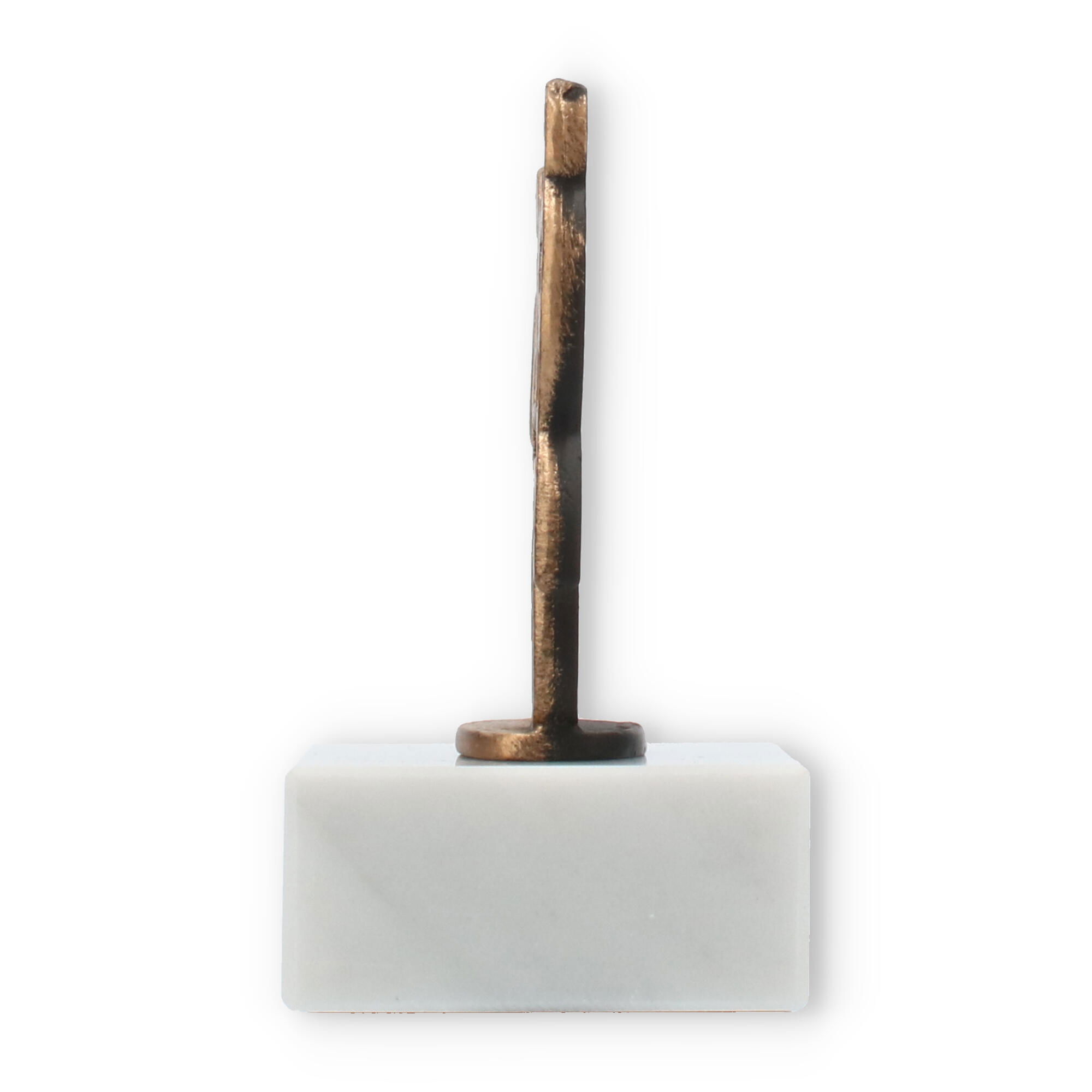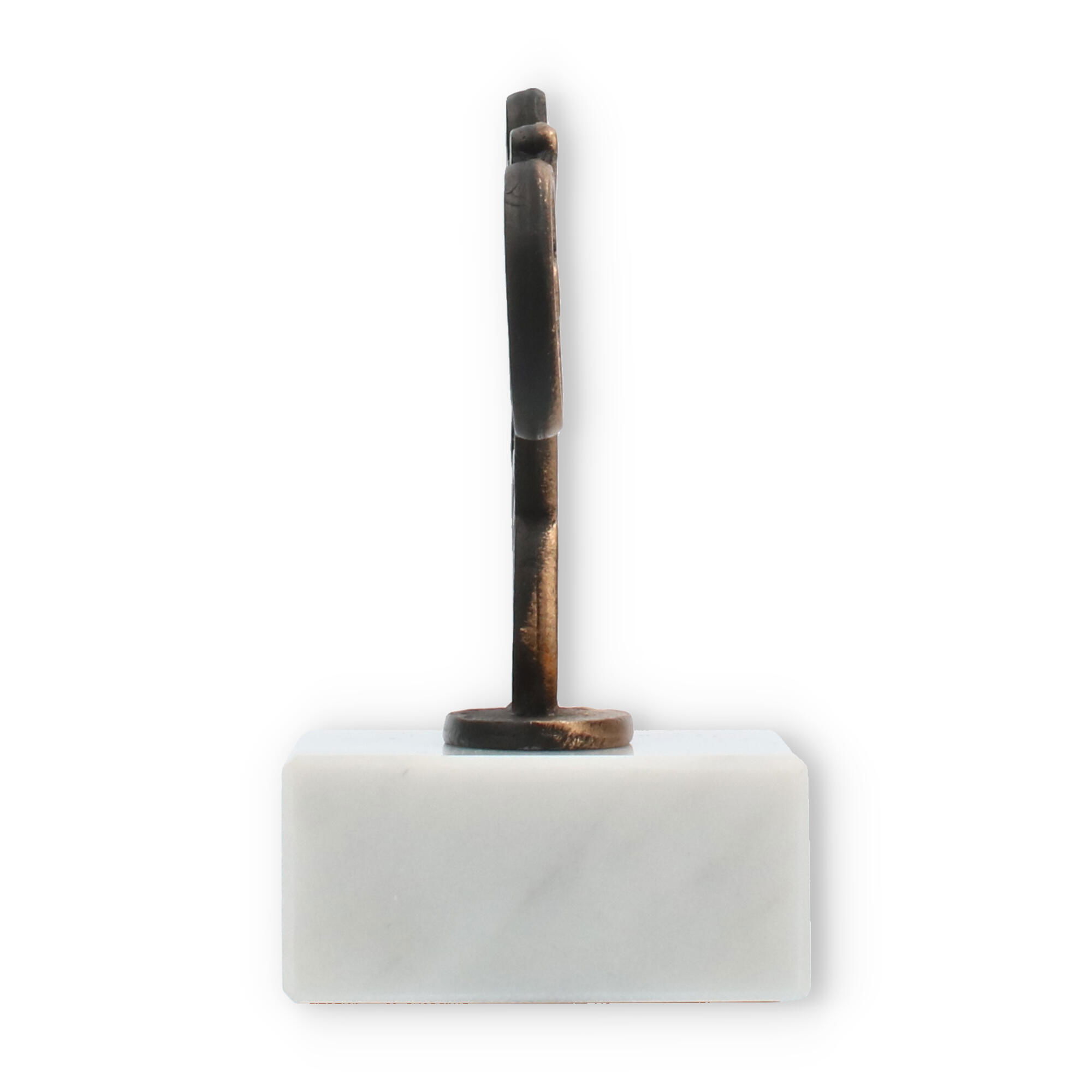 El mármol blanco de la base, con su superficie lisa, aporta un toque de sofisticación y estabilidad, mientras que el escudo dorado en el centro intensifica su presencia. Este trofeo no solo es un galardón; es un símbolo tangible de esfuerzo y éxito.