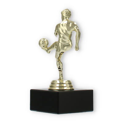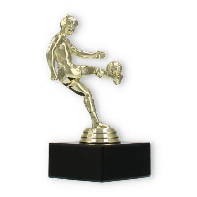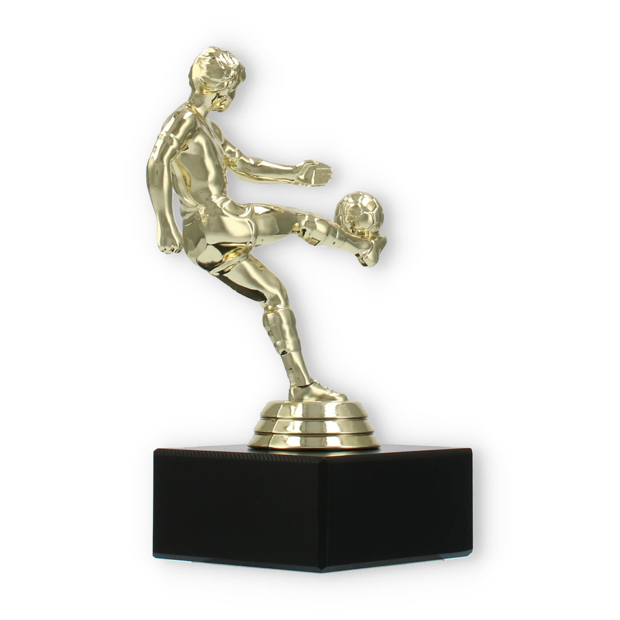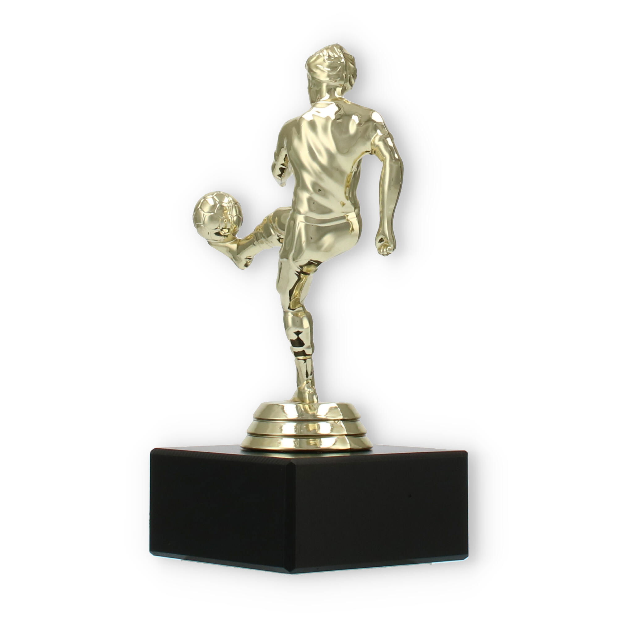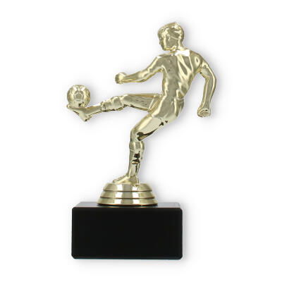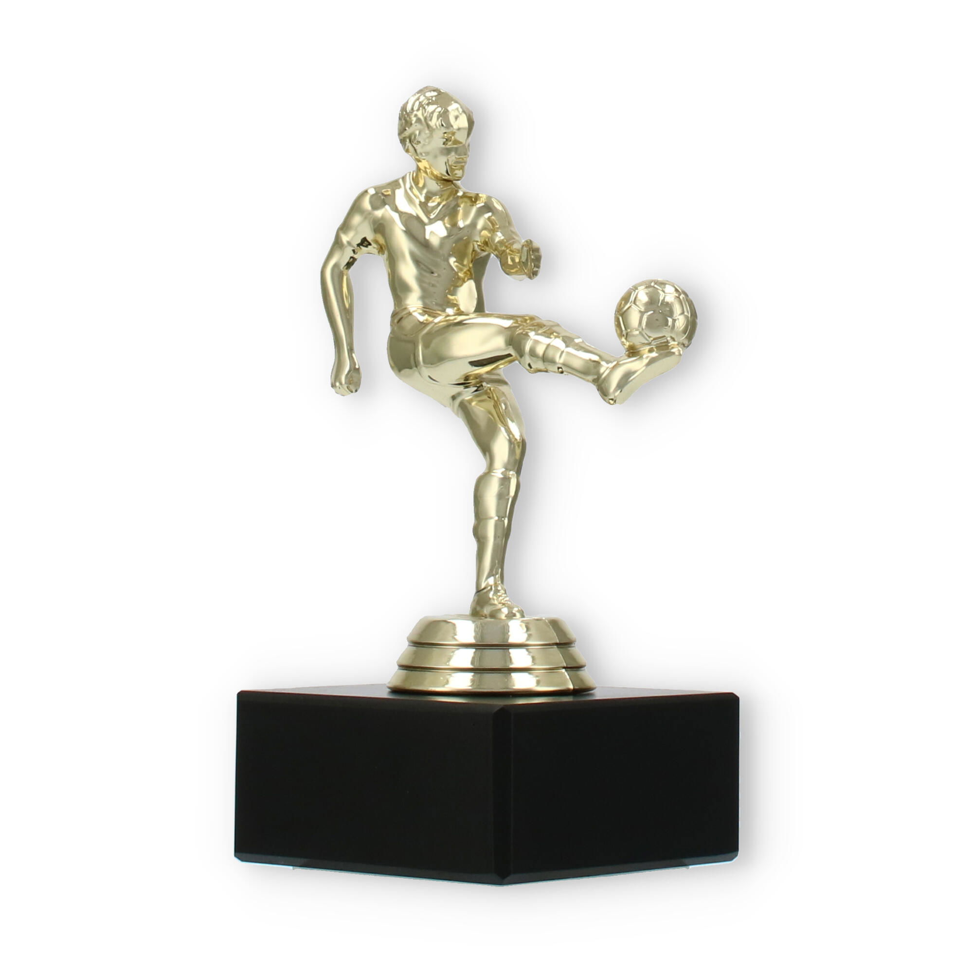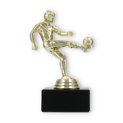 La robusta base de mármol negro complementa el aspecto general del trofeo, garantizando tanto durabilidad como estilo. El montaje de la figura dorada sobre esta sólida base no sólo realza su atractivo estético, sino que también proporciona una plataforma estable para su exposición. La armonía visual entre la figura y la base hace de este trofeo un objeto preciado para cualquier amante del fútbol.