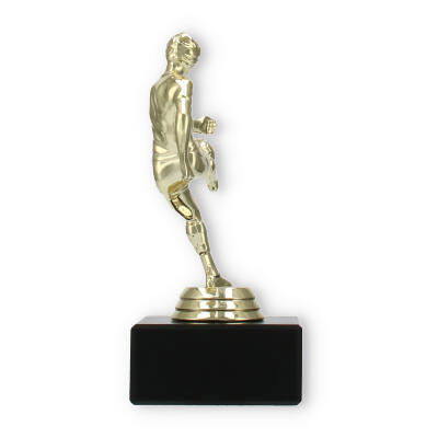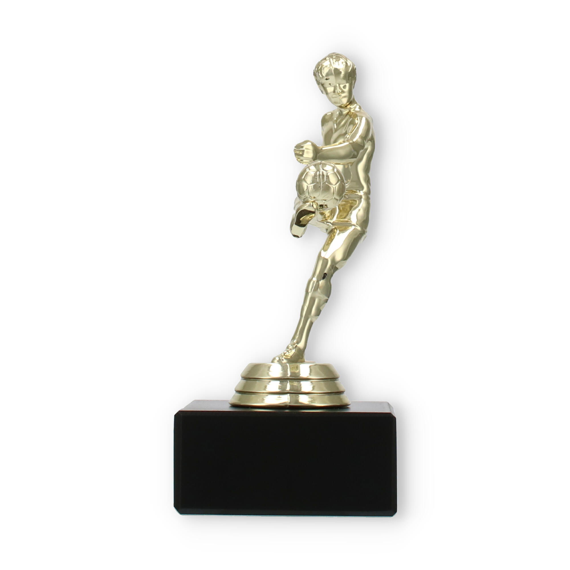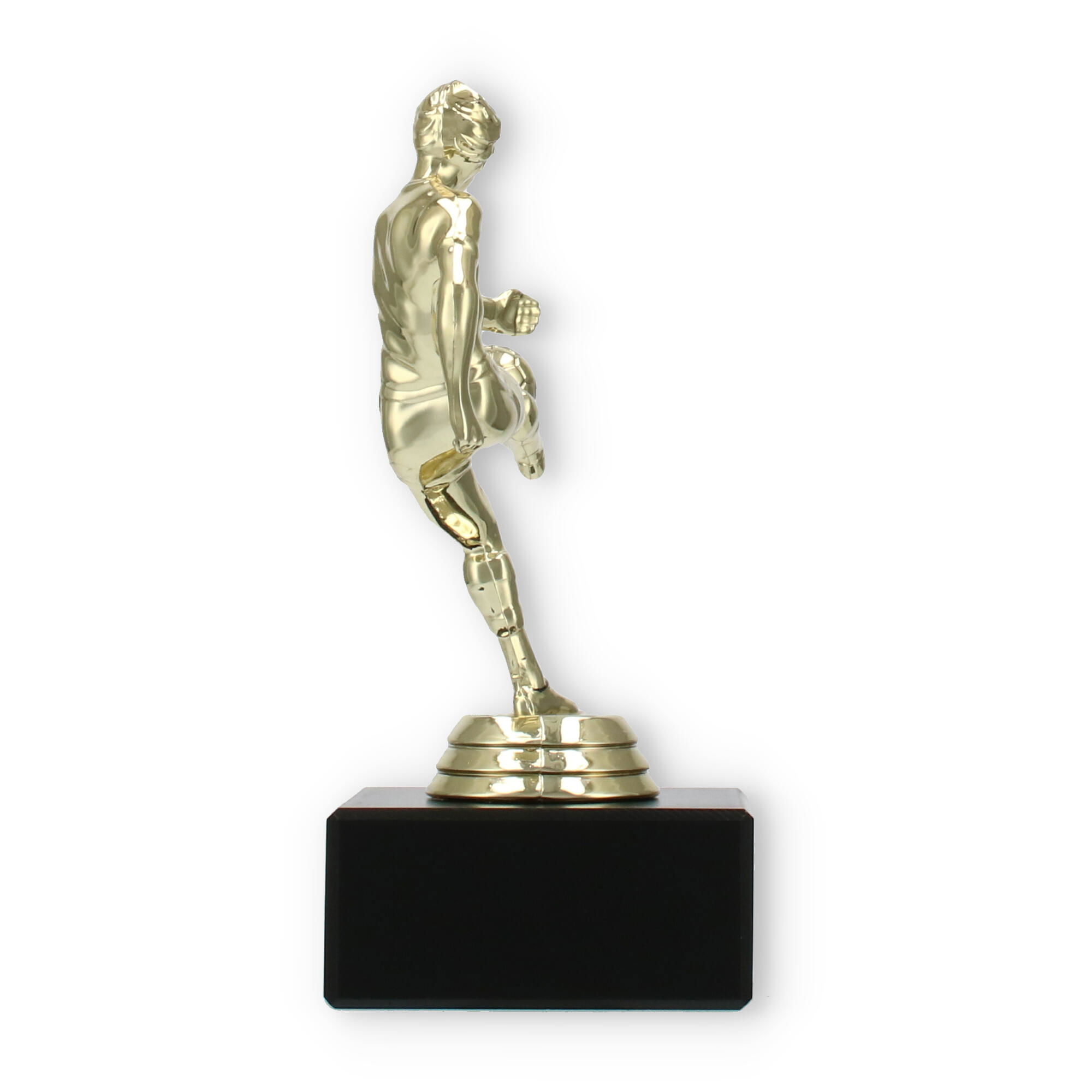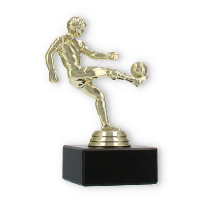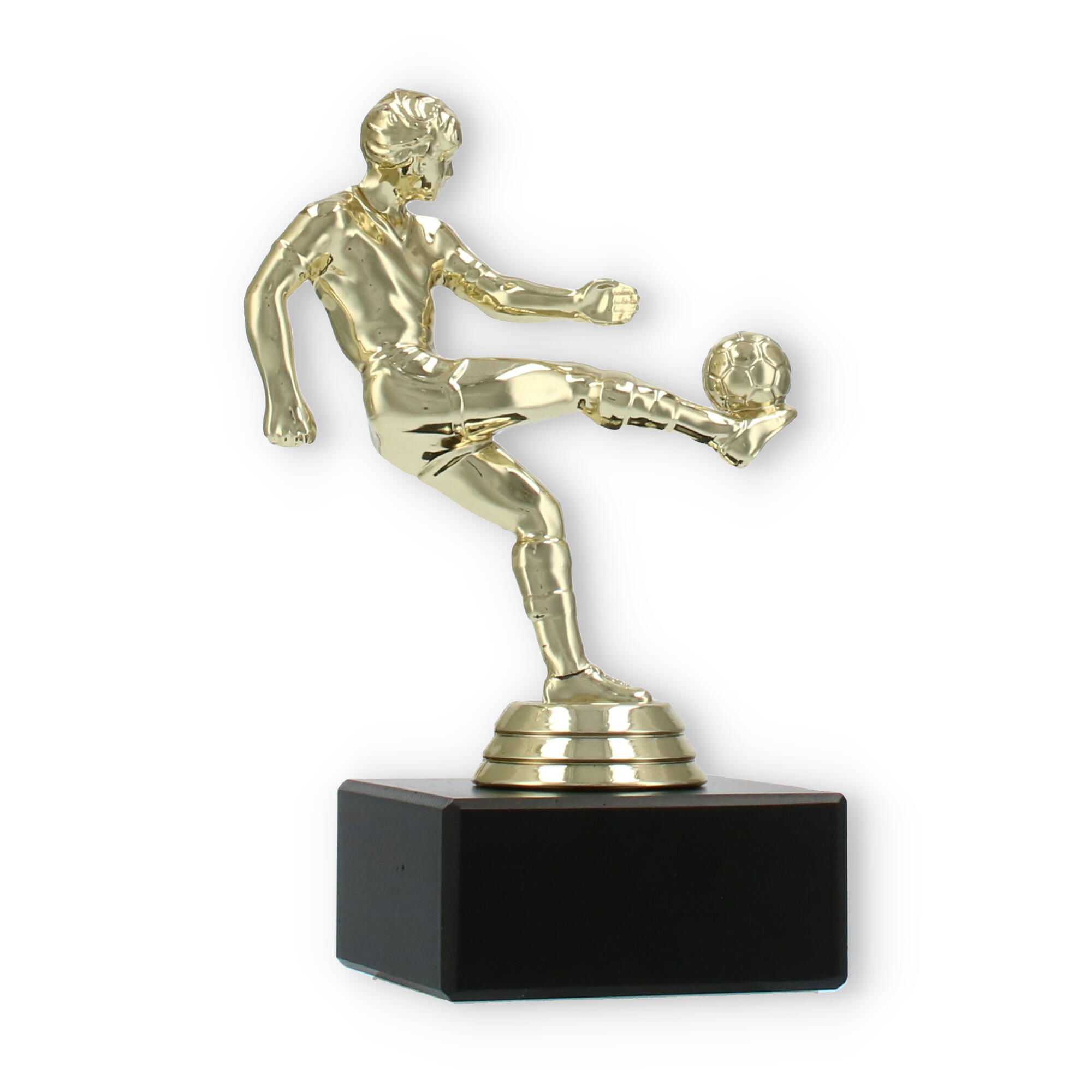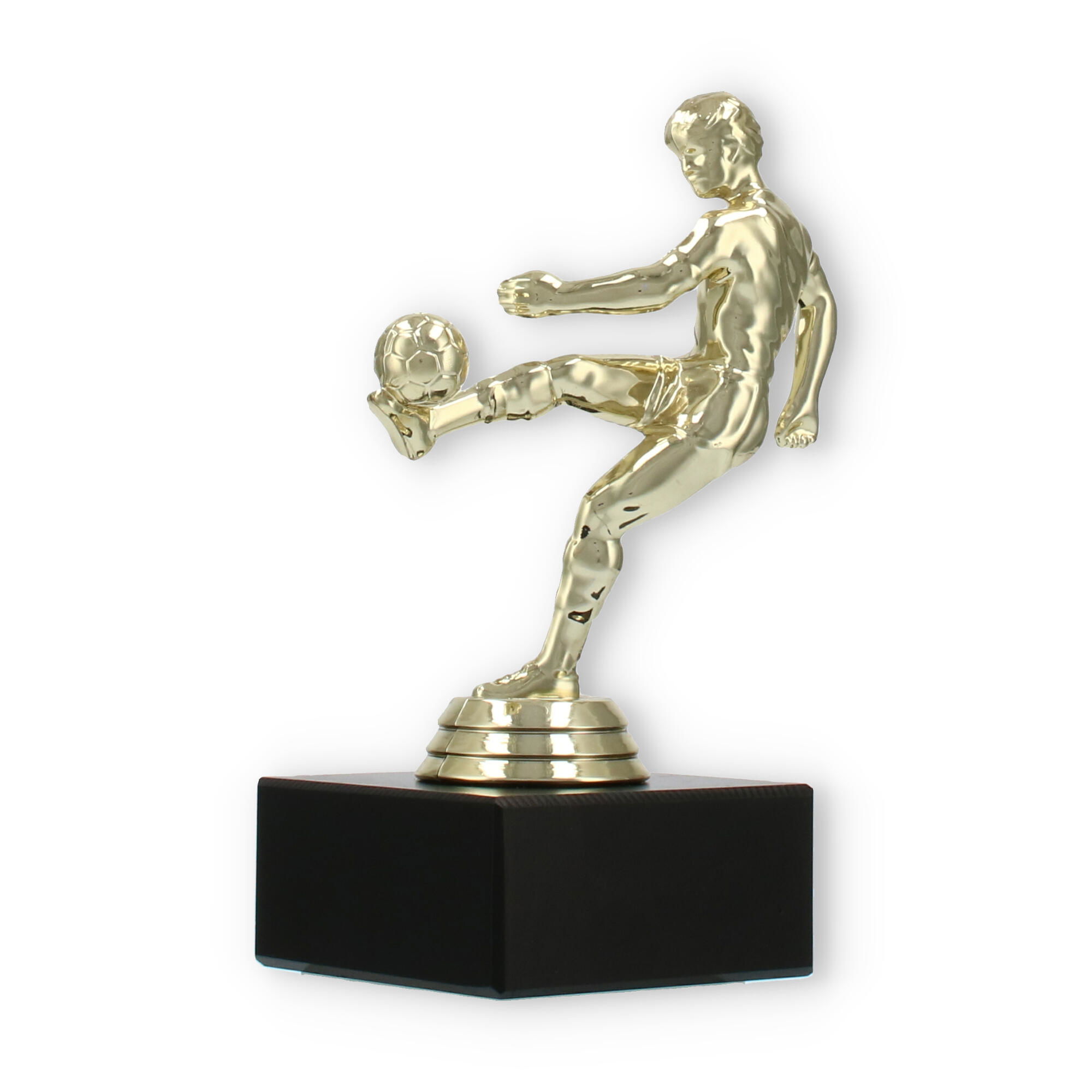 La robusta base de mármol negro complementa el aspecto general del trofeo, garantizando tanto durabilidad como estilo. El montaje de la figura dorada sobre esta sólida base no sólo realza su atractivo estético, sino que también proporciona una plataforma estable para su exposición. La armonía visual entre la figura y la base hace de este trofeo un objeto preciado para cualquier amante del fútbol.