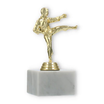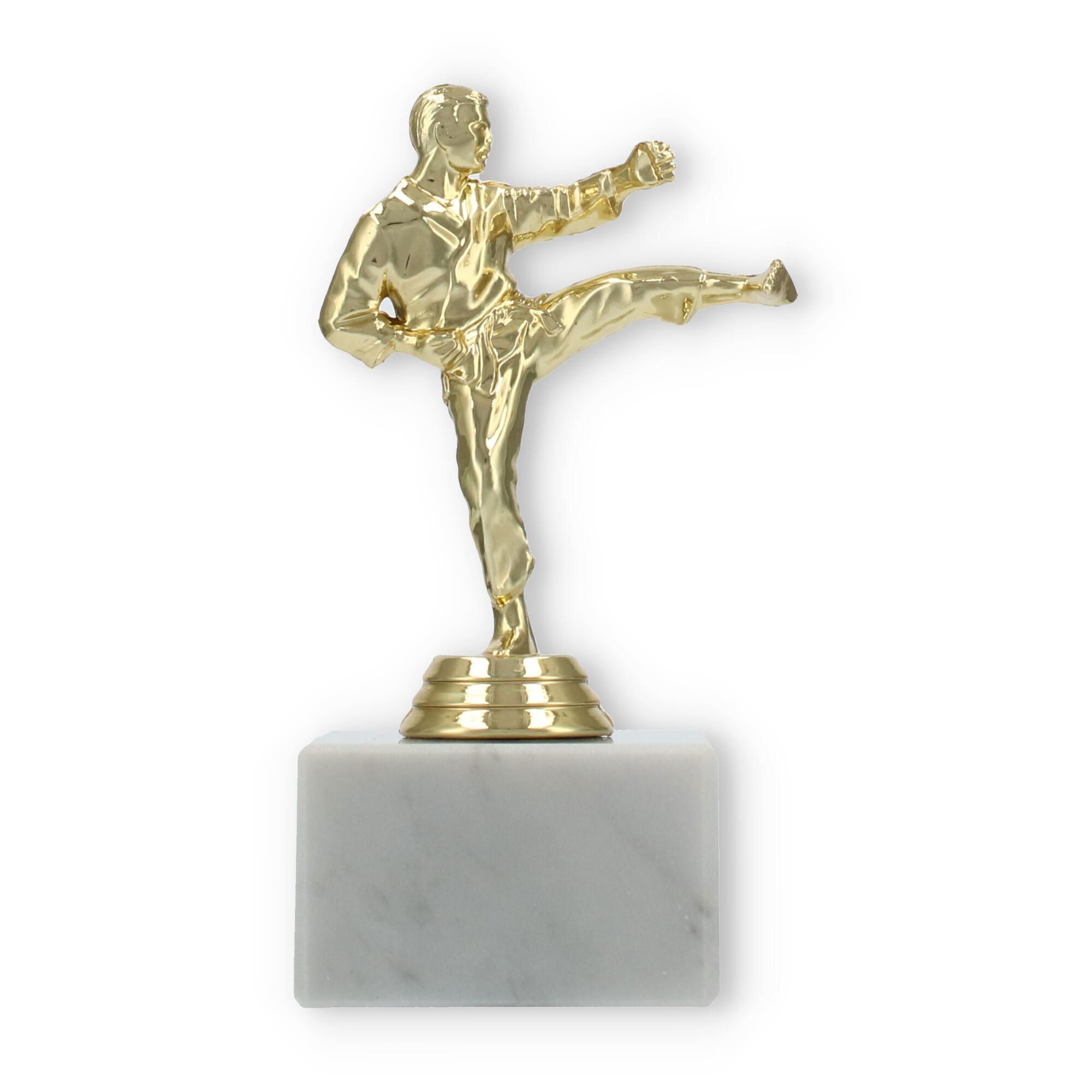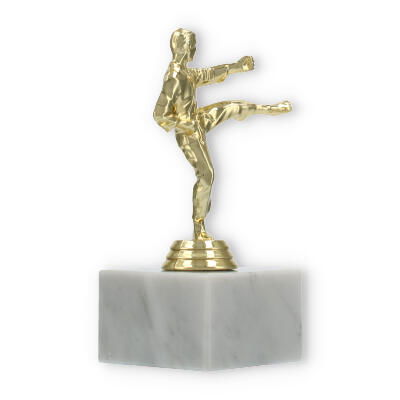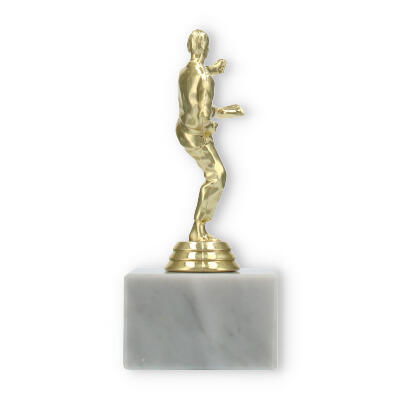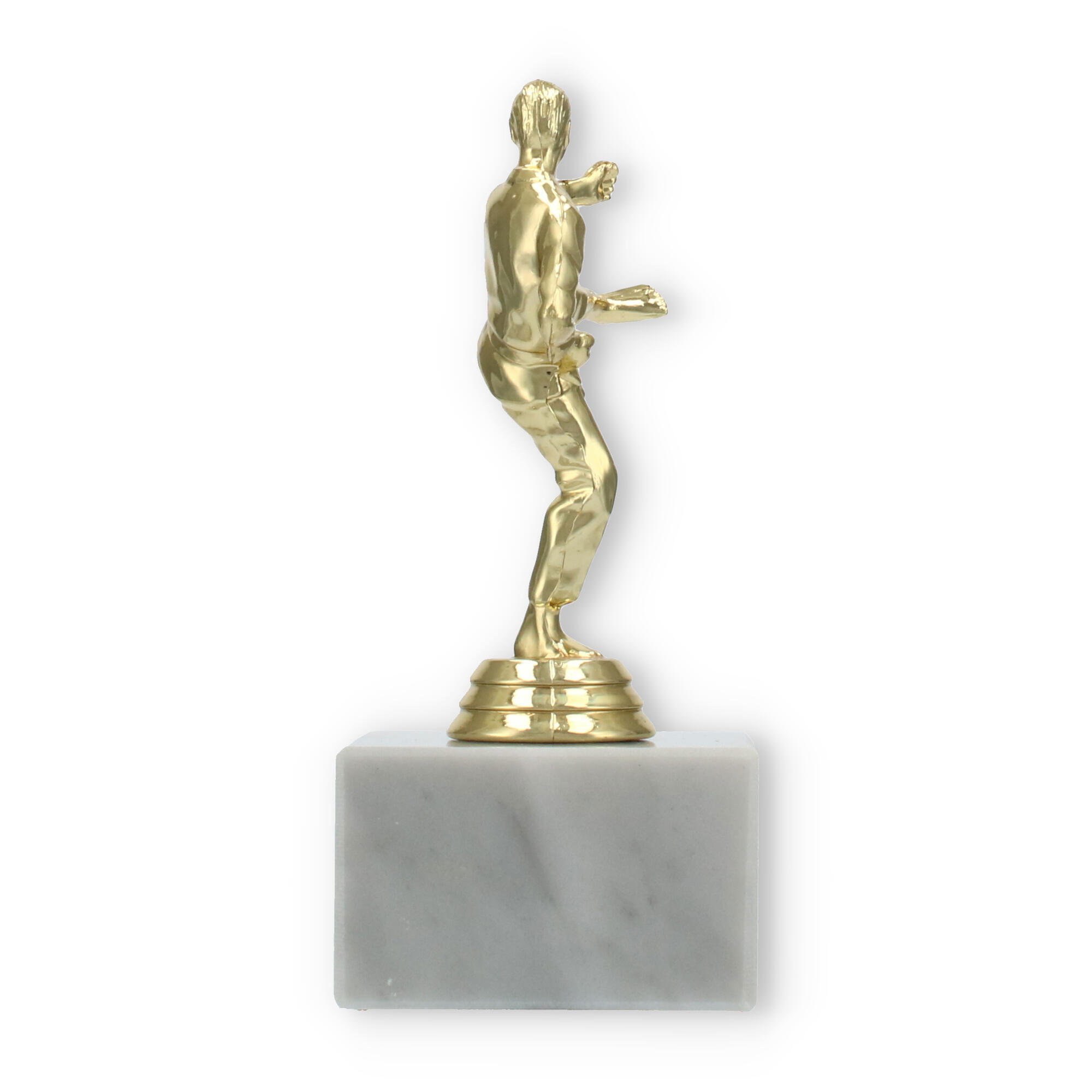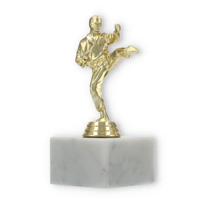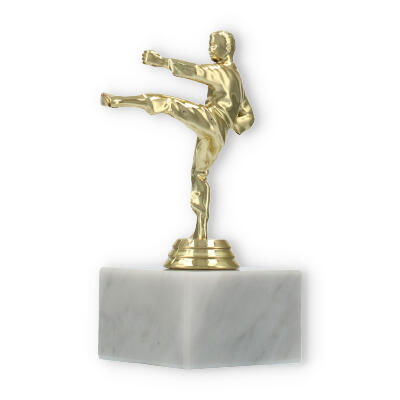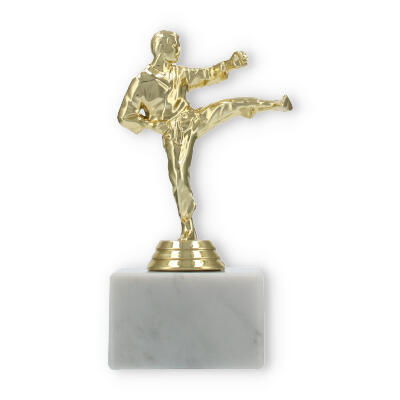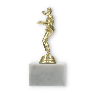 El trofeo Karate Masculino se presenta como un símbolo impactante de éxito y dedicación. Con su figura en color dorado, capturada en una dinámica pose de artes marciales sobre una robusta base de mármol blanco, este trofeo es un recuerdo especial para quien lo recibe.