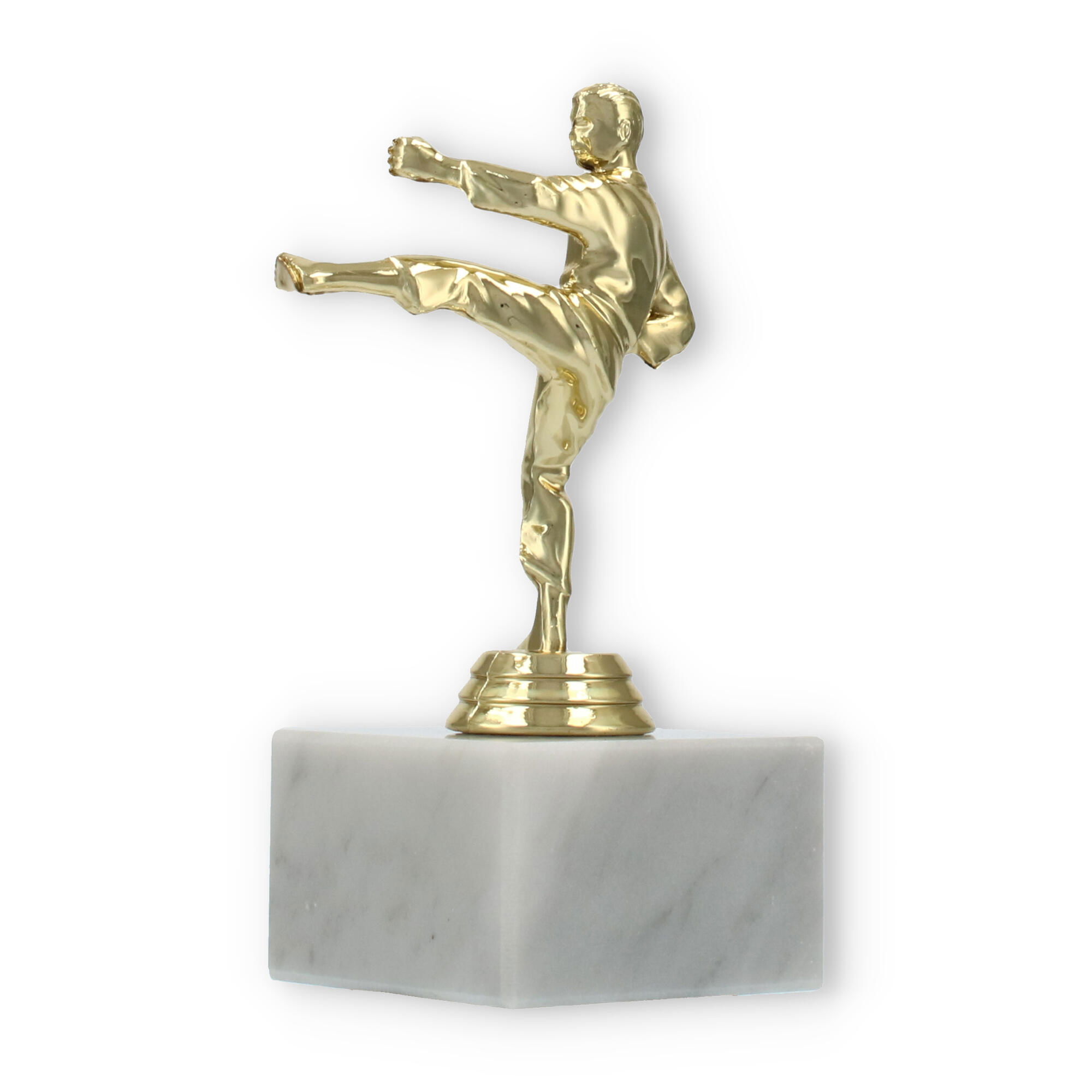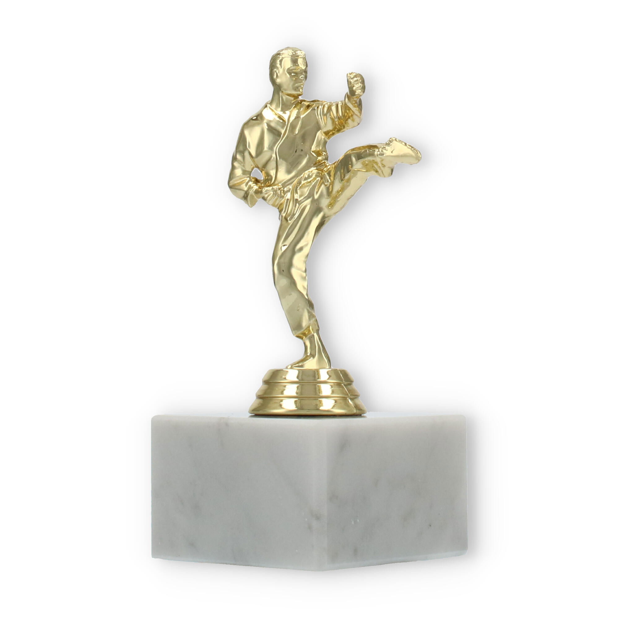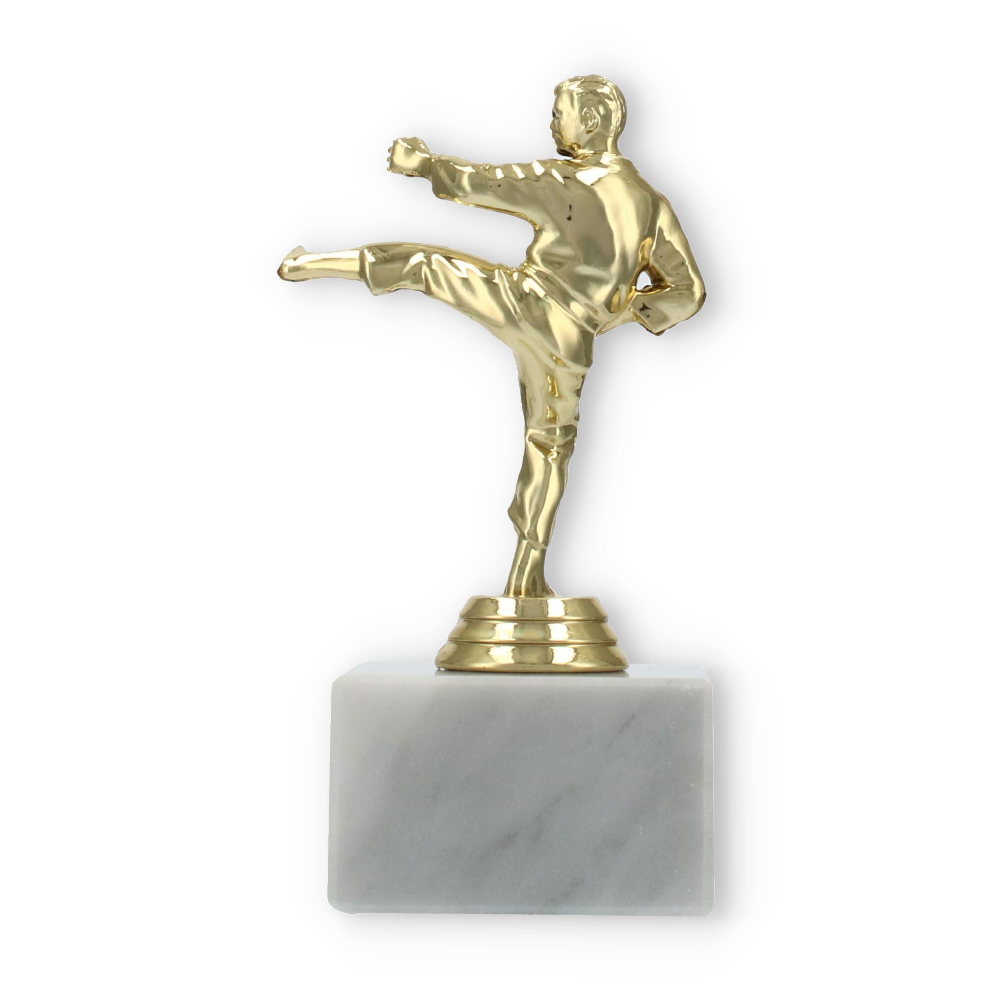 El trofeo Karate Masculino se presenta como un símbolo impactante de éxito y dedicación. Con su figura en color dorado, capturada en una dinámica pose de artes marciales sobre una robusta base de mármol blanco, este trofeo es un recuerdo especial para quien lo recibe.