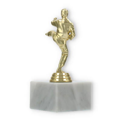 La base de mármol blanco proporciona una sensación de solidez y prestigio, complementando la figura y haciendo que el trofeo sea visualmente atractivo desde cualquier ángulo. La incorporación de un grabado personalizado añade un toque único, eternizando el logro en los corazones de los ganadores.